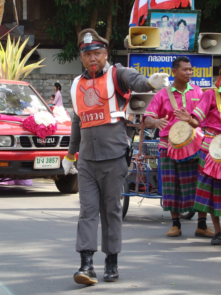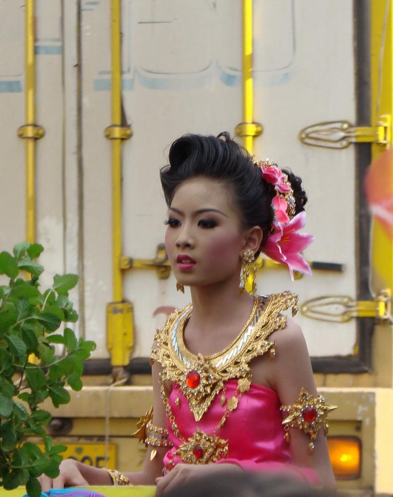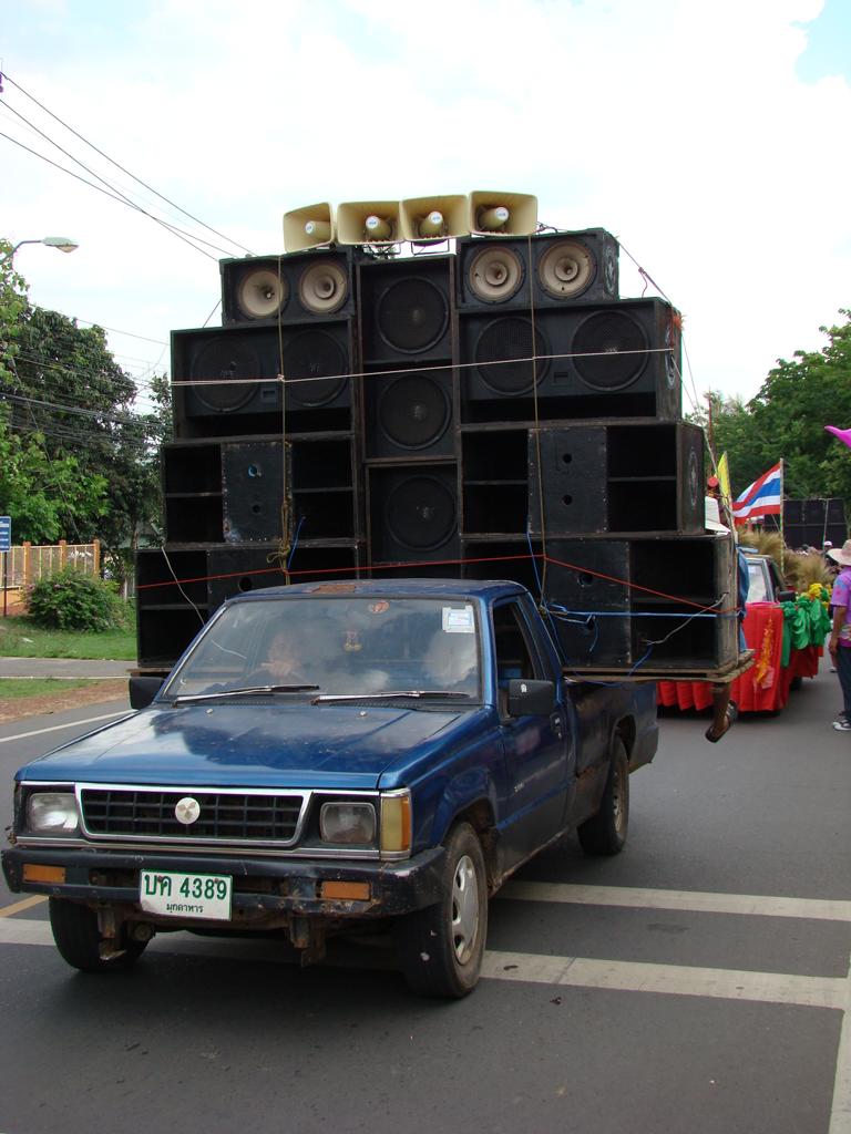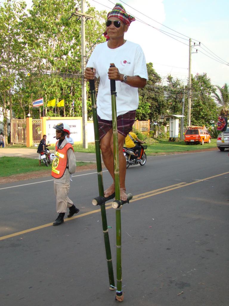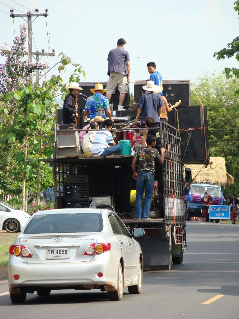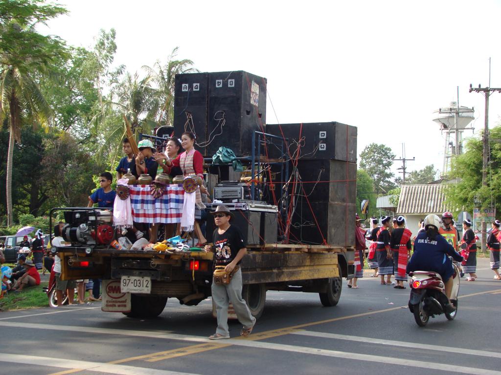 Obviously an important event – even the local mafia showed up … Offenbar eine wichtige Veranstaltung – sogar die örtliche Mafia zeigte sich …At that age … I would have been proud to be on one of those trucks. In dem Alter …Ich wäre stolz gewesen, auf einem Lastwagen mitfahren zu dürfen.What to say about this ‚beauty‘ …? It’s not like it might look on first sight … Was soll man zu der ‚Schönheit‘ sagen …? Es ist nicht so wie es auf den ersten Blick aussieht …The elderly women – presenting traditional farmer skills. Die älteren Frauen – bei der Präsentation von traditionellen Fähigkeiten.He tried to keep everyone on track. But hey, have you been to Thailand …? Then you know how difficult it is. Er versuchte, alles und jeden in der Spur zu halten. Aber hey, waren Sie schon mal in Thailand …? Dann ist klar, wie schwierig das ist.Another police officer. I wondered if he was exercising, dancing, waving, chasing insects away or just trying to regulate the traffic … Ein anderer Polizist. Ich habe mich gewundert, ob er sich fit halten wollte, tanzte, winkte, Insekten verscheuchte oder einfach versuchte, den Verkehr zu regeln.Are all police officers looking as friendly as him? I bet he would prefer to sit in his air-conditioned police box, have a beer, play cards, watch movies – and let life go on without him … Ob wohl alle Polizisten so freundlich aussehen wie er hier? Ich wette, er würde lieber mit einem Bier auf dem Tisch in seiner klimatisierten Wachbox sitzen, Karten spielen, einen Film gucken – und das Leben an ihm vorbeigehen lassen …A local ‚beauty‘. Difficult to read her mind … did she volunteer to take part in the parade? Did someone tell her to do so? Was she thinking about something? Eine der örtlichen ‚Schönheiten‘. Schwer zu erkennen, was in ihrem Kopf vorging … hatte sie sich freiwilig gemeldet um bei dem Umzug mitzulaufen? Hatte ihr jemand gesagt, daß sie mitgehen soll? Dachte sie über etwas nach?She appeared to be bored, tired or lost in thoughts … Sie schien gelangweilt, müde oder gedankenverloren zu sein …Her necklace (or choker) looked heavier than herself. But it is just made from light and thin brass. Ihr Halsschmuck sah schwerer aus als sie selbst. Aber er ist nur aus leichtem und dünnem Blech gefertigt.Another young woman – also lost in thoughts about … Eine andere junge Frau – auch mit ihren Gedanken beschäftigt …Wearing a local dress … and at least trying to smile a bit. Sie trug ortstypische Kleidung … und versuchte zumindest, etwas zu lächeln.One of many music trucks … Einer der vielen LKWs die für die Musik sorgten …The rolling „wall of bass“ ! Die rollende ‚Basswand‘ !What an adventure for the local youths … Was für ein Ereignis für die örtlichen Jugendlichen …It kind of reminded me on the German carnival parades … Der Umzug erinnerte mich etwas an deutsche Karnevalsumzüge …Bring you own band … Manche brachten ihre eigene Band mit …Made in Hannover? Who knows … Hergestellt in Hannover? Wer weiß …Good that I had my camera. Otherwise they would have asked me to join them … Gut, daß ich die Kamera in der Hand hatte. Ansonsten hätten sie mich bestimmt gefragt, ob ich nicht mitmachen möchte …A few of my students – presenting handmade, local clothes. Einige meiner Schüler. Sie trugen handgemachte, lokale Kleidung.She had fun with … coconuts and a piece of bamboo … Sie hatte ihren Spaß … mit Kokosnüssen und einem Stück Bambusrohr.I used to run on stilts when I was younger … but never on that level. Als ich jünger war, bin ich auch mal auf Stelzen gelaufen … aber nicht in der Höhe.Not a ‚running gag‘ – but a running band. Kein sich wiederholender Scherz – sondern eine freilaufende Band.Only children can look so excited … Nur Kinder können so erfreut und aufgeregt gucken …After more than 1 hour the parade came to an end … Nach über einer Stunde näherte sich der Umzug seinem Ende …Time to leave the scene. On several occasions in Thailand I ran into people who had at least 1 drink too much and felt like approaching me to either show off their poor English skills or pose for a photo. As soon as you turn too friendly, they will invite you to share more drinks and it becomes difficult to leave. A look at his trousers gave me the rest – I left. Es war an der Zeit, den Veranstaltungsort zu verlassen. Es kam öfter mal vor, daß ich Personen begegnete, die mindestens ein Glas zuviel hatten aber trotzdem auf mich zu kamen um entweder mit ihren schlechten Englischkenntnissen anzugeben oder für ein Foto zu posieren. Sobald man sich dann allzu freundlich gibt, folgen Einladungen zu weiteren Drinks und es wird immer schwieriger, sich loszueisen. Ein Blick auf seine Hose gab mir aber den Rest – ich bin gegangen.