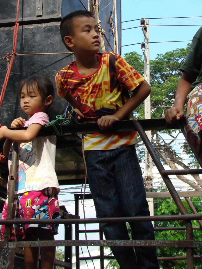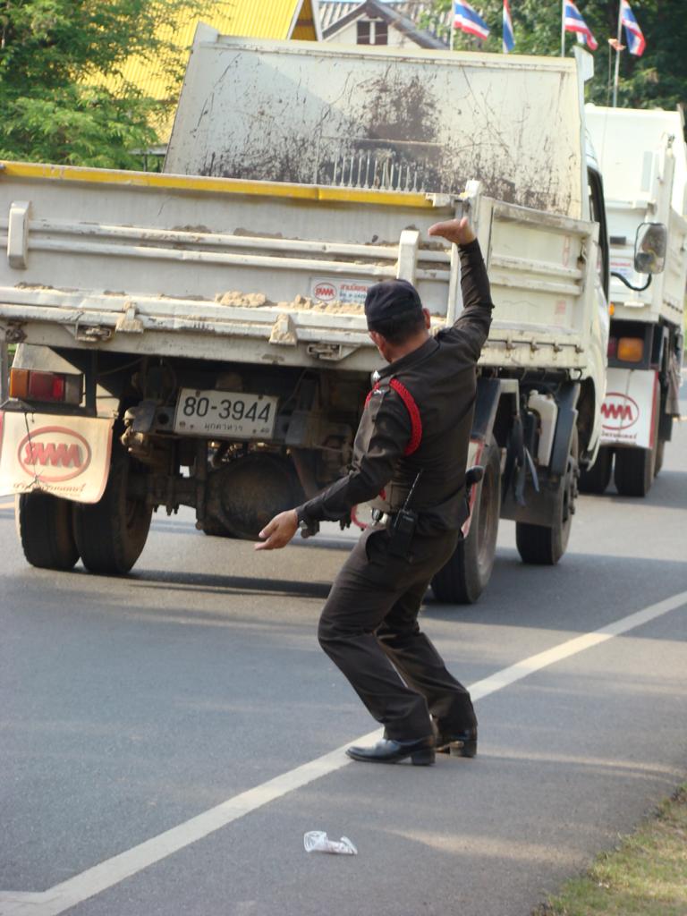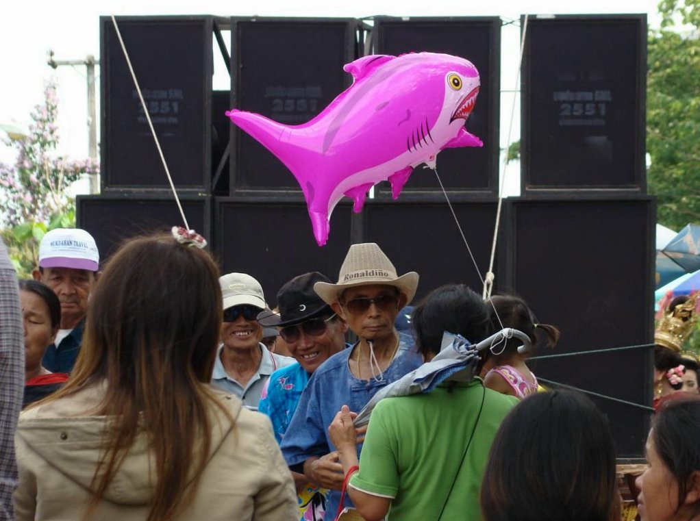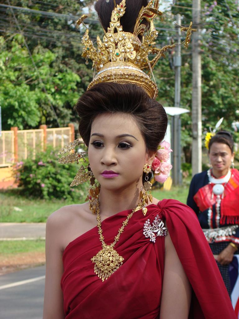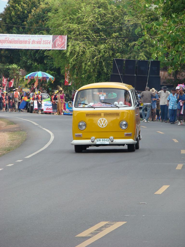 Obviously an important event – even the local mafia showed up … Offenbar eine wichtige Veranstaltung – sogar die örtliche Mafia zeigte sich …At that age … I would have been proud to be on one of those trucks. In dem Alter …Ich wäre stolz gewesen, auf einem Lastwagen mitfahren zu dürfen.What to say about this ‚beauty‘ …? It’s not like it might look on first sight … Was soll man zu der ‚Schönheit‘ sagen …? Es ist nicht so wie es auf den ersten Blick aussieht …The elderly women – presenting traditional farmer skills. Die älteren Frauen – bei der Präsentation von traditionellen Fähigkeiten.He tried to keep everyone on track. But hey, have you been to Thailand …? Then you know how difficult it is. Er versuchte, alles und jeden in der Spur zu halten. Aber hey, waren Sie schon mal in Thailand …? Dann ist klar, wie schwierig das ist.Another police officer. I wondered if he was exercising, dancing, waving, chasing insects away or just trying to regulate the traffic … Ein anderer Polizist. Ich habe mich gewundert, ob er sich fit halten wollte, tanzte, winkte, Insekten verscheuchte oder einfach versuchte, den Verkehr zu regeln.Are all police officers looking as friendly as him? I bet he would prefer to sit in his air-conditioned police box, have a beer, play cards, watch movies – and let life go on without him … Ob wohl alle Polizisten so freundlich aussehen wie er hier? Ich wette, er würde lieber mit einem Bier auf dem Tisch in seiner klimatisierten Wachbox sitzen, Karten spielen, einen Film gucken – und das Leben an ihm vorbeigehen lassen …A local ‚beauty‘. Difficult to read her mind … did she volunteer to take part in the parade? Did someone tell her to do so? Was she thinking about something? Eine der örtlichen ‚Schönheiten‘. Schwer zu erkennen, was in ihrem Kopf vorging … hatte sie sich freiwilig gemeldet um bei dem Umzug mitzulaufen? Hatte ihr jemand gesagt, daß sie mitgehen soll? Dachte sie über etwas nach?She appeared to be bored, tired or lost in thoughts … Sie schien gelangweilt, müde oder gedankenverloren zu sein …Her necklace (or choker) looked heavier than herself. But it is just made from light and thin brass. Ihr Halsschmuck sah schwerer aus als sie selbst. Aber er ist nur aus leichtem und dünnem Blech gefertigt.Another young woman – also lost in thoughts about … Eine andere junge Frau – auch mit ihren Gedanken beschäftigt …Wearing a local dress … and at least trying to smile a bit. Sie trug ortstypische Kleidung … und versuchte zumindest, etwas zu lächeln.One of many music trucks … Einer der vielen LKWs die für die Musik sorgten …The rolling „wall of bass“ ! Die rollende ‚Basswand‘ !What an adventure for the local youths … Was für ein Ereignis für die örtlichen Jugendlichen …It kind of reminded me on the German carnival parades … Der Umzug erinnerte mich etwas an deutsche Karnevalsumzüge …Bring you own band … Manche brachten ihre eigene Band mit …Made in Hannover? Who knows … Hergestellt in Hannover? Wer weiß …Good that I had my camera. Otherwise they would have asked me to join them … Gut, daß ich die Kamera in der Hand hatte. Ansonsten hätten sie mich bestimmt gefragt, ob ich nicht mitmachen möchte …A few of my students – presenting handmade, local clothes. Einige meiner Schüler. Sie trugen handgemachte, lokale Kleidung.She had fun with … coconuts and a piece of bamboo … Sie hatte ihren Spaß … mit Kokosnüssen und einem Stück Bambusrohr.I used to run on stilts when I was younger … but never on that level. Als ich jünger war, bin ich auch mal auf Stelzen gelaufen … aber nicht in der Höhe.Not a ‚running gag‘ – but a running band. Kein sich wiederholender Scherz – sondern eine freilaufende Band.Only children can look so excited … Nur Kinder können so erfreut und aufgeregt gucken …After more than 1 hour the parade came to an end … Nach über einer Stunde näherte sich der Umzug seinem Ende …Time to leave the scene. On several occasions in Thailand I ran into people who had at least 1 drink too much and felt like approaching me to either show off their poor English skills or pose for a photo. As soon as you turn too friendly, they will invite you to share more drinks and it becomes difficult to leave. A look at his trousers gave me the rest – I left. Es war an der Zeit, den Veranstaltungsort zu verlassen. Es kam öfter mal vor, daß ich Personen begegnete, die mindestens ein Glas zuviel hatten aber trotzdem auf mich zu kamen um entweder mit ihren schlechten Englischkenntnissen anzugeben oder für ein Foto zu posieren. Sobald man sich dann allzu freundlich gibt, folgen Einladungen zu weiteren Drinks und es wird immer schwieriger, sich loszueisen. Ein Blick auf seine Hose gab mir aber den Rest – ich bin gegangen.