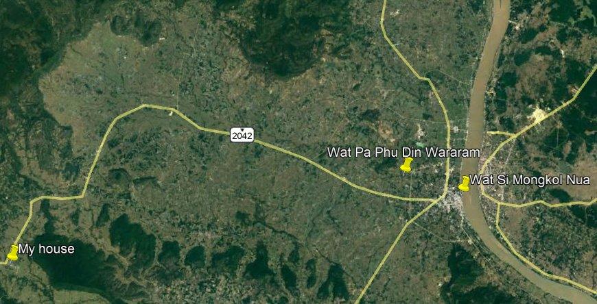 The road from my village to Mukdahan and the 2 temple locations. Verlauf der Straße von meinem Dorf nach Mukdahan und zwei Tempel Standorten.The bell tower of Wat Si Mongkol Nua. Der Glockenturm des Si Mongkol Nua Tempels.Hey, we are in Thailand! No ceremony without food … Aber hallo, wir waren in Thailand! Keine Feier ohne Essen …The 2 novices, dressed in white, already received their new robes. Die beiden Novizen, weiß gekleidet, haben bereits ihre neuen Roben entgegen genommen.Family members and friends brought several items for daily use and more robes … Familienmitglieder und Freunde hatten mehrere Dinge des täglichen Bedarfs und weitere Roben mitgebracht …It was at least difficult if not impossible to understand much of the ceremony but it was all about listeneing to the old monks, paying respect, maybe ask if they grant permission to become a monk … Es war zumindest schwer wenn nicht unmöglich, viel von der Zeremonie zu verstehen aber es ging darum, den alten Mönchen zuzuhören, Respekt zu bekunden oder um Erlaubnis für die Zeit als Mönch zu bitten …A closer look at the bell tower. Ein näherer Blick auf den Glockenturm.Family members and friends had to wait outside. Familenmitglieder und Freunde mussten draußen warten.A few more donations … Einige der Gaben …Then it was time for the novices to dress up like a monk. Dann war es für die Novizen an der Zeit, sich wie ein Mönch zu kleiden …Easier said than done … Leichter gesagt als getan ..From time to time I left the ceremony and walked around a bit … Manchmal habe ich die Feierlichkeiten zerlassen und bin etwas herumgelaufen …Back on time to see the end of the ceremony here. Paying respect to the older monks, probably promising to follow the Buddhist rules during their monkhood … Rechtzeitig zurück um das Ende der Feier zu erleben. Die jungen Männer bezeugten ihren Respekt den älteren Mönchen gegenüber und versprachen wahrscheinlich, sich den Regeln des Buddhismus zu unterwerfen.Everything fits perfectly … Alles saß perfekt …Listening carefully … Aufmerksames Zuhören …… because the old monk didn’t look like he was willing to tolerate any inattention. … weil der alte Mönch nicht so aussah als ob er irgendwelche Ablenkungen tolerieren würde.Maybe, he has been a seaman before he became a monk … Vielleicht ist er zur See gefahren bevor er Mönch wurde …Brandnew … Nagelneu …Observing everything here … Alles unter Kontrolle …It would have been useful today … „Sum Shine“ instead of „Sun Shine“ is a typical Thai-English mistake. Ja, ein Sonnenschirm wäre heute nützlich gewesen … „Sum Shine“ statt „Sun Shine“ ist einer dieser typisch thailändischen Fehler im Umgang mit Englisch.Even the ants had their kind of „ceremony“ … Sogar die Ameisen hatten ihre eigene „Zeremonie“ …… while the fly just gave a big … on it. … während diese Fliege einen großen … darauf gab.A group of novices listening to their „teacher“. Eine Gruppe von Novizen lauscht ihrem „Lehrer“.I was not the only one taking photos and suffering from the hot sun today. Ich war heute nicht der Einzige, der Fotos machte und unter der Hitze zu leiden hatte.Finally we drove off – to another, smaller temple (Wat Pa Phu Din Wararam) where 3 other monks were ready to welcome the 2 novices. Schließlich fuhren wir zu einem anderen, kleineren Tempel (Pa Phu Din Wararam) wo drei andere Mönche die Novizen begrüßten.The first time for the novices to be allowed to sit on the low stage together with other monks. Zum ersten Mal durften die Novizen zusammen mit anderen Mönchen auf dem leicht erhöhten, umlaufenden Podest sitzen.My home is my castle – their hut (kuti) will be their castle for a while … Mein Haus ist meine Burg – ihre Hütte (Kuti) wird jetzt für einige Zeit ihre Burg sein …Thai style foundation and snake protection … Thailändischen Fundament und Schutz vor Schlangen …Step in. Make yourself feel at home … Hereinspaiert. Fühlt euch wie zuhause …And here – obviously more things to learn … Und hier … offenbar gab es noch mehr Dinge, die die Neulinge zu lernen hatten …