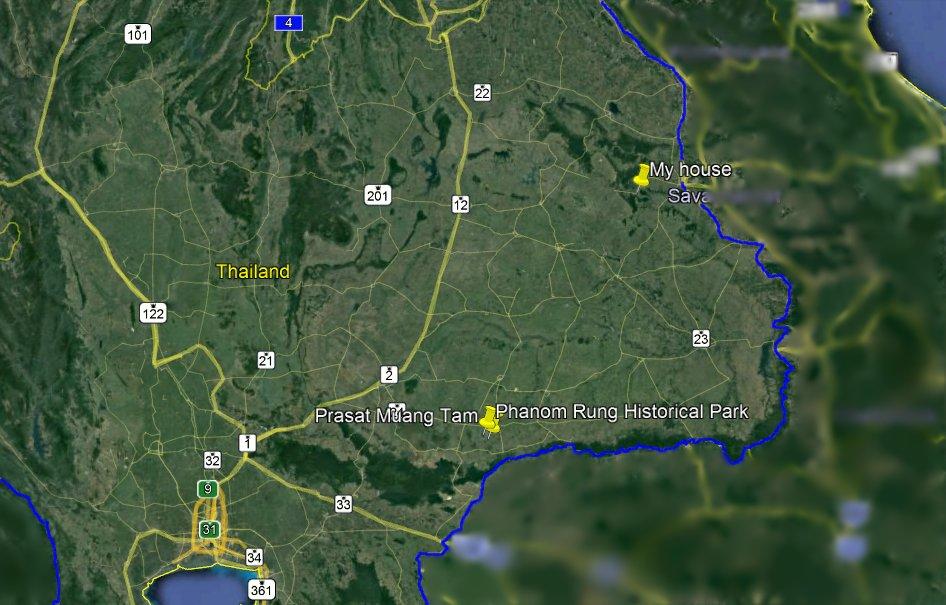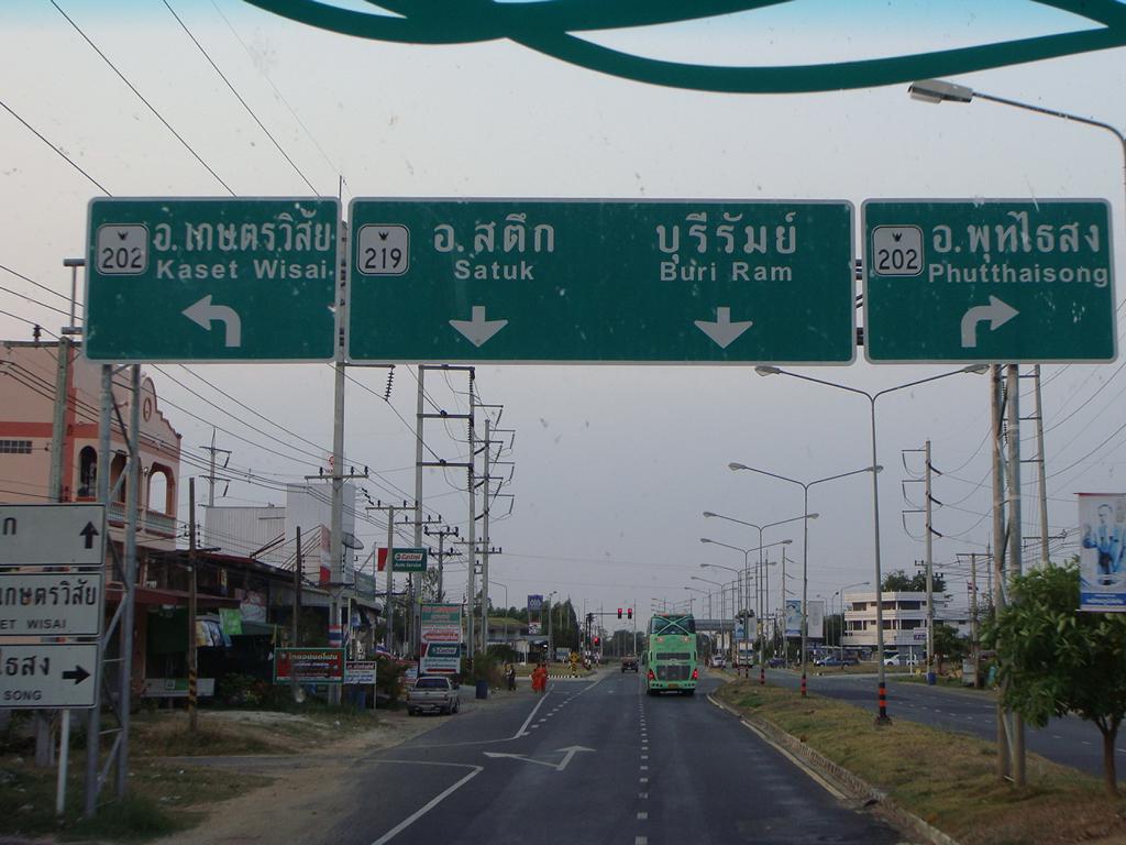 Wie man auf der unterstehenden Karte erkennen kann, gibt es zwischen Nong Sung und unserem Ziel in Buriram keine großen Schnellstraßen oder gar Autobahnen.