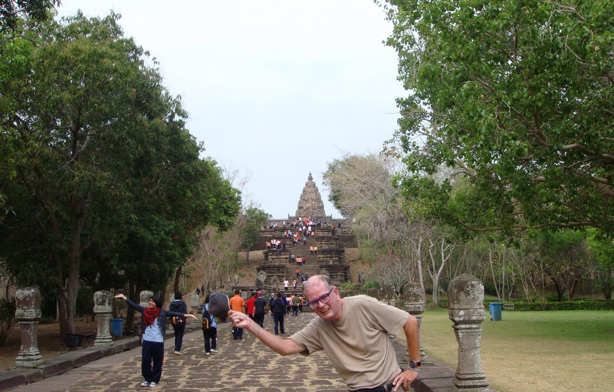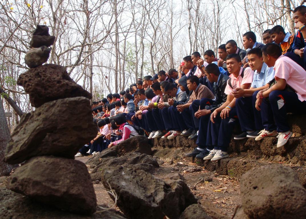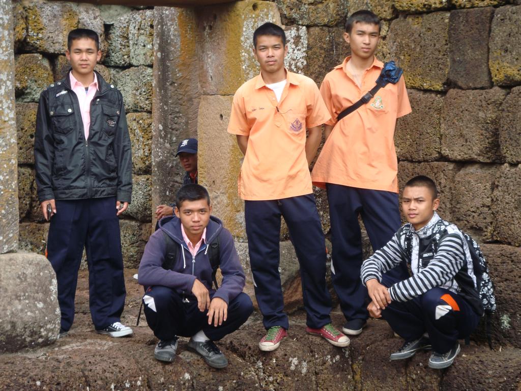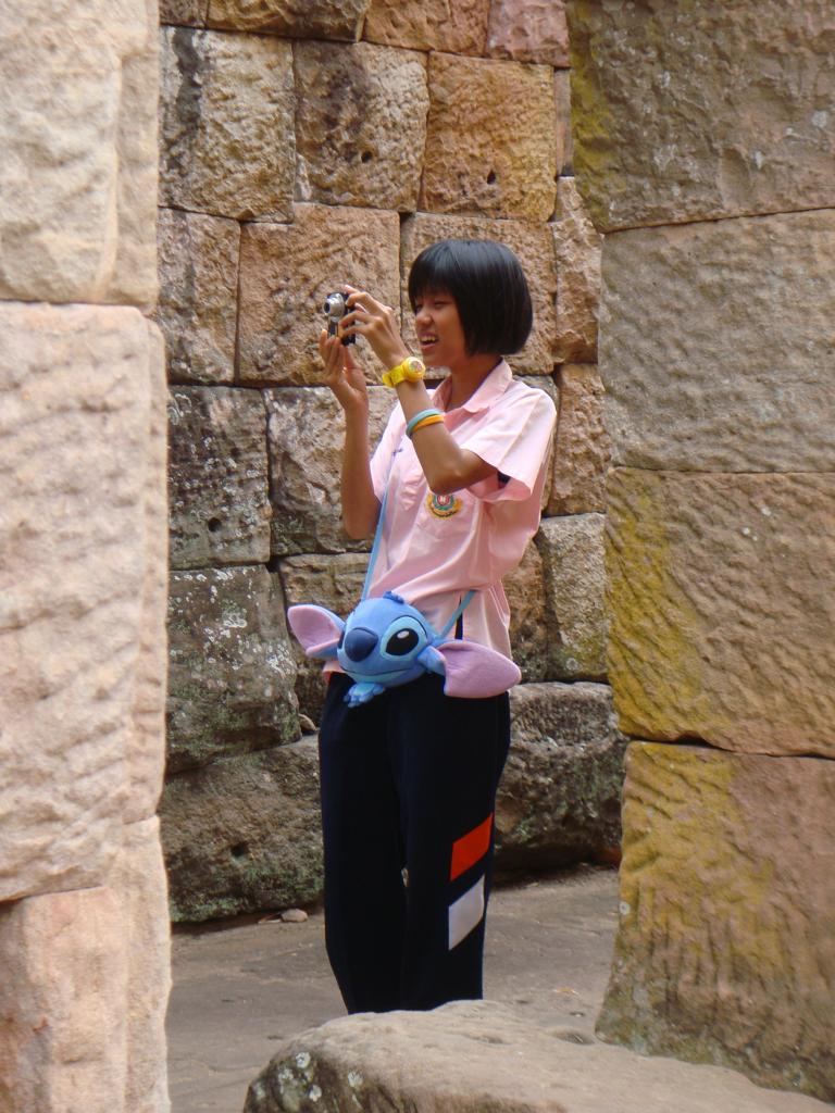Map overview … Überblick …It looked like early in the morning – and that’s what it was. Es sah aus wie früh am Morgen – und so war es ja auch.Stop at a gas station. Time to buy food, hit the restrooms and … Halt an einer Tankstelle. Zeit, etwas zu essen zu kaufen, die Toiletten aufzusuchen und …… take a nap. No, that bus didn’t belong to our group. … ein Schläfchen zu halten. Nein, der Bus gehörte nicht zu uns.Straight on … Immer weiter geradeaus …I’m sure that people on the busses were travelling more comfortably … Sicherlich hatten es die Passagiere in den Bussen etwas bequemer …Next stop. Everyone wanted to arrive at the destination … but it was good to see that the drivers were not rushing, not pushing, took their time to rest. Nächster Halt. Jeder wollte gerne schnell ankommen … aber es war beruhigend zu sehen, daß die Fahrer nicht nur fuhren sondern auch auf ihre Ruhezeiten achteten.This turn looked pretty well updated in terms of road safety: Warning signs, concrete barriers, red paint and rough surface on the lane leading downwards – but in the end Thailand was successful in its hard efforts to gain the top rank in the list of countries with the most traffic fatalities! Diese Kurve sah bezüglich der allgemeinen Verkehrssicherheit ziemlich gut aus: Warnschilder, Betonbarrieren, rote Farbe und ein aufgerauhter Fahrbanbelag auf der abwärts führenden Spur – aber letztendlich war Thailand in seinen Bemühungen, die Spitzenposition bei Verkehrstoten zu halten, wieder einmal erfolgreich!We arrived at the bus park where local vendors were unloading and preparing their goods … Wir kamen am Busparkplatz an und sahen, wie örtliche Händler ihre Waren abluden und zum Verkauf vorbereiteten …Listening to first instructions … Es gab erste Anweisungen …Obviously not everybody was really interested … Offenbar war nicht jeder daran interessiert …Eyes to the left … Augen nach links …… or to the right? … oder doch nach rechts?I think, I missed a new trend in fashion … Ich glaube, diesen Modetrend habe ich verpasst …Crochet appeared to be quite popular amongst male students … This one here tries to put another stone on top of a small pyramid. A cairn is a human-made pile of stones. In modern times, cairns are often erected as landmarks. But they have also been built and used as burial monuments; for defense and hunting; for ceremonial purposes, sometimes relating to astronomy; to locate buried items, such as caches of food or objects; and to mark trails, among other purposes. Despite that – in Thailand it’s regarded as a sign of good luck if the top stone doesn’t fall off. Häkeln schien unter den männlichen Schülern ziemlich populär zu sein … Dieser hier versuchte gerade, einen kleinen Stein auf die Spitze einer Steinpyramide zu setzen. Ein Steinhaufen besteht einfach aus von Menschenhand aufgeschichteten Steinen und wird heute überwiegend als Wegzeichen errichtet. Aber sie sind auch als Grabzeichen gesetzt worden; zur Verteidigung und Jagd; zu feierlichen Anlässen; im Zusammenhang mit Astronomie; um vergrabene Gegenstände wie Boxen für Nahrung oder Werkzeuge aufzufinden und um Wege zu markieren. Daneben gilt es in Thailand als Zeichen von Glück, wenn der oberste Stein nicht wieder herunterfällt.Prasat Hin Phanom Rung is a Khmer temple complex, built on the rim of an extinct volcano. It has been built of sandstone and laterite between the 10th and 13th century. Thailand’s Department of Fine Arts spent 17 years restoring the complex to its original condition. In May 1988, the park was officially opened by Princess Maha Chakri Sirindhorn and in 2005 the temple was submitted to UNESCO for consideration as a future World Heritage Site. Prasat Hin Phanom Rung ist ein Tempelkomplex der Khmer, erbaut auf dem Rand eines erloschenen Vulkans. Hergestellt zwischen dem zehnten und dreizehnten Jahrhundert aus Sandstein und Laterit. Mitarbeiter des thailändischen Ministeriums für bildende Künste verbrachten 17 Jahre damit, den Komplex in seinen ursprünglichen Zustand zu bringen. Im Mai 1988 wurde der Park von Prinzessin Maha Chakri Sirindhorn offiziel eröfffnet und 2005 wurde die Anlage der UNESCO mit dem Hintergrund vorgestellt, sie in Zukunft als Weltkulturerbe anzuerkennen.After listening to a few lessons in history about the place, students were free to make their own way around … Erst gab es einige Vorträge zur Geschichte der Anlage, dann durften sich die Schüler ohne Aufsicht umsehen …What am I looking at here …? Is it a door or a window? Was kann man hier erkennen? Eine Tür oder doch eher ein Fenster?Probably a door – because the former window openings looked different. They were equipped with small pillars to ensure a proper ventilation and keep unwanted animals outside … Wahrscheinlich eine Tür – weil die alten Fensteröffnungen doch noch anders aussahen. Sie waren mit kleinen Säulen versehen, die für eine gute Belüftung sorgen und unerwünschte Tiere fernhalten sollten …Pushing at least 200 litres of water on a grass surface – not an easy job! Mal eben mindestens 200 Liter Wasser über den Rasen schieben – keine einfache Aufgabe!The best place to take off the cap and show the bald melon … Der beste Ort um das Cap abzunehmen und die kahle Melone zu zeigen …The teacher and the gang … Die Lehrerin und die Gang …Common picture today: Many students asked for photos with friends or a teacher. So – as soon as one person volunteered to be the photographer – other students gave him resp. her the camera, ran back to their group of friends before screaming: „My camera, too.“ or „Wait, one more with my camera“. Heute ein oft gesehenes Bild: Viele Schüler wollten gerne Fotos mit ihren Freunden oder einem Lehrer haben. Sie fragten jemanden und sobald sich jemand dieser Aufgabe angenommen hatte, wurde diese Person mit den Kameras anderer Schüler behängt. Dann liefen die Sch