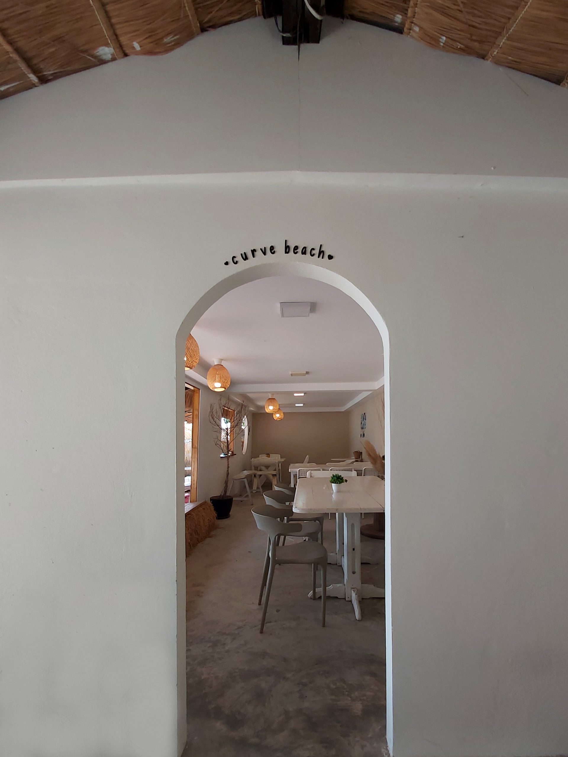 The ‚Curve Beach Cafe‘ itself is located at the end of a small road and the nondescript entrance doesn’t look really inviting. It’s just a long, rectangle box.