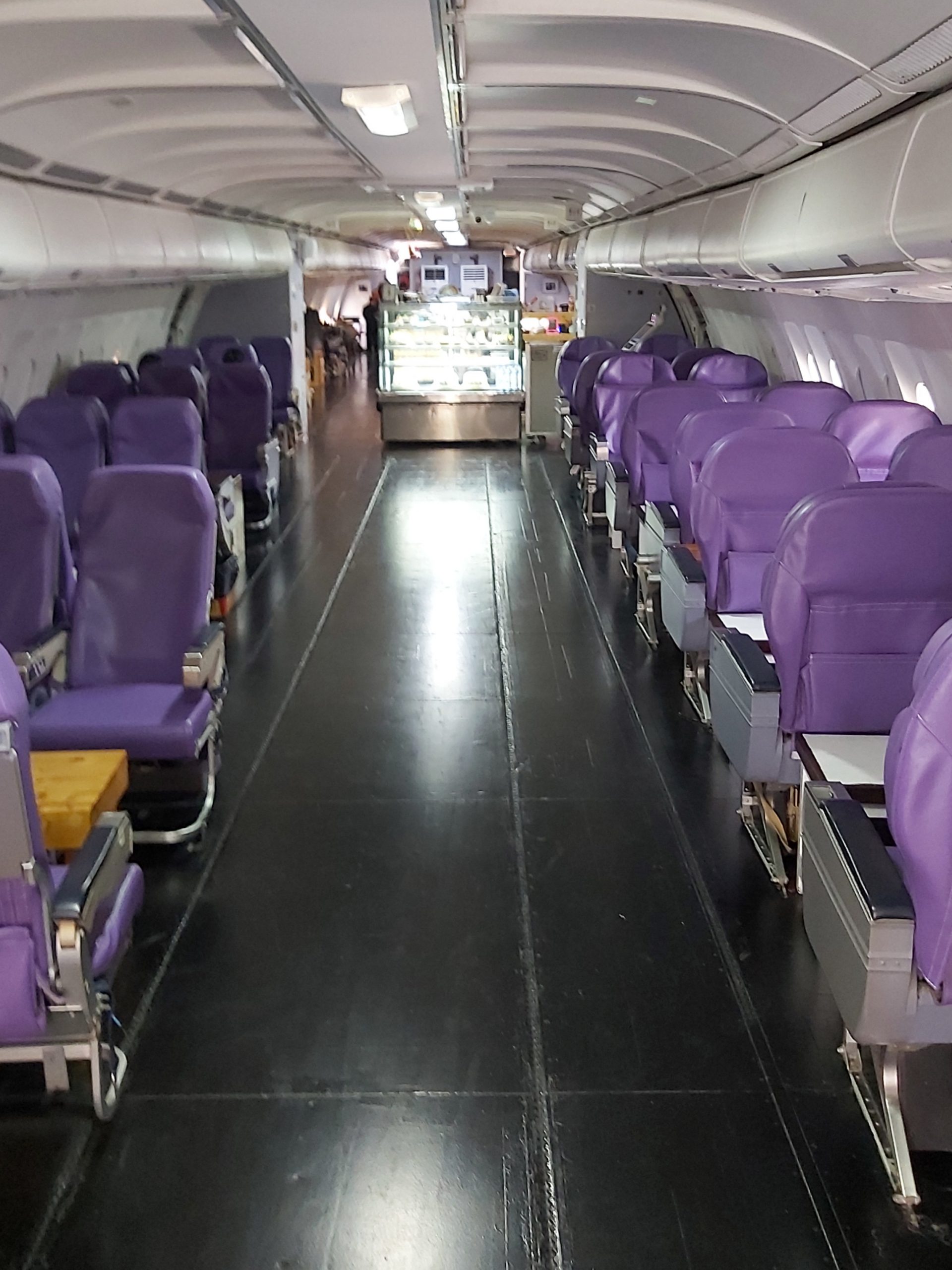Im Inneren findet man Sitzgelegenheiten mit der originalen Bestuhlung und eine zentrale Kaffeebar.