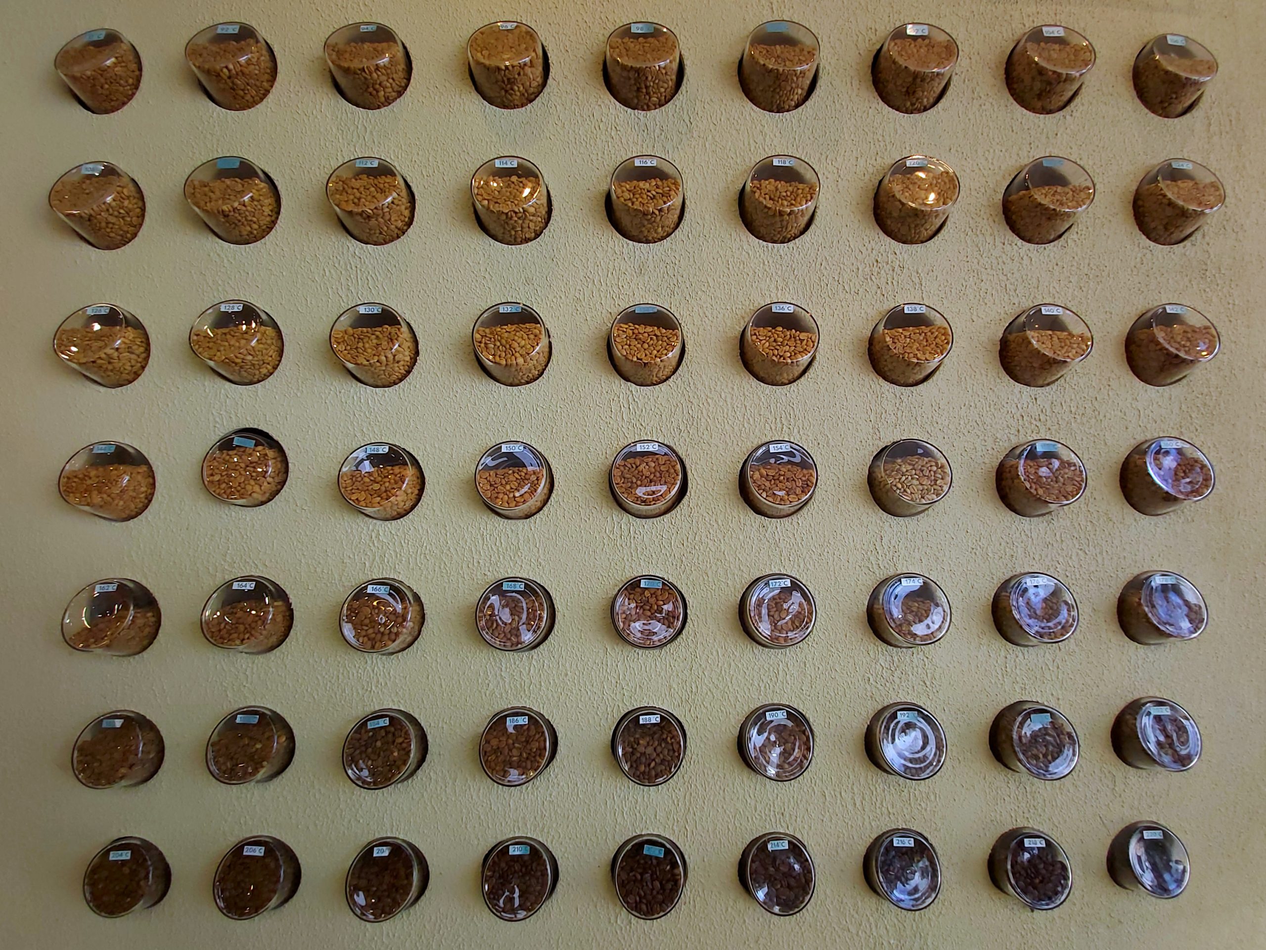 Wanddekoration aus Gläsern mit unterschiedlichen Kaffeebohnen und Röstungen.