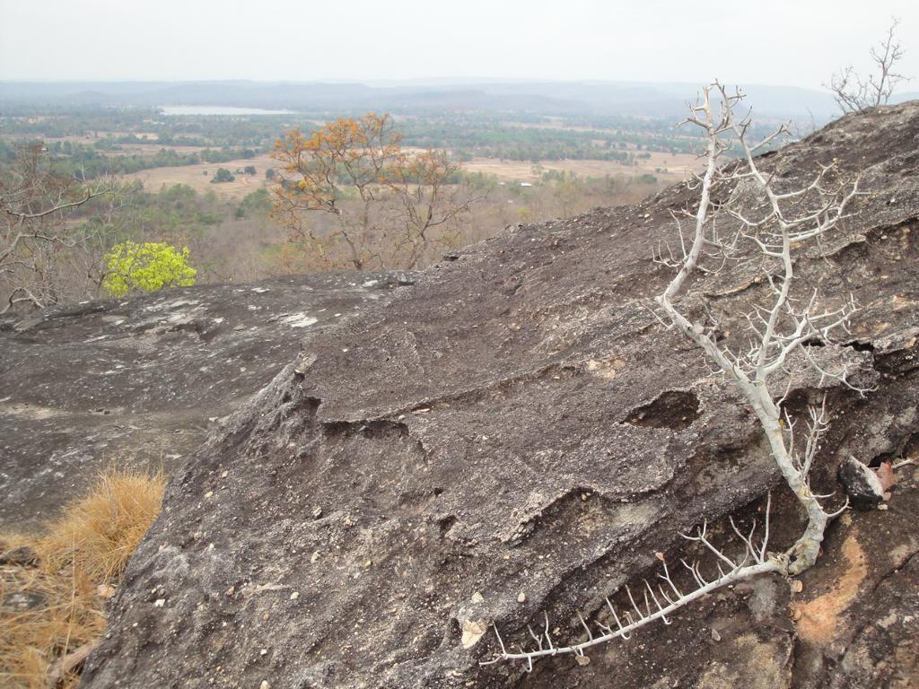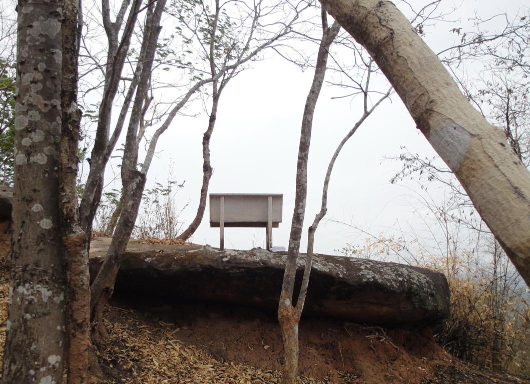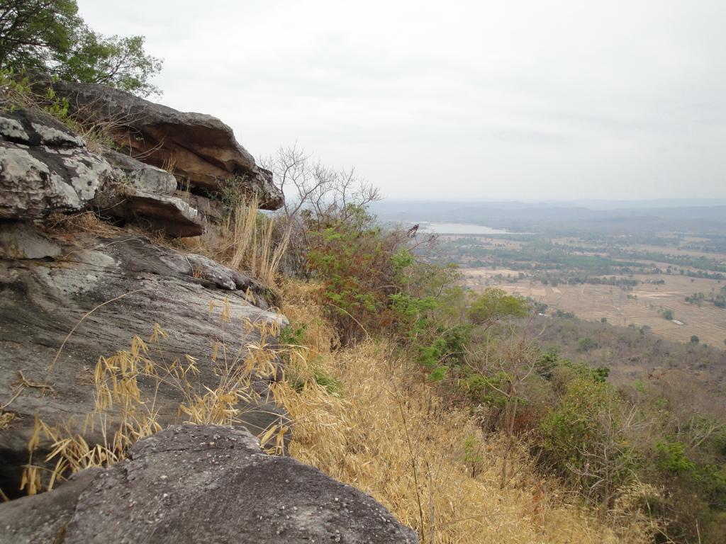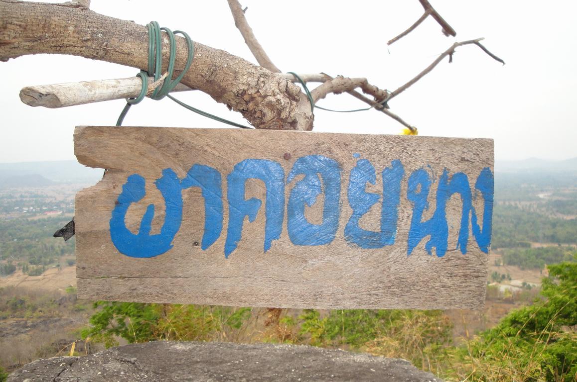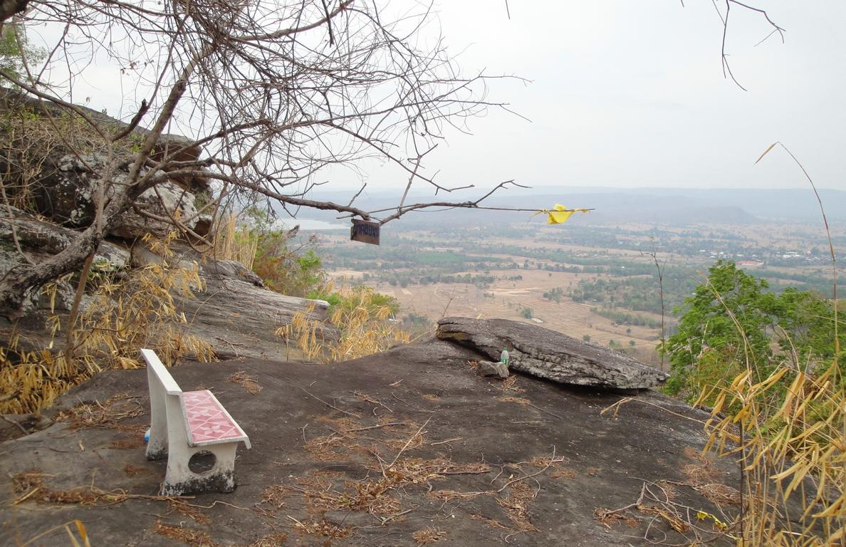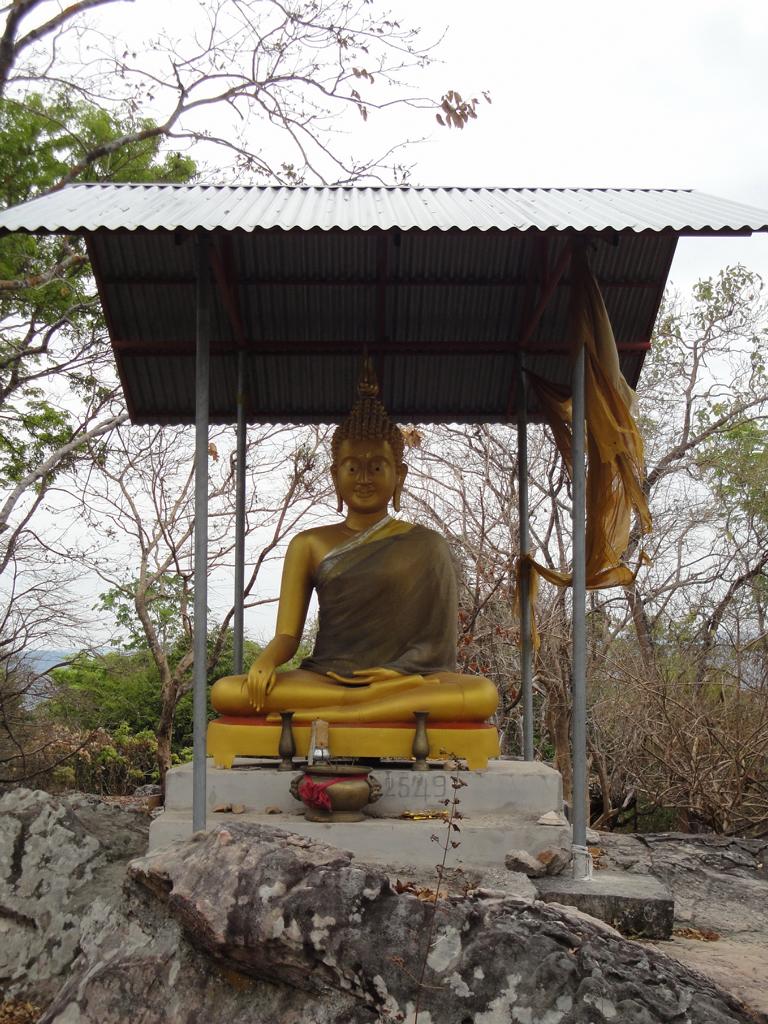 Tour overview … Überblick …The closer together the lines are – the steeper the landscape! As you can see – the contour lines on northern side of the mountain are very close to each other. Je dichter die Höhenlinien zusammenliegen, desto steiler ist das Gelände! Wie man sehen kann – die Höhenlinien an der nördlichen Seite des Berges liegen sehr dicht aneinander.Look at the elevation profile on the right side – it was really very steep. Hier kann man den Steigungsverlauf erkennen – ganz rechts wurde der Weg wirklich sehr steil.Those 2 signs lead me to the mountain … Diese zwei Schilder führten mich zu dem Berg …I didn’t go to that mountain – but it looked similar, yes. In the foreground one of many water basins – necessary to hold water for several months until the beginning of the next rainy season … Ich bin nicht zu diesem Berg gefahren – aber er sah ähnlich aus. Im Vordergrund eines von vielen Wasserbecken – nötig, um Regenwasser über mehrere Monate zu speichern bis die nächste Regenzeit Nachschub bringt …Then the landscape turned „rocky“ … Dann wurde die Landschaft etwas „felsiger“ …… but luckily there was something like a path to ride along. … aber glücklicherweise gab es immer noch einen Pfad um weiterzufahren.Nobody around, very quiet. I did not her any voices, cars, motorcycles – nothing! Ok, maybe a few birds … Niemand hier, sehr still. Ich habe keine Stimmen, Autos, Roller gehört – nichts! Ok, vielleicht einige Vögel …Updating this around 13 years after taking that tour … it’s not easy or even impossible to remember on which side of the mountain I took every single photo. Jetzt, ungefähr dreizehn Jahre nach der Tour … ist es nicht einfach, sich daran zu erinnern, auf welcher Seite des Berges ich jedes einzelne Foto gemacht habe.But this photo must have been taken on the north-western side – because it’s possible to see the Huay Muk water reservoir in the background. Aber dieses Bild habe ich wohl an der Nordwest-Ecke des Berges aufgenommen – weil man im Hintergrund das Huay Muk Reservoir erkennen kann.1 second? Doesn’t last long – we all know. 1 minute? Can already last long – depending on the situation. 1 hour? Nobody likes to wait that long for food in a restaurant or to meet someone. 1 day? As a child a day meant something that nobody could figure. 1 week? Imagine being sick for 1 week – too long. 1 month? 1 year? 10, 100 years? Nothing compared to the age of those rocks here. They are really very old and exist for a really very long time …. And that means: Not several hundred or thousand years! That would be nothing. The shape of the rocks is the result of at least 100 million years of natural erosion! Eine Sekunde? Dauert nicht lange – wissen wir alle. Eine Minute? Kann abhängig von der Situation schon lange dauern. Eine Stunde? Niemand möchte gerne so lange auf sein Essen im Restaurant oder auf das Erscheinen einer Person warten. Ein Tag? Als Kind war das etwas, das man nicht genau definieren konnte. Eine Woche? Man stelle sich vor, eine Woche lang krank zu sein – das ist zu lang. Ein Monat? Ein Jahr? Zehn, hundert Jahre? Das ist nichts im Vergleich zu dem Alter dieser Felsen hier. Sie sind wirklich sehr alt und es gibt sie schon seit sehr langer Zeit … und das bedeutet: Nicht nur einige hundert oder tausend Jahre! Das wäre ja nichts. Die Form der Felsen ist das Ergebnis von mindestens 100 Millionen Jahren natürlicher Erosion!The view was impressive … Der Ausblick war schon beeindruckend …It looked like someone had been here before … Sah so aus als ob hier schon mal jemand gewesen wäre …Where are the dinosaurs …? Wo sind die Dinosaurier …?I vaguely remember that I parked the motorcycle somewhere and kept on walking … Ich erinnere mich vage daran, daß ich den Scooter irgendwo abgestellt habe und zu Fuß weitergegangen bin …… but there wasn’t much of a change. After every corner I expected something like a building, more rocks, a viewpoint … but it took me while to get to … aber die Umgebung änderte sich nicht wirklich. Nach jeder Ecke habe ich etwas wie ein Gebäude, mehr Felsen oder einen Aussichtspunkt erwartet … aber es dauerte schon noch etwas bis ich …… this house. That must have been one of the monk’s accomodation I saw on the sign. …dieses Haus erreichte. Das muss eine der Unterkünfte für Mönche gewesen sein, die auf dem Schild unten ausgewiesen waren.Oh, a bench. Have a seat, please … Oh, eine Bank. Bitte Platz nehmen …Yes, nobody coming. It looked pretty clean … Ja, es kam tatsächlich niemand. Die Bank sah sogar ziemlich sauber aus …… and provided a fantastic view. … und bot einen fantastischen Ausblick.So – I sat down and tried to rest a bit after the tiring climb. So – ich habe mich hingesetzt und versucht, mich etwas von dem anstrengenden Aufstieg zu erholen.A slightly better view on the water reservoir – more than 3 kilometres away. Ein etwas besserer Blick auf das Wasserbecken – mehr als drei Kilometer entfernt.This sign was hanging from a tree branch in front of me – saying that there is a cliff ahead! Try to look at the landscape behing, around the sign – and you will know that it was not a joke. Dieses Schild hing von einem Ast vor mir – darauf stand, daß weiter vorne ein steiles Cliff liegt! Wenn man am Rand des Schildes vorbei schaut, kann man sich vorstellen, daß es da wirklich sehr steil runter ging und die Warnung kein Scherz war.This statue didn’t look typical Thai – but given the fact that Buddhism has its origin in India – it makes kind of sense. Diese Statue sah nicht typisch thailändisch aus – aber wenn man bedenkt, daß der Buddhismus aus Indien stammt, macht das Aussehen schon eher Sinn.Another, old sign – warning of a dangerous path ahead … Noch ein altes Schild – mit der Warnung vor einem gefährlichen Weg …… but I made it without problems to a Buddha statue
