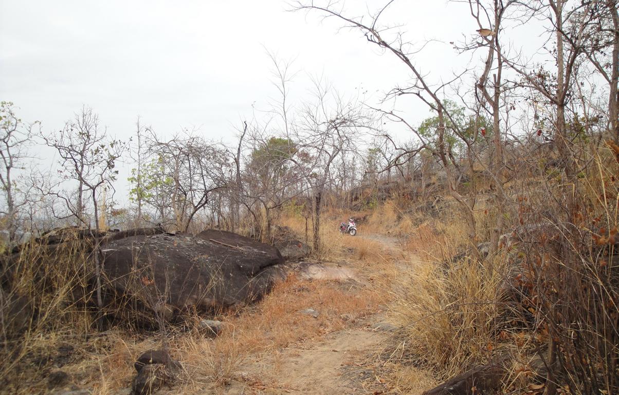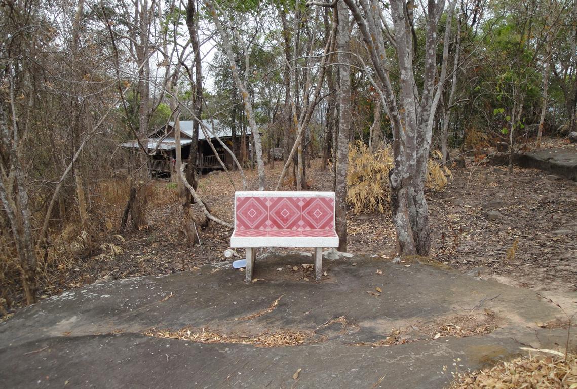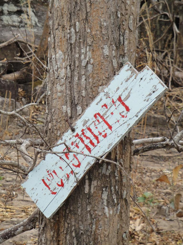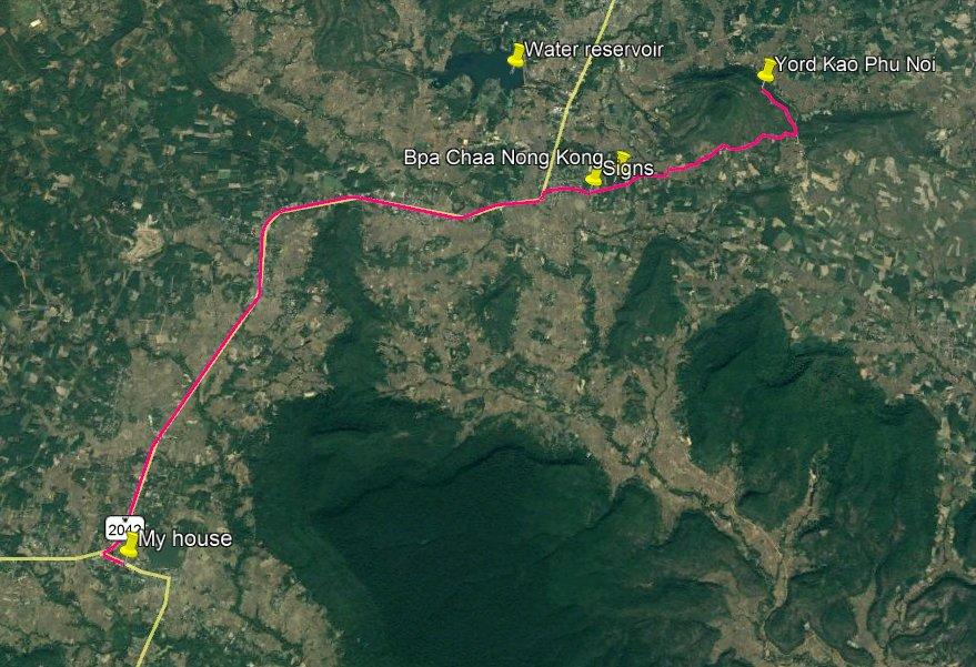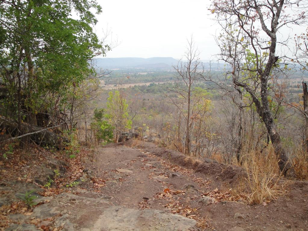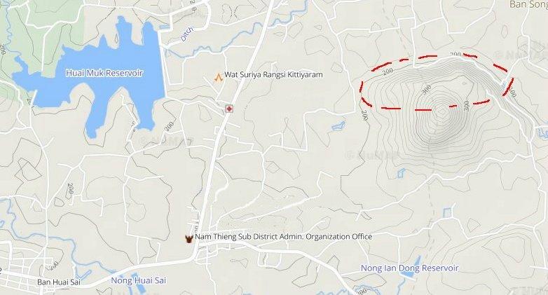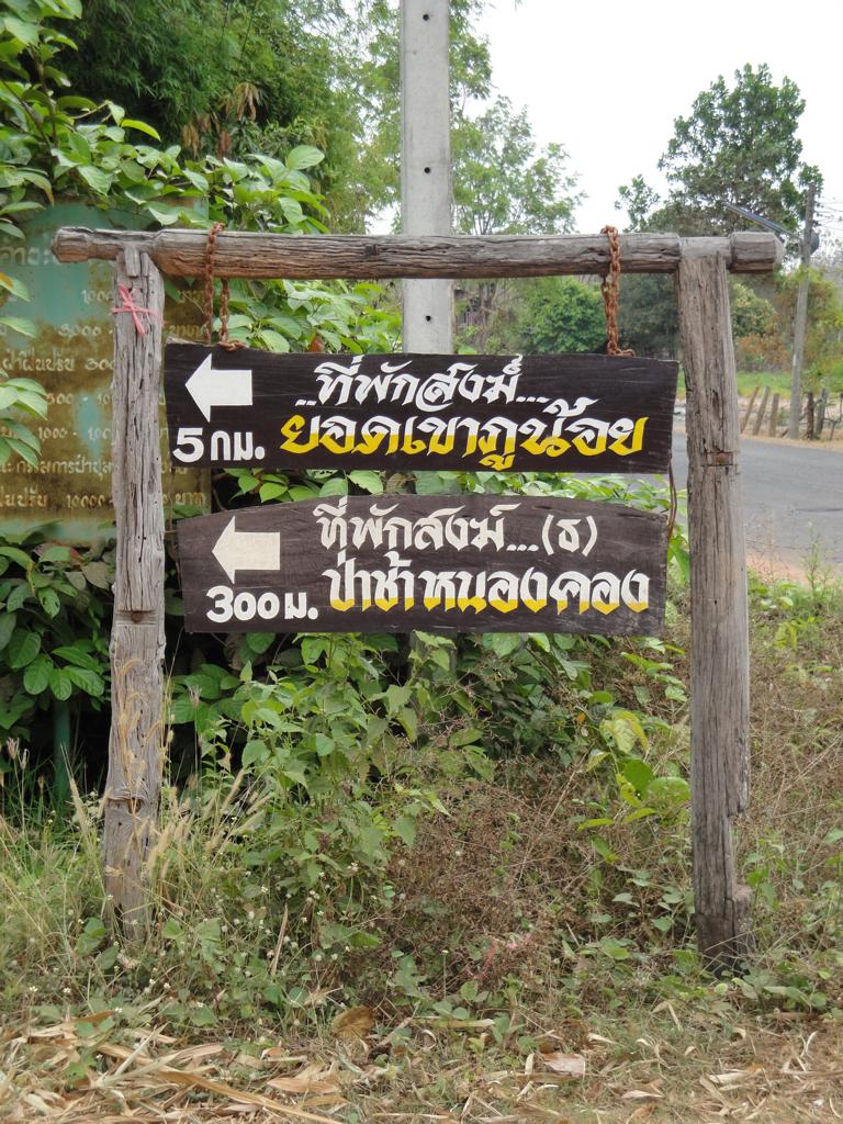 Tour overview … Überblick …The closer together the lines are – the steeper the landscape! As you can see – the contour lines on northern side of the mountain are very close to each other. Je dichter die Höhenlinien zusammenliegen, desto steiler ist das Gelände! Wie man sehen kann – die Höhenlinien an der nördlichen Seite des Berges liegen sehr dicht aneinander.Look at the elevation profile on the right side – it was really very steep. Hier kann man den Steigungsverlauf erkennen – ganz rechts wurde der Weg wirklich sehr steil.Those 2 signs lead me to the mountain … Diese zwei Schilder führten mich zu dem Berg …I didn’t go to that mountain – but it looked similar, yes. In the foreground one of many water basins – necessary to hold water for several months until the beginning of the next rainy season … Ich bin nicht zu diesem Berg gefahren – aber er sah ähnlich aus. Im Vordergrund eines von vielen Wasserbecken – nötig, um Regenwasser über mehrere Monate zu speichern bis die nächste Regenzeit Nachschub bringt …Then the landscape turned „rocky“ … Dann wurde die Landschaft etwas „felsiger“ …… but luckily there was something like a path to ride along. … aber glücklicherweise gab es immer noch einen Pfad um weiterzufahren.Nobody around, very quiet. I did not her any voices, cars, motorcycles – nothing! Ok, maybe a few birds … Niemand hier, sehr still. Ich habe keine Stimmen, Autos, Roller gehört – nichts! Ok, vielleicht einige Vögel …Updating this around 13 years after taking that tour … it’s not easy or even impossible to remember on which side of the mountain I took every single photo. Jetzt, ungefähr dreizehn Jahre nach der Tour … ist es nicht einfach, sich daran zu erinnern, auf welcher Seite des Berges ich jedes einzelne Foto gemacht habe.But this photo must have been taken on the north-western side – because it’s possible to see the Huay Muk water reservoir in the background. Aber dieses Bild habe ich wohl an der Nordwest-Ecke des Berges aufgenommen – weil man im Hintergrund das Huay Muk Reservoir erkennen kann.1 second? Doesn’t last long – we all know. 1 minute? Can already last long – depending on the situation. 1 hour? Nobody likes to wait that long for food in a restaurant or to meet someone. 1 day? As a child a day meant something that nobody could figure. 1 week? Imagine being sick for 1 week – too long. 1 month? 1 year? 10, 100 years? Nothing compared to the age of those rocks here. They are really very old and exist for a really very long time …. And that means: Not several hundred or thousand years! That would be nothing. The shape of the rocks is the result of at least 100 million years of natural erosion! Eine Sekunde? Dauert nicht lange – wissen wir alle. Eine Minute? Kann abhängig von der Situation schon lange dauern. Eine Stunde? Niemand möchte gerne so lange auf sein Essen im Restaurant oder auf das Erscheinen einer Person warten. Ein Tag? Als Kind war das etwas, das man nicht genau definieren konnte. Eine Woche? Man stelle sich vor, eine Woche lang krank zu sein – das ist zu lang. Ein Monat? Ein Jahr? Zehn, hundert Jahre? Das ist nichts im Vergleich zu dem Alter dieser Felsen hier. Sie sind wirklich sehr alt und es gibt sie schon seit sehr langer Zeit … und das bedeutet: Nicht nur einige hundert oder tausend Jahre! Das wäre ja nichts. Die Form der Felsen ist das Ergebnis von mindestens 100 Millionen Jahren natürlicher Erosion!The view was impressive … Der Ausblick war schon beeindruckend …It looked like someone had been here before … Sah so aus als ob hier schon mal jemand gewesen wäre …Where are the dinosaurs …? Wo sind die Dinosaurier …?I vaguely remember that I parked the motorcycle somewhere and kept on walking … Ich erinnere mich vage daran, daß ich den Scooter irgendwo abgestellt habe und zu Fuß weitergegangen bin …… but there wasn’t much of a change. After every corner I expected something like a building, more rocks, a viewpoint … but it took me while to get to … aber die Umgebung änderte sich nicht wirklich. Nach jeder Ecke habe ich etwas wie ein Gebäude, mehr Felsen oder einen Aussichtspunkt erwartet … aber es dauerte schon noch etwas bis ich …… this house. That must have been one of the monk’s accomodation I saw on the sign. …dieses Haus erreichte. Das muss eine der Unterkünfte für Mönche gewesen sein, die auf dem Schild unten ausgewiesen waren.Oh, a bench. Have a seat, please … Oh, eine Bank. Bitte Platz nehmen …Yes, nobody coming. It looked pretty clean … Ja, es kam tatsächlich niemand. Die Bank sah sogar ziemlich sauber aus …… and provided a fantastic view. … und bot einen fantastischen Ausblick.So – I sat down and tried to rest a bit after the tiring climb. So – ich habe mich hingesetzt und versucht, mich etwas von dem anstrengenden Aufstieg zu erholen.A slightly better view on the water reservoir – more than 3 kilometres away. Ein etwas besserer Blick auf das Wasserbecken – mehr als drei Kilometer entfernt.This sign was hanging from a tree branch in front of me – saying that there is a cliff ahead! Try to look at the landscape behing, around the sign – and you will know that it was not a joke. Dieses Schild hing von einem Ast vor mir – darauf stand, daß weiter vorne ein steiles Cliff liegt! Wenn man am Rand des Schildes vorbei schaut, kann man sich vorstellen, daß es da wirklich sehr steil runter ging und die Warnung kein Scherz war.This statue didn’t look typical Thai – but given the fact that Buddhism has its origin in India – it makes kind of sense. Diese Statue sah nicht typisch thailändisch aus – aber wenn man bedenkt, daß der Buddhismus aus Indien stammt, macht das Aussehen schon eher Sinn.Another, old sign – warning of a dangerous path ahead … Noch ein altes Schild – mit der Warnung vor einem gefährlichen Weg …… but I made it without problems to a Buddha statue