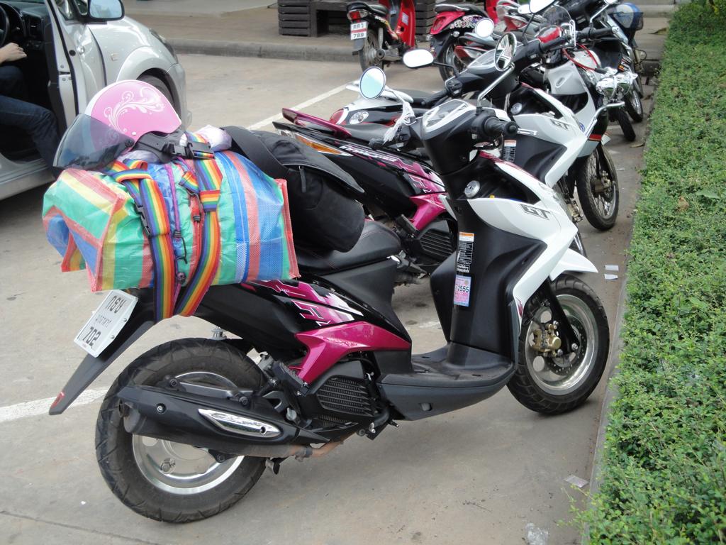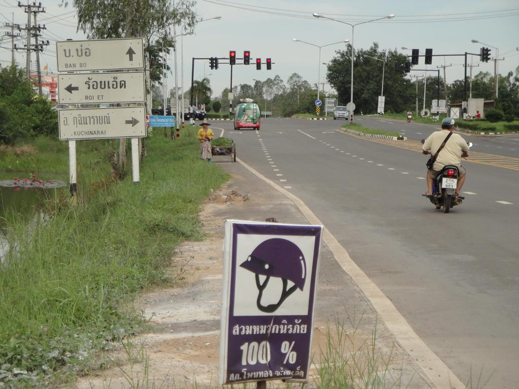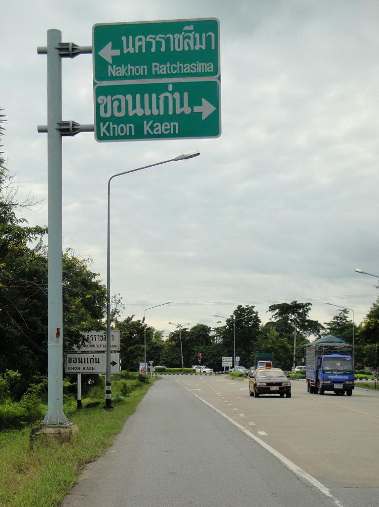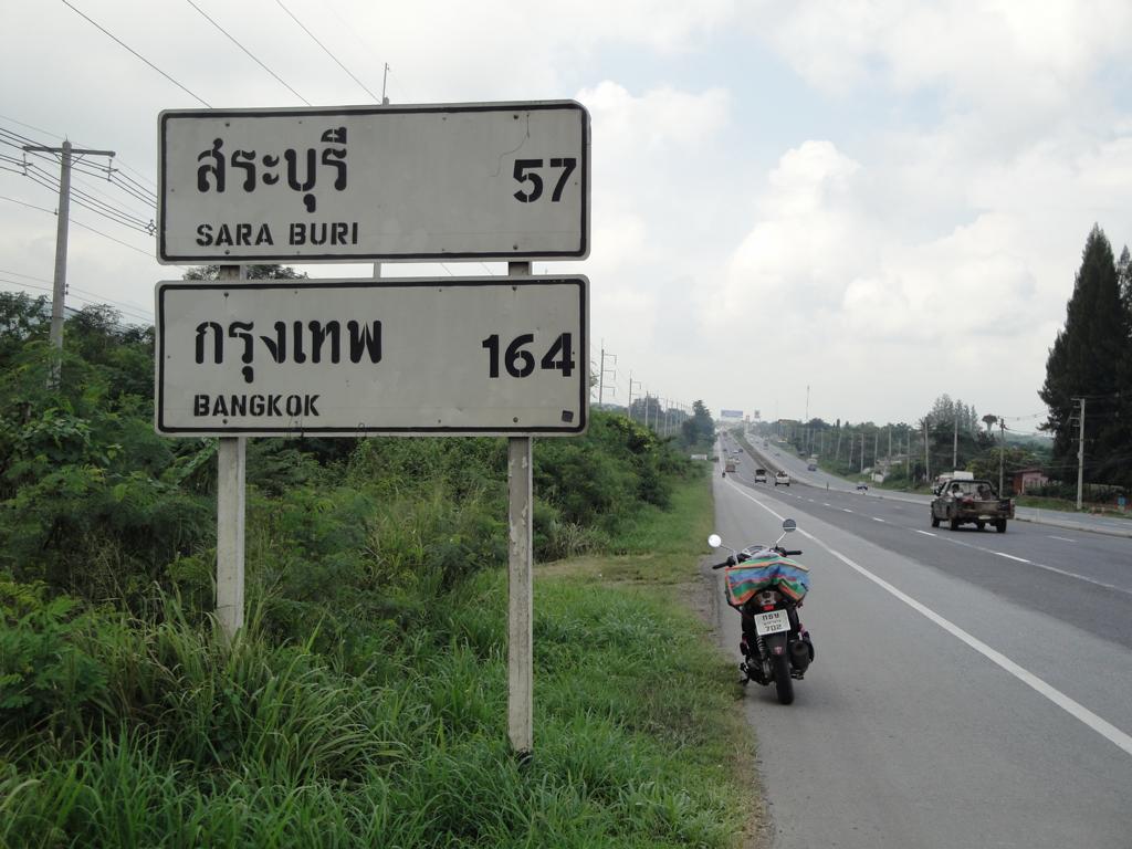 Tour overview … Überblick der Gesamtstrecke …The day before the start: Time to get the bike cleaned … Am Tag vor der Abfahrt: Zeit für eine Grundreinigung …… fill the tank, say goodbye to my friend Da (she washed my hairs in a small salon, cleaned my house, found a job at a gas station and later went to Korea to work there for 2 years). … tanken und sich von einer guten Freundin namens Da zu verabschieden (sie hat mir in einem kleinen Friseursalon die Haare gewaschen, mein Haus geputzt, später an einer Tankstelle gearbeitet und ist dann für zwei Jahre nach Korea gegangen um dort zu arbeiten).That’s just before the start. Kilometerstand direkt vor der Abfahrt.Approaching the first bigger intersection … Anfahrt auf die erste größere Kreuzung …Turning left towards Roi Et – second biggest city on my way. Links ab nach Roi Et – der zweitgrößten Stadt auf meinem Weg.Chopping blocks for butchers … it might be a certain kind of wood because I have never seen it somewhere else. Hackklötze für Fleischer … wahrscheinlich aus einem besonderen, lokalen Holz weil ich sie sonst nirgends gesehen habe.Really an easy ride. Not much traffic here, a wide lane for motorcycles … I really enjoyed it. Wirklich eine entspannte Fahrt. Kaum Verkehr und eine breite Spur für motorisierte Zweiräder. Ich konnte die Fahrt wirklich genießen.130 km to Nakhon Ratchasima – that sounded not too bad (roughly 2 more hours to go). Nur noch 130 Kilometer bis nach Nakhon Ratchasima. – das klang nicht allzu schlecht (ungefähr noch zwei Stunden zu fahren).Last stop before Nakhon Ratchasima – Prathai. Der letzte Halt vor der Ankunft in Nakhon Ratchasima – in Prathai.Those clouds didn’t look so nice … Diese Wolken sahen nicht wirklich schön aus …Another significant intersection: Meeting highway number 2 which stretches from Saraburi north of Bangkok to Nong Kai in the Northeast of Thailand. Eine weitere markante Kreuzung: Highway 2, der von Saraburi im Norden von Bangkok nach Nong Kai im Nordosten Thailands verläuft.Then I arrived in Nakhon Ratchasima and found a decent hotel for around 15 Euros. Dann endlich war ich in der Stadt und habe ein anständiges Zimmer für etwa 15 Euro gefunden.Interesting wall between the bedroom and the bathroom … Auffällige Trennwand zwischen Bad und Schlafzimmer …In the evening I went out to the city center to have dinner and visit the statue of the famous Thao Suranari (or Ya Mo). She was the wife of the deputy governor of Nakhon Ratchasima (Korat) and saved the inhabitans from being abducted to Laos. Am Abend war ich im Zentrum unterwegs um etwas zu essen und das berühmte Standbild von Thao Suranari (auch Ya Mo genannt) zu besuchen. Sie war die Frau des Vizegouverneurs von Nakhon Ratchasima (Korat) und hat die Einwohner vor einer Entführung nach Laos bewahrt.Wat Nonkum / Wat Luang Por To west of Nakhon Ratchasima. Still under construction and I didn’t stop because I was heading towards Bangkok. Wat Nonkum / Wat Luang Por To im Westen von Nakhon Ratchasima. Noch im Bau und ich habe auch nicht angehalten weil ich ja weiter in Richtung Bangkok wollte.First sight of the Lam Takong water reservoir. Erster Blick auf das Lam Takong Staubecken.Many fruit vendors along the road … Viele Obsthändler entlang der Strecke …Chokchai Farm is a venue to promote agriculture and local products. Die Chokchai Farm ist ein Ort um die lokale Landwirtschaft und deren Produkte zu vermarkten.I tried the milk ice-cream … and it was really … creamy. Ich habe das Milcheis probiert … und es war tatsächlich sehr cremig.Sawas dee kha (Thai greeting, spoken by a woman). Guten Tag oder Auf Wiedersehen (thailändischer Gruß, von einer Frau gesprochen).Good motivation to see that … Samut Prakan is closer than that. Sehr motivierend, das zu sehen … Samut Prakan liegt etwas näher.Sorry, to big to carry it along … Entschuldigung, die Tasche ist zu groß um sie mitzunehmen.Approaching the area where my map told me to leave the highway … In der Nähe der Gegend, in der ich laut Karte die Autobahn verlassen sollte.Be careful! Vorsicht!The mirror became loose , I stopped at a small motorcycle shop, a guy tried to fix it – and broke it! Wegen der sehr schlechten Straße hatte sich ein Spiegel gelockert, ich habe an einer kleinen Werkstatt angehalten, jemand versuchte, den Spiegel zu befestigen – und hat ihn dabei zerbrochen.Getting closer – the airport is in Samut Prakan … Immer näher – der Flughafen liegt schon in samut Prakan …It began to look like a big city already … Allmählich sah es schon nach Großstadt aus …I rode the whole tour without helmet – until here. Police stopped me, fined me (around 8 Euro), made me unload my bag and put on the helmet – which was underneath the well secured bag and the saddle. Another, unintentional stop … Ich bin den Großteil der Strecke ohne Helm gefahren – bis hierher. Die Polizei hielt mich an und ich musste umgerechnet 8 Euro dafür bezahlen, ohne Helm gefahren zu sein. Ich musste den Helm, der unter dem gut verschnürten Gepäck unter dem Sattel steckte, herausholen und aufsetzen. Ein weiterer ungeplanter Stop.I finally arrived at the place that I had booked for 1 month. Schließlich bin ich doch noch dort angekommen, wo ich mir für einen Monat ein Zimmer gebucht hatte.Final milage: 690 km, 2 days, 1 night, 9 hours per day on the bike. But I made it without accident and problems. (I remember that my hands were still shaking while taking this photo. I was done!) Kilometerstand nach Ankunft: 690 km, zwei Tage, eine Nacht, neun Stunden täglich auf dem Roller. Aber ich hatte es ohne Unfall und Probleme geschafft. (Ich erinnere mich daran, daß meine Hände noch gezittert haben während ich dieses Bild gemacht habe. Ich war fix und fertig!)