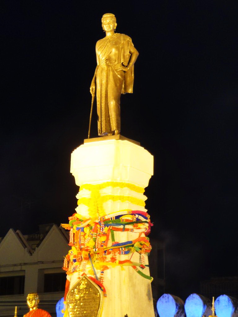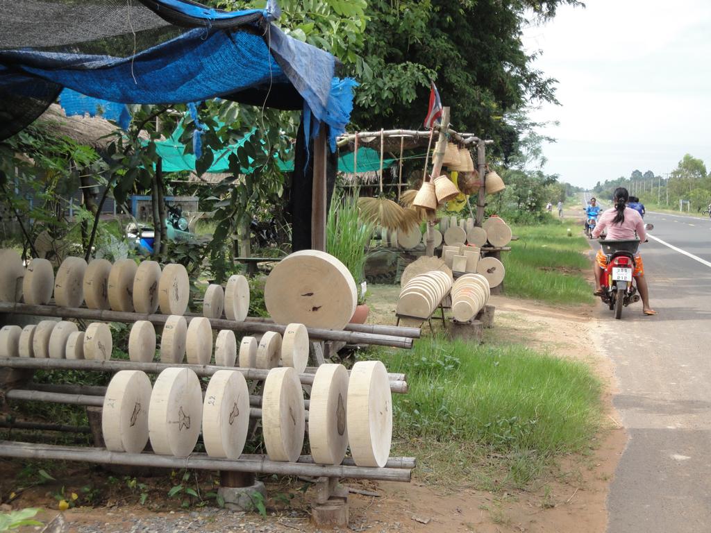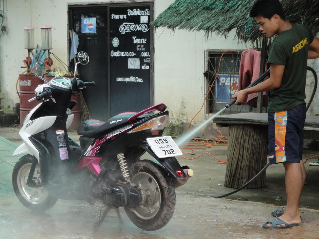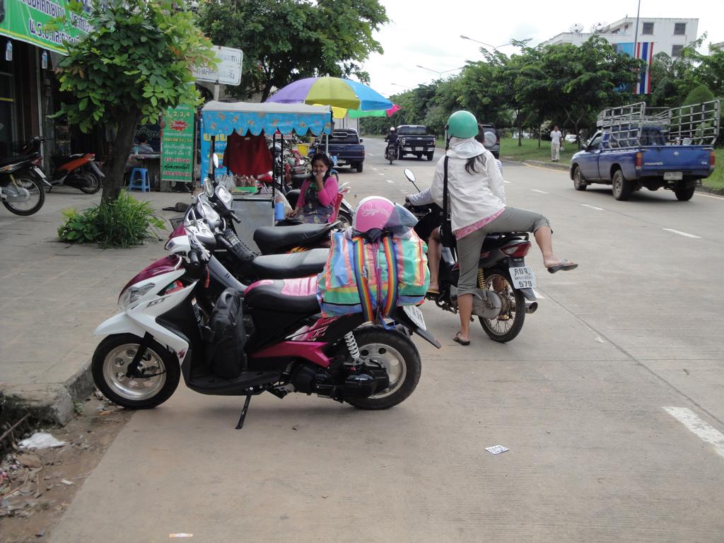 Tour overview … Überblick der Gesamtstrecke …The day before the start: Time to get the bike cleaned … Am Tag vor der Abfahrt: Zeit für eine Grundreinigung …… fill the tank, say goodbye to my friend Da (she washed my hairs in a small salon, cleaned my house, found a job at a gas station and later went to Korea to work there for 2 years). … tanken und sich von einer guten Freundin namens Da zu verabschieden (sie hat mir in einem kleinen Friseursalon die Haare gewaschen, mein Haus geputzt, später an einer Tankstelle gearbeitet und ist dann für zwei Jahre nach Korea gegangen um dort zu arbeiten).That’s just before the start. Kilometerstand direkt vor der Abfahrt.Approaching the first bigger intersection … Anfahrt auf die erste größere Kreuzung …Turning left towards Roi Et – second biggest city on my way. Links ab nach Roi Et – der zweitgrößten Stadt auf meinem Weg.Chopping blocks for butchers … it might be a certain kind of wood because I have never seen it somewhere else. Hackklötze für Fleischer … wahrscheinlich aus einem besonderen, lokalen Holz weil ich sie sonst nirgends gesehen habe.Really an easy ride. Not much traffic here, a wide lane for motorcycles … I really enjoyed it. Wirklich eine entspannte Fahrt. Kaum Verkehr und eine breite Spur für motorisierte Zweiräder. Ich konnte die Fahrt wirklich genießen.130 km to Nakhon Ratchasima – that sounded not too bad (roughly 2 more hours to go). Nur noch 130 Kilometer bis nach Nakhon Ratchasima. – das klang nicht allzu schlecht (ungefähr noch zwei Stunden zu fahren).Last stop before Nakhon Ratchasima – Prathai. Der letzte Halt vor der Ankunft in Nakhon Ratchasima – in Prathai.Those clouds didn’t look so nice … Diese Wolken sahen nicht wirklich schön aus …Another significant intersection: Meeting highway number 2 which stretches from Saraburi north of Bangkok to Nong Kai in the Northeast of Thailand. Eine weitere markante Kreuzung: Highway 2, der von Saraburi im Norden von Bangkok nach Nong Kai im Nordosten Thailands verläuft.Then I arrived in Nakhon Ratchasima and found a decent hotel for around 15 Euros. Dann endlich war ich in der Stadt und habe ein anständiges Zimmer für etwa 15 Euro gefunden.Interesting wall between the bedroom and the bathroom … Auffällige Trennwand zwischen Bad und Schlafzimmer …In the evening I went out to the city center to have dinner and visit the statue of the famous Thao Suranari (or Ya Mo). She was the wife of the deputy governor of Nakhon Ratchasima (Korat) and saved the inhabitans from being abducted to Laos. Am Abend war ich im Zentrum unterwegs um etwas zu essen und das berühmte Standbild von Thao Suranari (auch Ya Mo genannt) zu besuchen. Sie war die Frau des Vizegouverneurs von Nakhon Ratchasima (Korat) und hat die Einwohner vor einer Entführung nach Laos bewahrt.Wat Nonkum / Wat Luang Por To west of Nakhon Ratchasima. Still under construction and I didn’t stop because I was heading towards Bangkok. Wat Nonkum / Wat Luang Por To im Westen von Nakhon Ratchasima. Noch im Bau und ich habe auch nicht angehalten weil ich ja weiter in Richtung Bangkok wollte.First sight of the Lam Takong water reservoir. Erster Blick auf das Lam Takong Staubecken.Many fruit vendors along the road … Viele Obsthändler entlang der Strecke …Chokchai Farm is a venue to promote agriculture and local products. Die Chokchai Farm ist ein Ort um die lokale Landwirtschaft und deren Produkte zu vermarkten.I tried the milk ice-cream … and it was really … creamy. Ich habe das Milcheis probiert … und es war tatsächlich sehr cremig.Sawas dee kha (Thai greeting, spoken by a woman). Guten Tag oder Auf Wiedersehen (thailändischer Gruß, von einer Frau gesprochen).Good motivation to see that … Samut Prakan is closer than that. Sehr motivierend, das zu sehen … Samut Prakan liegt etwas näher.Sorry, to big to carry it along … Entschuldigung, die Tasche ist zu groß um sie mitzunehmen.Approaching the area where my map told me to leave the highway … In der Nähe der Gegend, in der ich laut Karte die Autobahn verlassen sollte.Be careful! Vorsicht!The mirror became loose , I stopped at a small motorcycle shop, a guy tried to fix it – and broke it! Wegen der sehr schlechten Straße hatte sich ein Spiegel gelockert, ich habe an einer kleinen Werkstatt angehalten, jemand versuchte, den Spiegel zu befestigen – und hat ihn dabei zerbrochen.Getting closer – the airport is in Samut Prakan … Immer näher – der Flughafen liegt schon in samut Prakan …It began to look like a big city already … Allmählich sah es schon nach Großstadt aus …I rode the whole tour without helmet – until here. Police stopped me, fined me (around 8 Euro), made me unload my bag and put on the helmet – which was underneath the well secured bag and the saddle. Another, unintentional stop … Ich bin den Großteil der Strecke ohne Helm gefahren – bis hierher. Die Polizei hielt mich an und ich musste umgerechnet 8 Euro dafür bezahlen, ohne Helm gefahren zu sein. Ich musste den Helm, der unter dem gut verschnürten Gepäck unter dem Sattel steckte, herausholen und aufsetzen. Ein weiterer ungeplanter Stop.I finally arrived at the place that I had booked for 1 month. Schließlich bin ich doch noch dort angekommen, wo ich mir für einen Monat ein Zimmer gebucht hatte.Final milage: 690 km, 2 days, 1 night, 9 hours per day on the bike. But I made it without accident and problems. (I remember that my hands were still shaking while taking this photo. I was done!) Kilometerstand nach Ankunft: 690 km, zwei Tage, eine Nacht, neun Stunden täglich auf dem Roller. Aber ich hatte es ohne Unfall und Probleme geschafft. (Ich erinnere mich daran, daß meine Hände noch gezittert haben während ich dieses Bild gemacht habe. Ich war fix und fertig!)