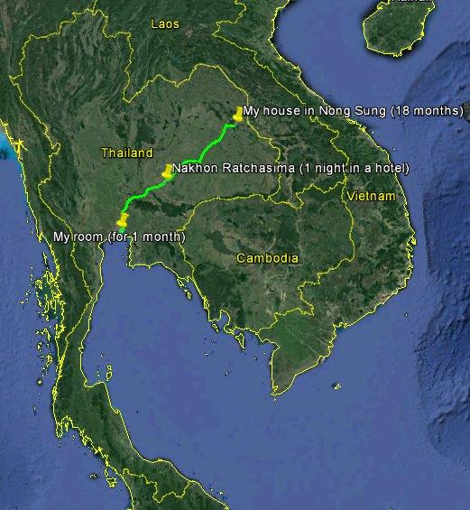 Nachdem ich meine Arbeit in Mukdahan beendet hatte und mir darüber klar geworden war, daß ich in die Nähe von Bangkok ziehen wollte, habe ich die Strecke nach Samut Prakan bei Bangkok geplant. Hier hatte ich für einen Monat ein Zimmer gemietet und wollte mir von dort aus eine andere Unterkunft für die nächste Zeit suchen.