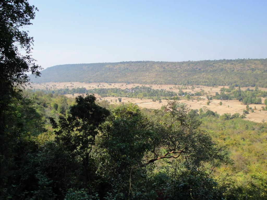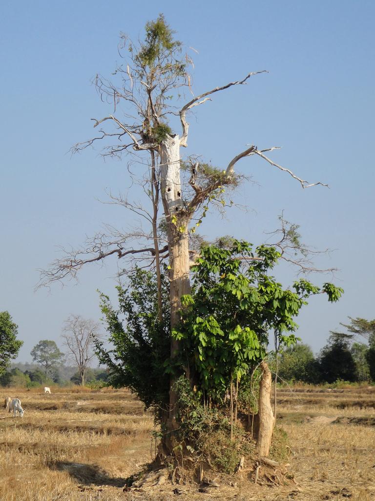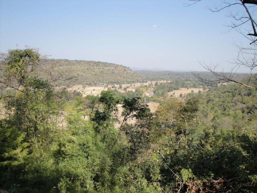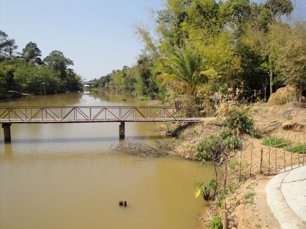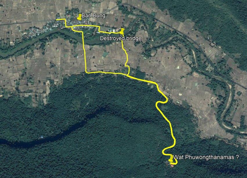Area overview … I parked my motorcycle somewhere in Ban Bung and we started walking from there – around 6 km. Parts of the yellow line don’t show the real track. But due to my lack of memory and non-existing maps with the real trails, I tried to show a route that pretty much represents our tour on this day. Überblick über die Gegend … Ich parkte meinen Roller irgendwo in Ban Nuang und wir gingen los – etwa 6 Kilometer. Teile der gelben Linie zeigen nicht den tatsächlich zurückgelegten Weg. Aber wegen meiner Vergesslichkeit und der Unzulänglichkeit der Karten habe ich versucht, einen Weg nachzuzeichnen, der annäherungsweise unseren Weg an diesem Tag sichtbar macht.Crossing the … small river. Hier konnten wir den kleinen Fluss queren.In the background it’s the other bridge. On the way back we crossed over there. Im Hintergrund kann man die andere Brücke erkennen. Dort überquerten wir den Fluss auf dem Rückweg.My 2 guides today. The young man on the right was the elected student’s spokesman and one of the better, smarter students. He brought his friend and I think, the tour was something like … saying ‚Thank you for teaching here‘. But maybe, they just wanted to practice their Einglish in a more relaxed atmosphere than at school. Anyway – we had a nice and interesting day. Meine heutigen Führer. Der junge Mann rechts im Bild war der gewählte Schülersprecher und einer der besseren, klügeren Schüler. Er hatte seinen Freund mitgebracht und die Tour sollte einfach ein ‚Danke, daß Sie hier unterrichten‘ sein. Aber vielleicht wollten sie ja auch nur in einer entspannteren Umgebung als in der Schule ihr Englisch verbesseren. Egal – wir hatten einen schönen und interessanten Tag.The combination of green leaves and the red flower in the centre made it look very nice … Durch die Kombination von grünen Blättern und der roten Blüte im Zentrum sah diese Pflanze seht hübsch aus …I can’t remember who spotted the dead bug on the ground. But the students told me to collect and keep its shiny wings. I was surprised how rigid they felt. No way to bend them – they would brake. Ich kann mich nicht mehr daran erinnern, wer das tote Insekt auf dem Boden gesehen hatte. Aber die Schüler sagten mir, ich solle die glänzenden Flügel aufheben. Ich war überrascht, wie fest sie sich anfühlten. Hätte ich versucht, sie glatt zu drücken – wären sie zerbrochen.Climbing higher and higher … overlooking the valley where we came from. Wir stiegen immer höher … und konnten auf das Tal blicken, aus dem wir gekommen waren.There was a path, yes. But the students were a few years younger than their old teacher … Ja, es gab einen Weg. Aber die Schüler waren einge Jahre jünger als ihr alter Lehrer …There, in that village, next to the house – thats’s where I parked my motorcycle. Look! Can you see it? Da, in dem Dorf, neben dem Haus – da habe ich meinen Roller abgestellt. Guck doch mal genau hin! Siehst Du ihn?Good to see that the way began to follow a certain level. Obviously we had reached the ridge of the mountain. Ich war froh, zu sehen, daß sich der Weg jetzt auf gleichbleibendem Niveau bewegte. Anscheinend hatten wir den Bergrücken erreicht.And finally we reached the place they wanted me to visit today. Und endlich erreichten wir den Ort, den sie mir heute zeigen wollten.Not busy here, no other visitors. But we saw a man who appeared to perform some kind or repair work. Spotting the motorcycle made me think … why did we had to walk? Ok, it was part of the experience. Nicht viel los hier, keine anderen Besucher. Aber wir sahen einen Mann, der etwas zu reparieren schien. Als ich das Motorcycle sah, überlegte ich kurz … warum mussten wir laufen? Ok, der Weg war das Ziel.Huge tanks to collect and store rain water. Große Tanks um Regenwasser zu sammeln und zu speichern.The small blue bowl made me think … is this the place to take a shower? Die kleine, blaue Schüssel stimmte mich nachdenklich … war das hier der Ort um eine Dusche zu nehmen?From now on we followed the more convenient way down … Ab jetzt folgten wir dem bequmeren Weg nach unten …… which was obviously still under construction. … der aber offensichtlich noch im Bau war …The workers smiled and waved when they saw me walking with my students. I am sure that not many foreigners made it up and back down to this place. Die Arbeiter lächelten und winkten als sie mich mit den Schülern sahen. Ich bin mir sicher, daß nicht viele Ausländer den Weg zu diesem Ort und zurück gegangen waren.Meanwhile my legs were hurting a bit and it felt good not to climb up or walk down … every flat strech was more than welcomed. Inzwischen schmerzten meine Beine etwas und es fühlte sich gut, weder irgendwo hinaufsteigen noch hinunterlaufen zu müssen … jede ebene Passage kam sehr gelegen.Another view across the valley … Ein anderer Blickwinkel auf das Tal …Protected, tropical wood? Geschütztes Tropenholz?It felt good to be back on ground level again … it was an interesting tour. But I was exhausted. Es fühlte sich gut an, wieder in der Ebene angekommen zu sein … nach einer interessanten Wanderung. Aber ich war erschöpft.Many ‚lonesome‘ trees here in Mukdahan. Years ago declared dead already – but still alive and growing. In Mukdahan standen viele ‚einsame‘ Bäume. Vor Jahren für tot erklärt – aber immer noch am Leben und weiter wachsend.Then we arrived back at the river and someone was fishing. Using mostly natural materials to build a trap to catch fish. Als wir wieder an dem Fluss ankamen, war dort jemand auf der Jagd nach Fischen. Er hatte fast nur natürliche Materialien genutzt um die Falle zu bauen und die Fische zu fangen.This bridge was broken but we could cross via the small dam to get back to where we started from. Diese Brücke war beschädigt aber wir konnten den kleinen Damm nutzen um zu unserem Ausgangspunkt zurückzukehren.