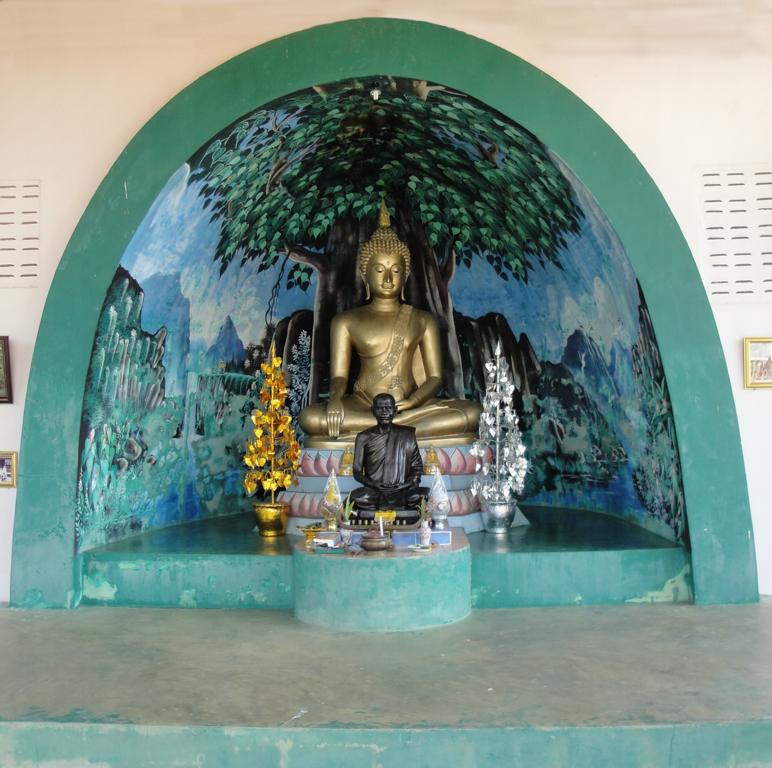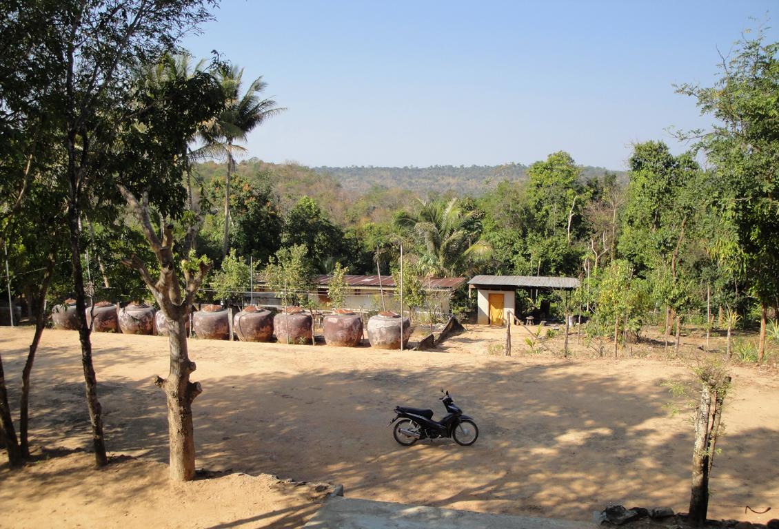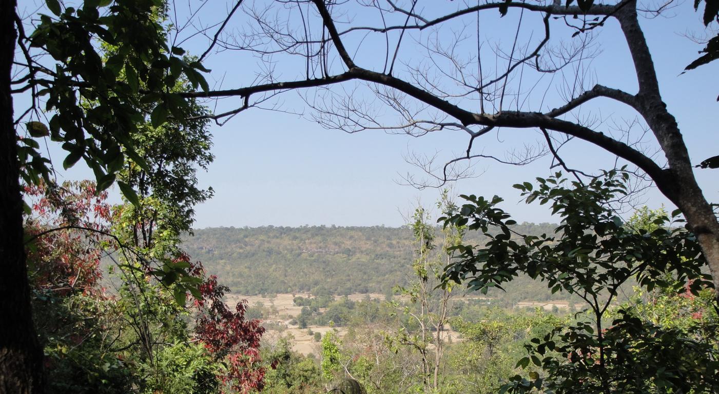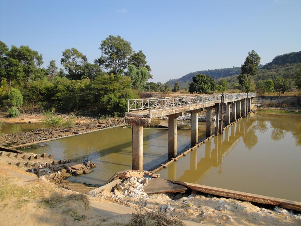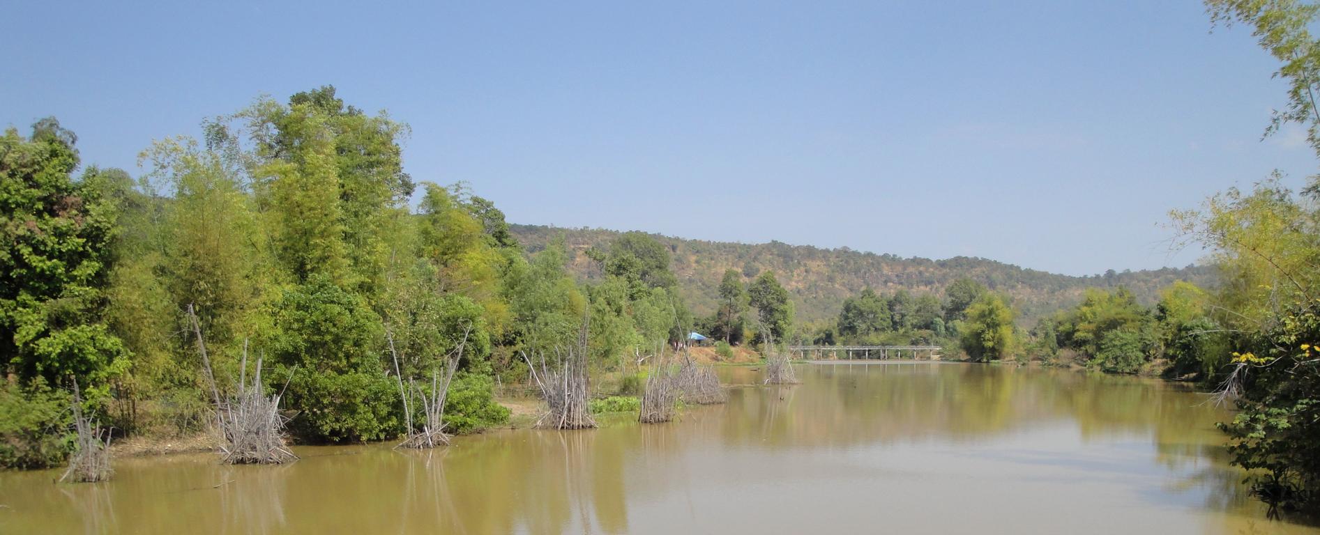 Area overview … I parked my motorcycle somewhere in Ban Bung and we started walking from there – around 6 km. Parts of the yellow line don’t show the real track. But due to my lack of memory and non-existing maps with the real trails, I tried to show a route that pretty much represents our tour on this day. Überblick über die Gegend … Ich parkte meinen Roller irgendwo in Ban Nuang und wir gingen los – etwa 6 Kilometer. Teile der gelben Linie zeigen nicht den tatsächlich zurückgelegten Weg. Aber wegen meiner Vergesslichkeit und der Unzulänglichkeit der Karten habe ich versucht, einen Weg nachzuzeichnen, der annäherungsweise unseren Weg an diesem Tag sichtbar macht.Crossing the … small river. Hier konnten wir den kleinen Fluss queren.In the background it’s the other bridge. On the way back we crossed over there. Im Hintergrund kann man die andere Brücke erkennen. Dort überquerten wir den Fluss auf dem Rückweg.My 2 guides today. The young man on the right was the elected student’s spokesman and one of the better, smarter students. He brought his friend and I think, the tour was something like … saying ‚Thank you for teaching here‘. But maybe, they just wanted to practice their Einglish in a more relaxed atmosphere than at school. Anyway – we had a nice and interesting day. Meine heutigen Führer. Der junge Mann rechts im Bild war der gewählte Schülersprecher und einer der besseren, klügeren Schüler. Er hatte seinen Freund mitgebracht und die Tour sollte einfach ein ‚Danke, daß Sie hier unterrichten‘ sein. Aber vielleicht wollten sie ja auch nur in einer entspannteren Umgebung als in der Schule ihr Englisch verbesseren. Egal – wir hatten einen schönen und interessanten Tag.The combination of green leaves and the red flower in the centre made it look very nice … Durch die Kombination von grünen Blättern und der roten Blüte im Zentrum sah diese Pflanze seht hübsch aus …I can’t remember who spotted the dead bug on the ground. But the students told me to collect and keep its shiny wings. I was surprised how rigid they felt. No way to bend them – they would brake. Ich kann mich nicht mehr daran erinnern, wer das tote Insekt auf dem Boden gesehen hatte. Aber die Schüler sagten mir, ich solle die glänzenden Flügel aufheben. Ich war überrascht, wie fest sie sich anfühlten. Hätte ich versucht, sie glatt zu drücken – wären sie zerbrochen.Climbing higher and higher … overlooking the valley where we came from. Wir stiegen immer höher … und konnten auf das Tal blicken, aus dem wir gekommen waren.There was a path, yes. But the students were a few years younger than their old teacher … Ja, es gab einen Weg. Aber die Schüler waren einge Jahre jünger als ihr alter Lehrer …There, in that village, next to the house – thats’s where I parked my motorcycle. Look! Can you see it? Da, in dem Dorf, neben dem Haus – da habe ich meinen Roller abgestellt. Guck doch mal genau hin! Siehst Du ihn?Good to see that the way began to follow a certain level. Obviously we had reached the ridge of the mountain. Ich war froh, zu sehen, daß sich der Weg jetzt auf gleichbleibendem Niveau bewegte. Anscheinend hatten wir den Bergrücken erreicht.And finally we reached the place they wanted me to visit today. Und endlich erreichten wir den Ort, den sie mir heute zeigen wollten.Not busy here, no other visitors. But we saw a man who appeared to perform some kind or repair work. Spotting the motorcycle made me think … why did we had to walk? Ok, it was part of the experience. Nicht viel los hier, keine anderen Besucher. Aber wir sahen einen Mann, der etwas zu reparieren schien. Als ich das Motorcycle sah, überlegte ich kurz … warum mussten wir laufen? Ok, der Weg war das Ziel.Huge tanks to collect and store rain water. Große Tanks um Regenwasser zu sammeln und zu speichern.The small blue bowl made me think … is this the place to take a shower? Die kleine, blaue Schüssel stimmte mich nachdenklich … war das hier der Ort um eine Dusche zu nehmen?From now on we followed the more convenient way down … Ab jetzt folgten wir dem bequmeren Weg nach unten …… which was obviously still under construction. … der aber offensichtlich noch im Bau war …The workers smiled and waved when they saw me walking with my students. I am sure that not many foreigners made it up and back down to this place. Die Arbeiter lächelten und winkten als sie mich mit den Schülern sahen. Ich bin mir sicher, daß nicht viele Ausländer den Weg zu diesem Ort und zurück gegangen waren.Meanwhile my legs were hurting a bit and it felt good not to climb up or walk down … every flat strech was more than welcomed. Inzwischen schmerzten meine Beine etwas und es fühlte sich gut, weder irgendwo hinaufsteigen noch hinunterlaufen zu müssen … jede ebene Passage kam sehr gelegen.Another view across the valley … Ein anderer Blickwinkel auf das Tal …Protected, tropical wood? Geschütztes Tropenholz?It felt good to be back on ground level again … it was an interesting tour. But I was exhausted. Es fühlte sich gut an, wieder in der Ebene angekommen zu sein … nach einer interessanten Wanderung. Aber ich war erschöpft.Many ‚lonesome‘ trees here in Mukdahan. Years ago declared dead already – but still alive and growing. In Mukdahan standen viele ‚einsame‘ Bäume. Vor Jahren für tot erklärt – aber immer noch am Leben und weiter wachsend.Then we arrived back at the river and someone was fishing. Using mostly natural materials to build a trap to catch fish. Als wir wieder an dem Fluss ankamen, war dort jemand auf der Jagd nach Fischen. Er hatte fast nur natürliche Materialien genutzt um die Falle zu bauen und die Fische zu fangen.This bridge was broken but we could cross via the small dam to get back to where we started from. Diese Brücke war beschädigt aber wir konnten den kleinen Damm nutzen um zu unserem Ausgangspunkt zurückzukehren.
