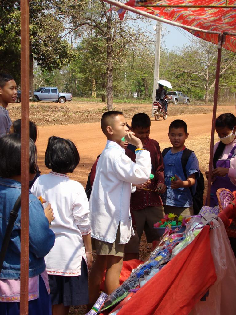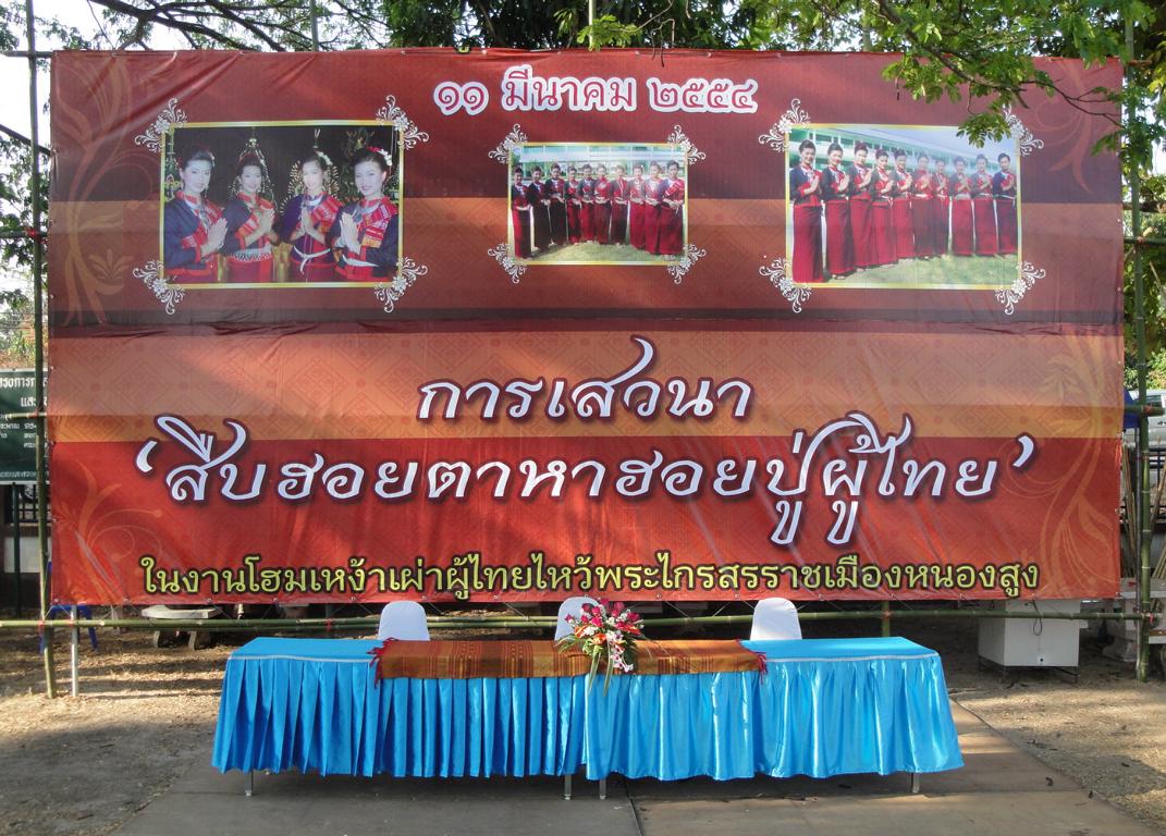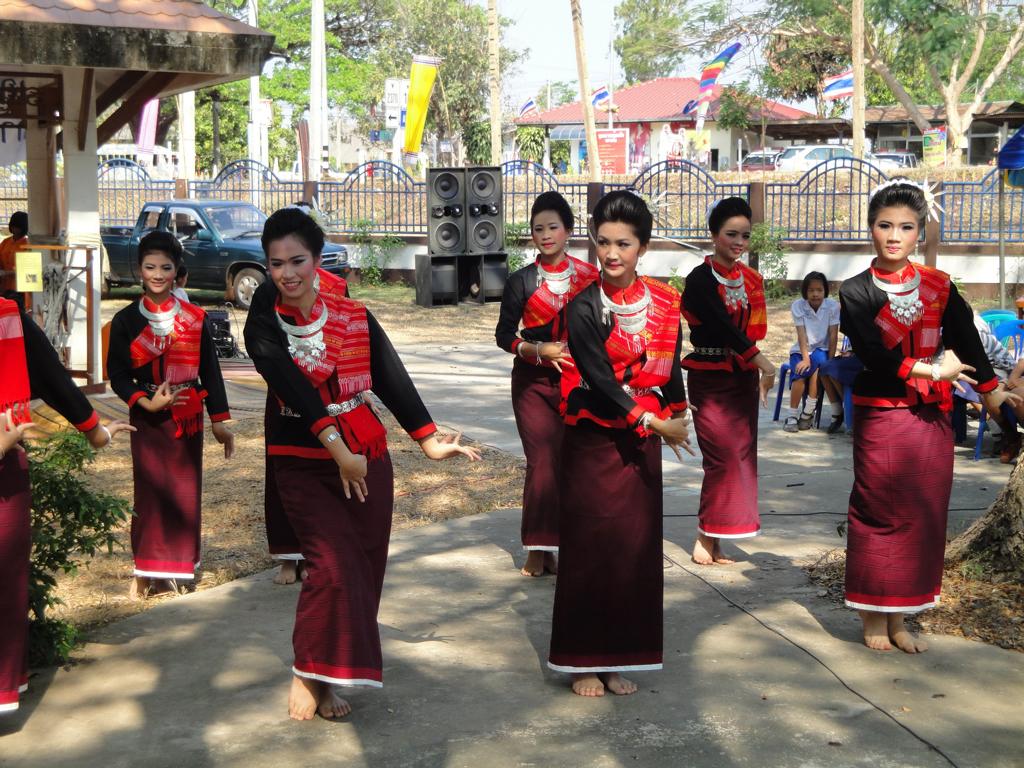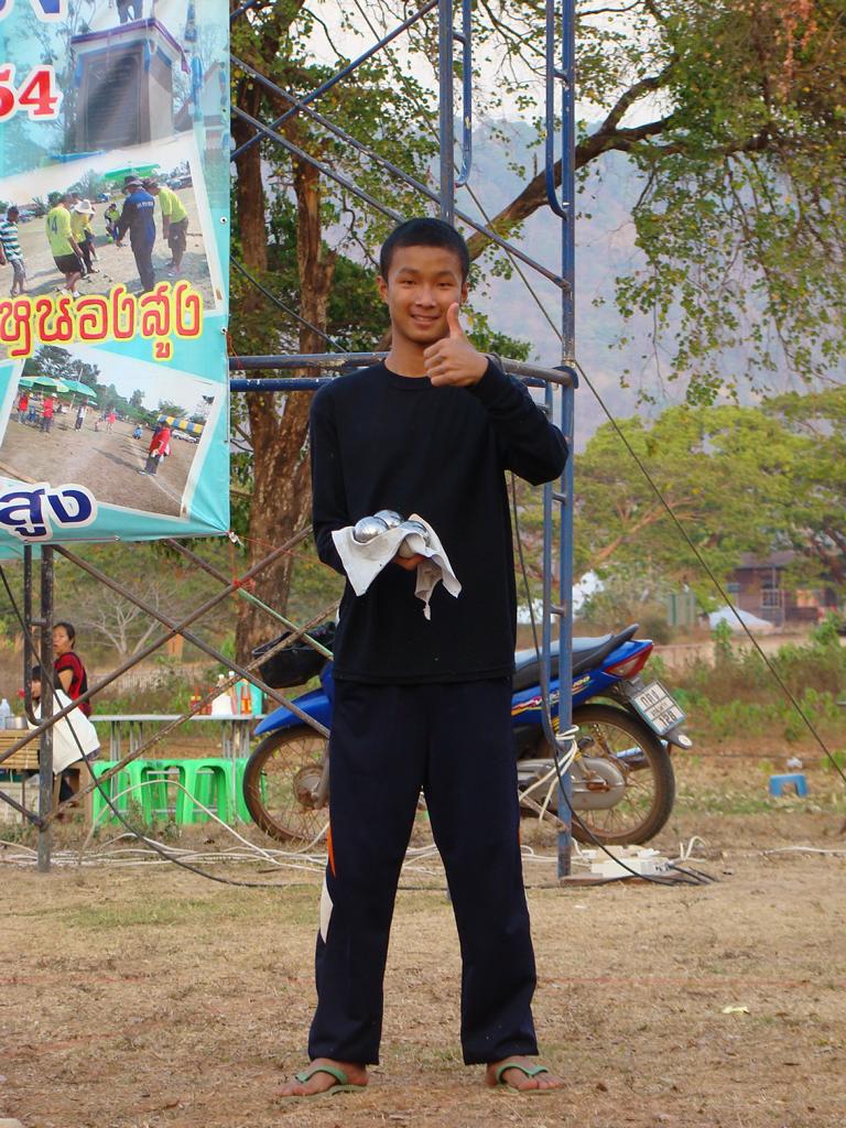 This is the area where the ethnic group of ‚Phu Thai‘ people is living. And the village where I spent 18 months is pretty much in the middle of that area. Die Gruppe der ‚Phu Thai‘ lebt in dem rot markierten Bereich. Das Dorf, in dem ich 18 Monate lebte, befindet sich genau im Zentrum dieses Gebietes.A large banner to promote the festival. Ein großes Plakat wirbt für das Festival.A small, traditonal house in Phu Thai style. Ein kleines, traditionelles Haus im Phu Thai Stil.And a small museum. But I never had the chance to visit it. It was always closed at the time I was living here. Und ein kleines Museum. Aber ich hatte nie die Gelegenheit, es von innen zu sehen. Während ich hier lebte, war es immer geschlossen.A group of young women in traditional dresses during a local dance performance. Eine Gruppe junger Frauen in traditioneller Kleidung bei der Vorführung eines Tanzes.Another part of the show – a role-play on stage. I didn’t understand what it was about. But this guy must have been a hero at that time … Ein weiterer Bestandteil der Veranstaltung – ein Schauspiel auf der Bühne. Ich habe nicht verstanden, worum es ging. Aber der Hauptdarsteller muss zu seiner Zeit ein Held gewesen sein …… and his bodyguard was kind of impressive as well … … und sein Leibwächter sah auch beeindruckend aus …On another stage a „famous superstar“ presented a few songs – supported by young dancers. Auf einer anderen Bühne bot ein ‚bekannter Superstar‘ einige Lieder dar – unterstützt von jungen Tänzerinnen und Tänzern.Dreaming of a career and international fame … Sie träumte wohl von der großen Karriere und internationalem Ruhm …Interesting hairstyle … Interessante Haarpracht …Focussed on … who knows? Konzentriert auf … wer weiss das schon?Did she notice my camera? Ob sie wohl die Kamera bemerkt hat?Looking young – but old and skilled enough to become a dancer and perform on stage. Sie sah jung aus – aber alt und erfahren genug um als Tänzerin auf einer Bühne aufzutreten.No ceremony without praying … Keine Feier ohne Gebet …… although some people were looking quite sceptically. … obwohl einige Leute eher misstrauisch guckten.The headmaster of the primary school in Nong Sung. Der Direktor der Grundschule in Nong Sung.Entertainment for the younger ones … probably the same games everywhere around the world. Unterhaltung für die jüngeren … wahrscheinlich dieselben Spiele wie überall auf der Welt.Ice cream sold good on that day … Eiscreme verkaufte sich gut an dem Tag …One of my students playing Boule or Petanque. Einer meiner Schüler spielt Boule oder auch Petanque.Others competed in Takraw. It’s a common sport in Southeast Asia. A mix of football, volleyball and badminton – without the use of the hands. Andere maßen sich im Takraw. Ein weit verbreiteter Sport in Südostasien. Eine Mischung aus Fußball, Volleyball und Badminton – ohne Gebrauch der Hände.No helmet, no mirrors – no problem. My oncle’s grandfather knows the mother of your brother’s aunt. Or was it the other way around …? Kein Helm, keine Spiegel – kein Problem. Der Großvater meines Onkels kennt die Mutter der Tante deines Bruders. Oder war es umgekehrt …?