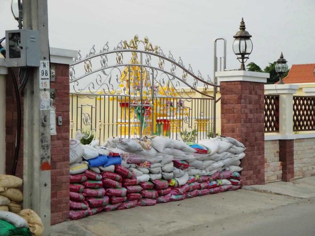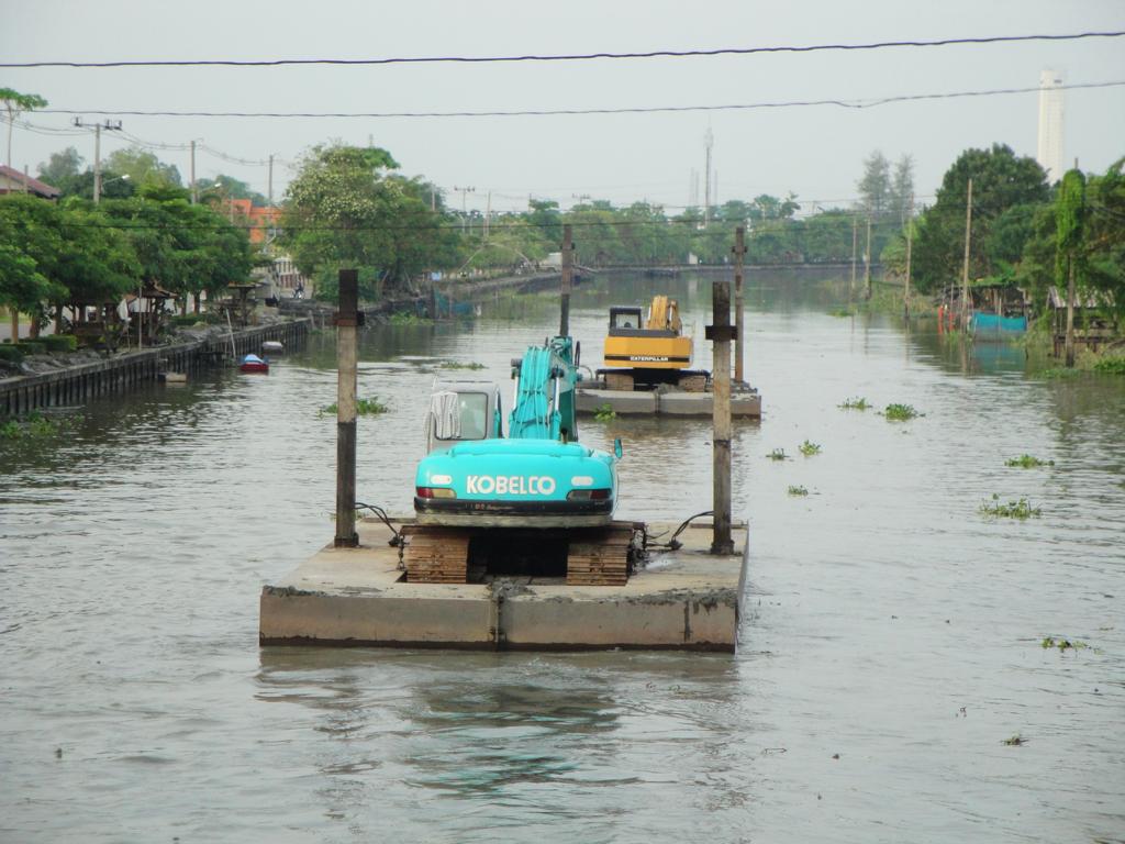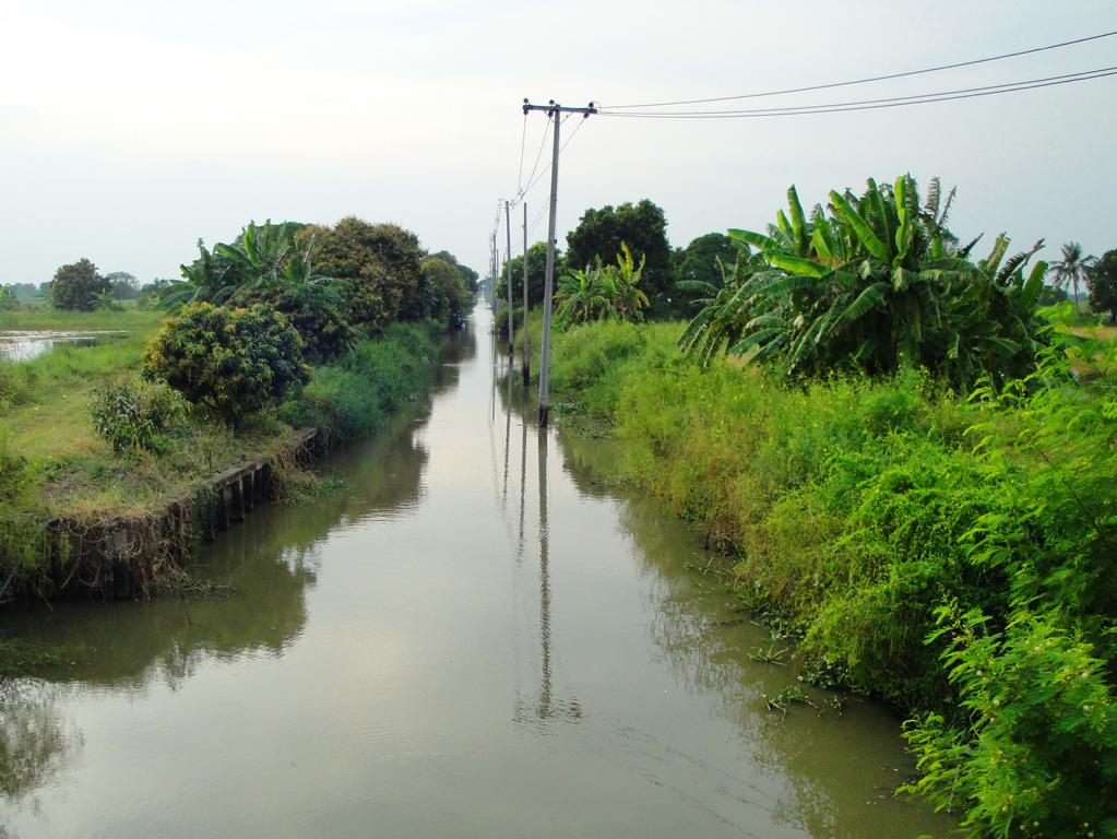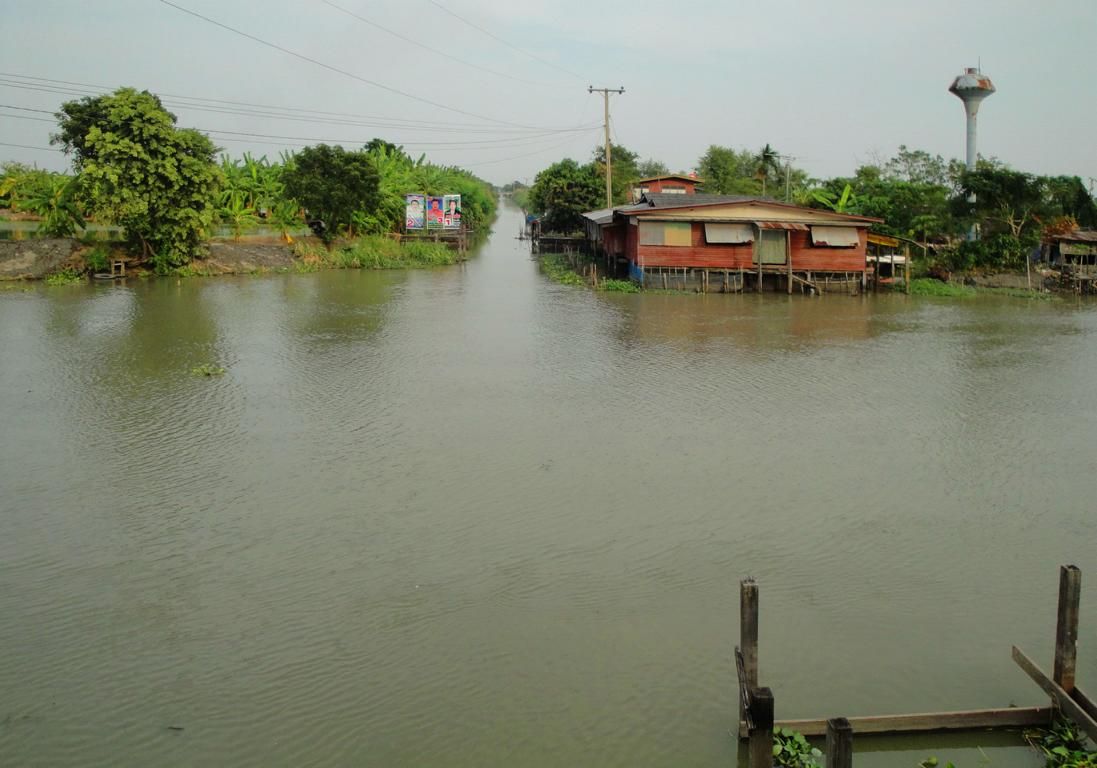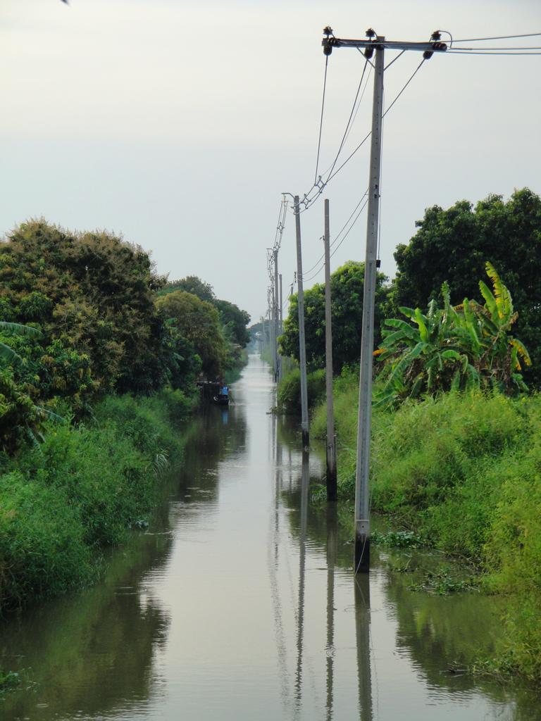 Tour overview … Überblick …I always thought it’s a mosque. But much later I found out that it’s just the office of a steel company. Zuerst dachte ich, es würde sich um eine Moschee handeln. Erst viel später habe ich erfahren, daß es das Verwaltungsgebäude einer Stahlfirma ist.First sign of the school. Das erste Hinweisschild zur Schule.Here we go … Angekommen …Really nothing special here. The „gymnasium“ on the left. It’s a hall for meetings, ceremonies and indoor sports like badminton. Then, with the red roof, a building providing space for an IT class and to store some staff for ceremonies. The director and the teachers had their rooms in the building in the center (black roof, white walls). Then the green building – the small canteen. Nichts Besonderes hier. Das „Gymnasium“ links. Eine große Halle für Versammlungen, Feiern und Hallensportarten wie Badminton. Dann, mit dem roten Dach, ein Gebäude für EDV Unterricht und kleine Lagerflächen für Feierlichkeiten. Der Direktor und die Lehrer waren in dem Gebäude in der Bildmitte untergebracht. Und die grüne Kantine.Two buildings in the background for the classrooms. Zwei Gebäude mit Klassenräumen im Hintergrund.Lilawadee decoration on a small fountain. Lilawadee means Plumeria or Frangipani. Verzierung an einem kleinen Springbrunnen. Die Pflanze heißt Plumeria oder Frangipani.Yes, it was the time of serious floodings … Ja, die Zeit der Überschwemmungen war noch nicht vorüber.Better be on the safe side … Da war man besser auf der sicheren Seite …An excavator on a pontoon … Man glaubt es kaum. Aber der Bagger auf dem Ponton hat sich durch ‚Baggerbewegungen‘ im Wasser tatsächlich fortbewegt …… followed by another one! Are they racing against each other? Und da kam noch einer! Ob die sich ein Rennen geliefert haben?And off they go … Und dann fuhren sie fort …Many small, narrow branch canals in this area. In dieser Gegend gab es noch viele kleine, schmale Kanäle.Streching deep inside more remote areas of Samut Prakan … Sie erstreckten sich bis tief in das entfernte Hinterland der Provinz Samut Prakan …But electricity is a „must have“. Aber ohne Elektrizität geht es nicht.The boat looks really tiny there … Das Boot sieht eher klein aus …Banana man is coming … Der Mann mit den Bananen kommt …And another „trustworthy“ construction … Und noch eines diese „vertrauenswürdigen“ Gebilde …