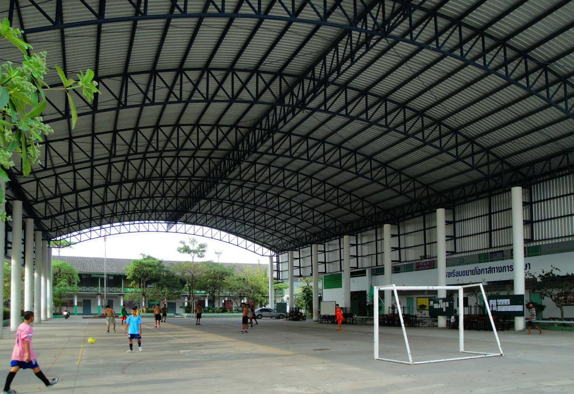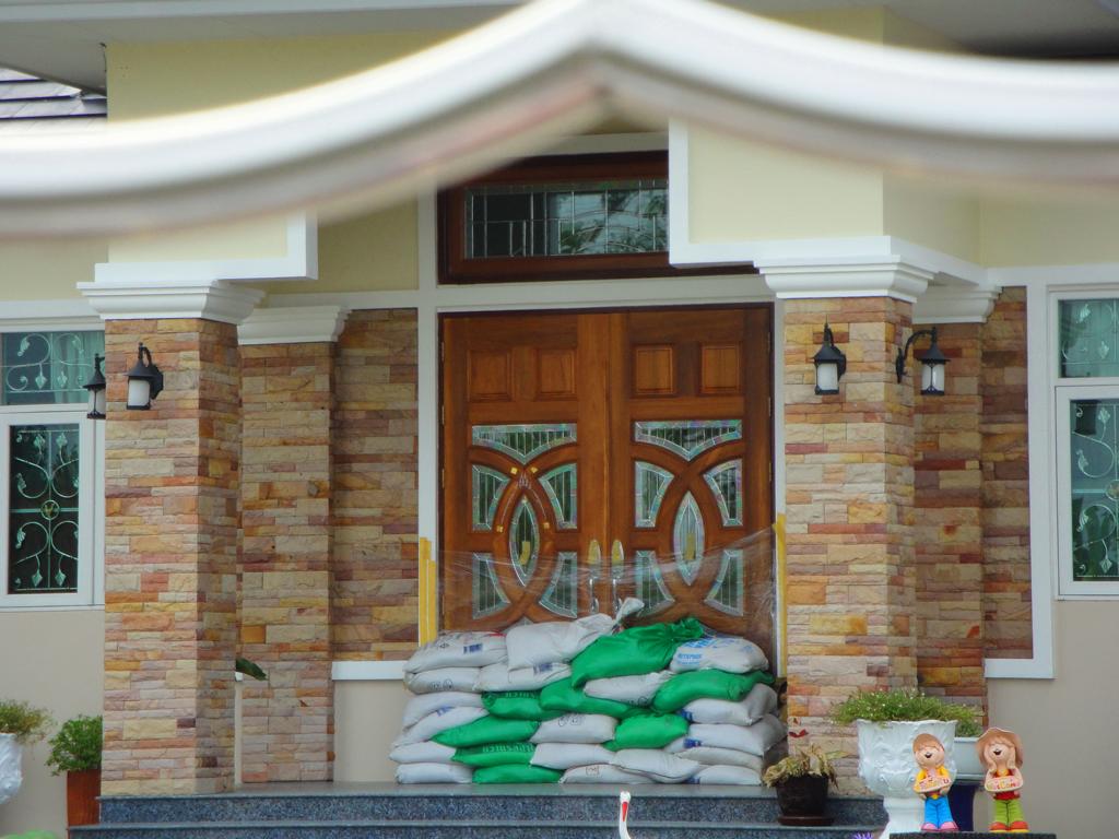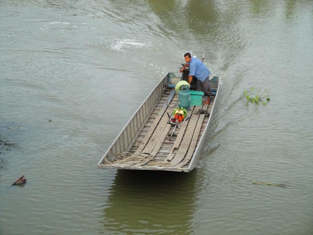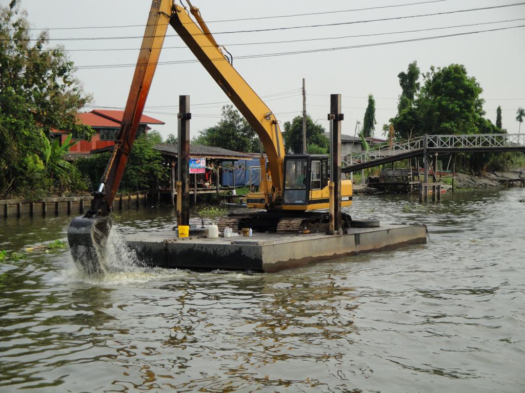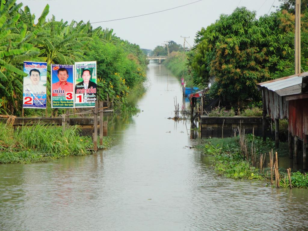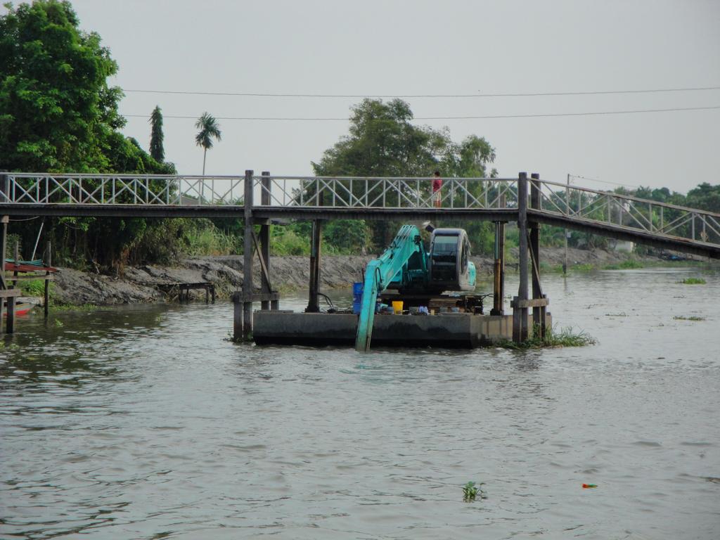 Tour overview … Überblick …I always thought it’s a mosque. But much later I found out that it’s just the office of a steel company. Zuerst dachte ich, es würde sich um eine Moschee handeln. Erst viel später habe ich erfahren, daß es das Verwaltungsgebäude einer Stahlfirma ist.First sign of the school. Das erste Hinweisschild zur Schule.Here we go … Angekommen …Really nothing special here. The „gymnasium“ on the left. It’s a hall for meetings, ceremonies and indoor sports like badminton. Then, with the red roof, a building providing space for an IT class and to store some staff for ceremonies. The director and the teachers had their rooms in the building in the center (black roof, white walls). Then the green building – the small canteen. Nichts Besonderes hier. Das „Gymnasium“ links. Eine große Halle für Versammlungen, Feiern und Hallensportarten wie Badminton. Dann, mit dem roten Dach, ein Gebäude für EDV Unterricht und kleine Lagerflächen für Feierlichkeiten. Der Direktor und die Lehrer waren in dem Gebäude in der Bildmitte untergebracht. Und die grüne Kantine.Two buildings in the background for the classrooms. Zwei Gebäude mit Klassenräumen im Hintergrund.Lilawadee decoration on a small fountain. Lilawadee means Plumeria or Frangipani. Verzierung an einem kleinen Springbrunnen. Die Pflanze heißt Plumeria oder Frangipani.Yes, it was the time of serious floodings … Ja, die Zeit der Überschwemmungen war noch nicht vorüber.Better be on the safe side … Da war man besser auf der sicheren Seite …An excavator on a pontoon … Man glaubt es kaum. Aber der Bagger auf dem Ponton hat sich durch ‚Baggerbewegungen‘ im Wasser tatsächlich fortbewegt …… followed by another one! Are they racing against each other? Und da kam noch einer! Ob die sich ein Rennen geliefert haben?And off they go … Und dann fuhren sie fort …Many small, narrow branch canals in this area. In dieser Gegend gab es noch viele kleine, schmale Kanäle.Streching deep inside more remote areas of Samut Prakan … Sie erstreckten sich bis tief in das entfernte Hinterland der Provinz Samut Prakan …But electricity is a „must have“. Aber ohne Elektrizität geht es nicht.The boat looks really tiny there … Das Boot sieht eher klein aus …Banana man is coming … Der Mann mit den Bananen kommt …And another „trustworthy“ construction … Und noch eines diese „vertrauenswürdigen“ Gebilde …
