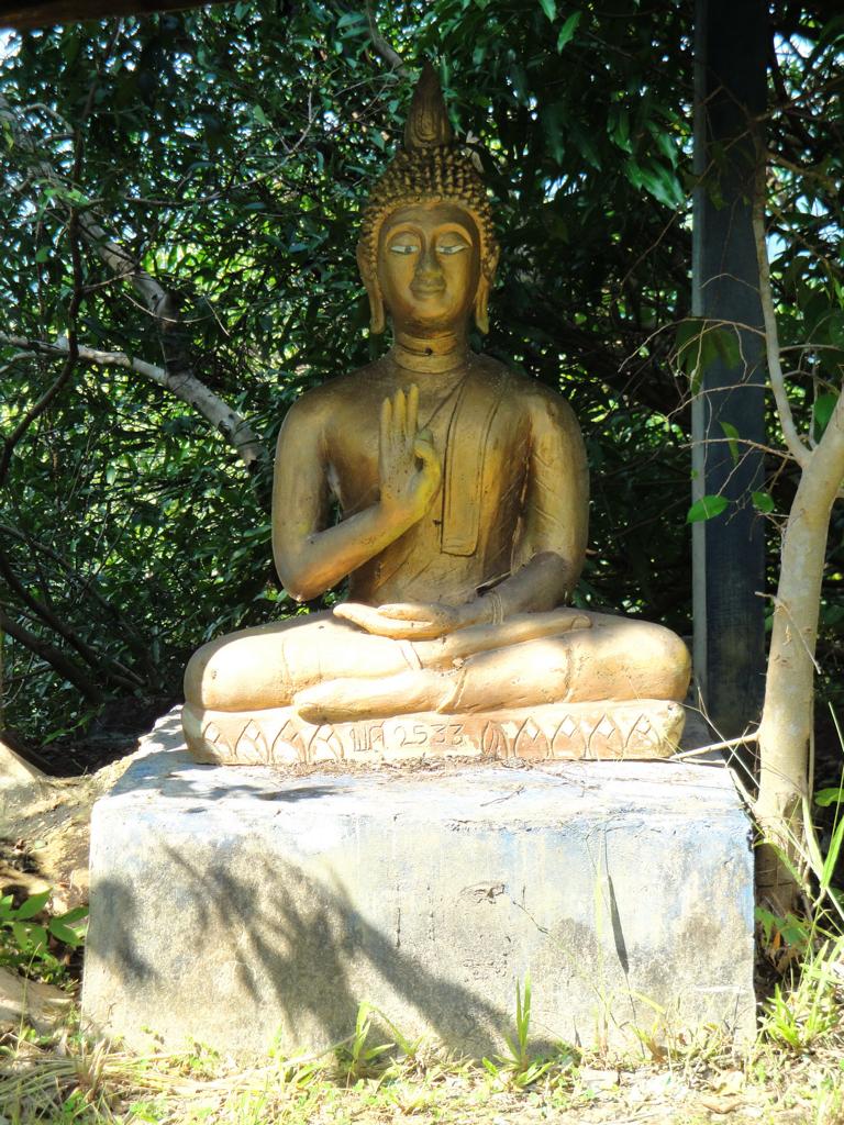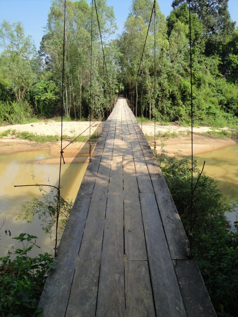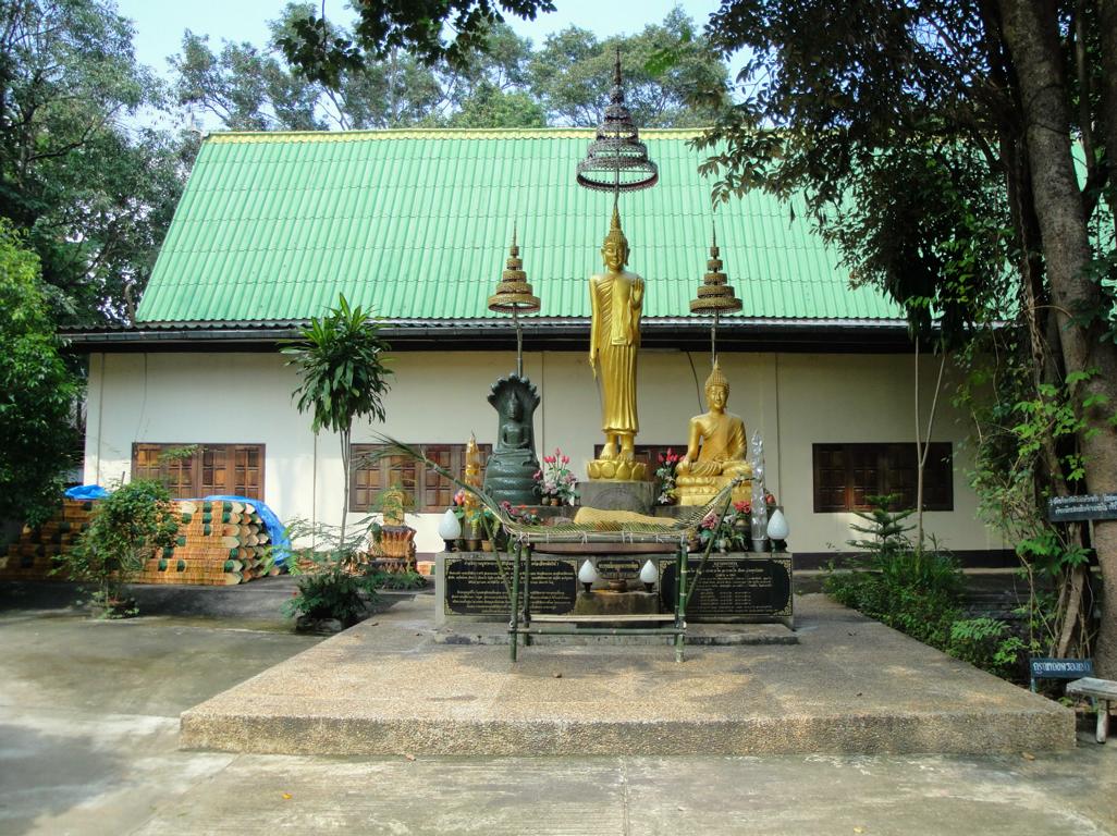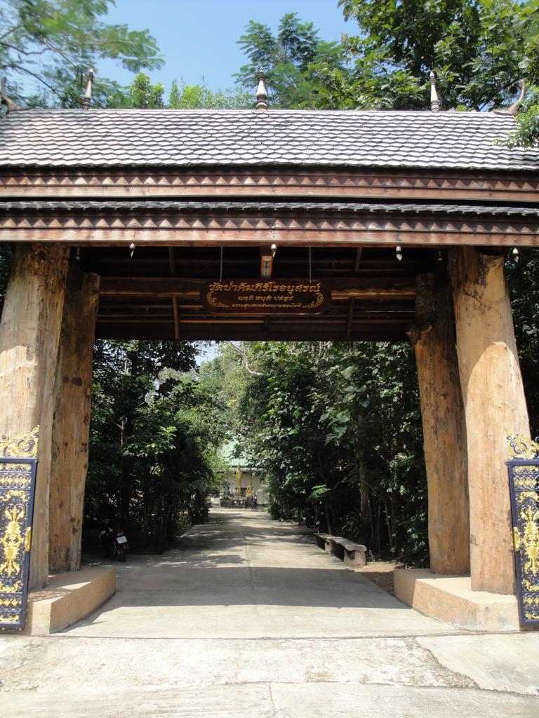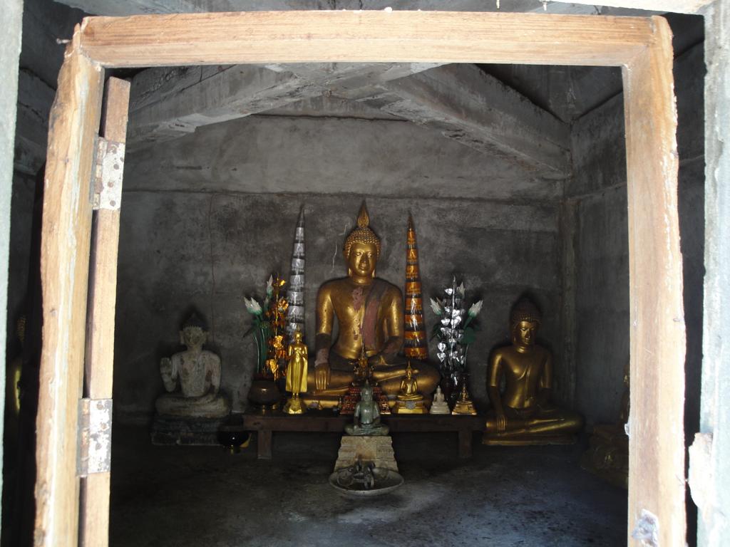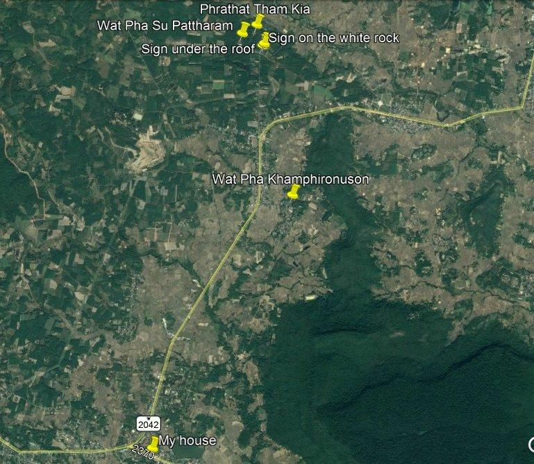 The area along the main road to Mukdahan (which is in the upper right corner – but not in this map anymore). Die Karte zeigt den Bereich der Hauptstraße nach Mukdahan (die Stadt liegt weiter oben rechts – ist aber auf dieser Karte nicht mehr zu sehen).The massive, wooden entrance to Wat Pha Khamphironuson. Der wuchtige, hölzerne Eingang zum Pha Khamphironuson Tempel.A small altar with 3 different Buddha statues in front of the main building. Not really spectecular … Ein kleiner Altar mit drei verschiedenen Buddhafiguren. Nicht wirklich beeindruckend …Somewhere nearby I saw the old man waiting for … whatever. Irgendwo in der Nähe entdeckte ich den alten Mann, der auf … was auch immer wartete.The Buddhist wheel on a ‚golden‘ podium. Das buddhistische Rad auf einem ‚goldenen‘ Sockel.A new building under construction. But … in the water? Ein neues Gebäude im Bau. Aber … im Wasser?In Thailand it’s quite common to use rocks as surface for signs. Here you see the sign of … In Thailand ist es ziemlich weit verbreitet, Felsen als Untergrund von Hinweisschildern zu nutzen. Hier sieht man den Hinweis zum …… Wat Pha Su Pattharam. … Pha Su Pattharam Tempel.It appeared to be made entirely of wood. Er schien komplett aus Holz erbaut worden zu sein.The shiny, polished floor gave it a special, clean brighter look than expected. Der glänzende, polierte Boden sorgte für einen ganz besonderen, saubereren Eindruck als erwartet.The old sign of Phrathat Tham Kia. Das alte Zeichen der Pagode Phrathat Tham Kia.Shame on me: I don’t even know how to call this kind of building. It’s neither a typical chedi nor a stupa. Asche über mein Haupt. Ich weiß nicht mal wie man diese Art von Gebäude nennt. Es handelt sich weder um einen typischen Chedi noch um eine Stupa.But the sunlight made it look interesting enough to have a closer look … Aber durch das Sonnenlicht erschien das Gebäude interessant genug um genauer nachzusehen …… and discover a small altar inside – decorated with several Buddha images. … und dabei im Inneren diesen kleinen Altar zu entdecken – geschmückt mit mehreren Buddhafiguren.The walls were decorated with images of antique dancers. Even nowadays you see people wearing this kind of outfit during certain celebrations. Die Wände waren mit Abbildern antiker Tänzer verziert. Sogar heute noch sieht man Leute, die zu bestimmten Gelegenheiten derartige Kleidung tragen.Old – but beautiful. Alt – aber schön.Even the Buddha statue looked a bit … older. Sogar die Buddhafigur sah etwas … älter aus.In Germany I never missed ‚mother nature‘. But I got used to it in Mukdahan and learned to like it somehow. Sometimes I miss the area around Nong Sung … In Deutschland hatte ich nie Sehnsucht nach ‚Mutter Natur‘. Aber in Mukdahan habe ich mich daran gewöhnt und gelernt, sie irgendwie zu mögen. Manchmal vermisse ich die Gegend um Nong Sung …… with its wildlife and … … mit ihren wilden Tieren …… adventurous bridges … … abenteuerlichen Brücken …… over small, peaceful creeks. … über kleine, friedliche Bachläufe.