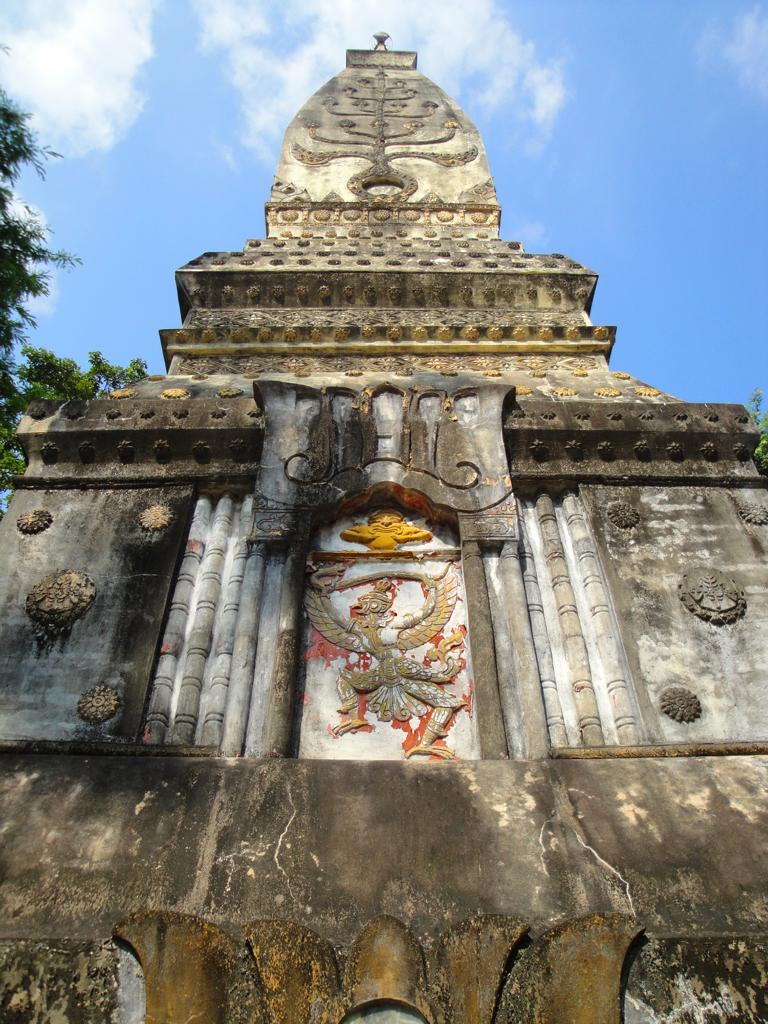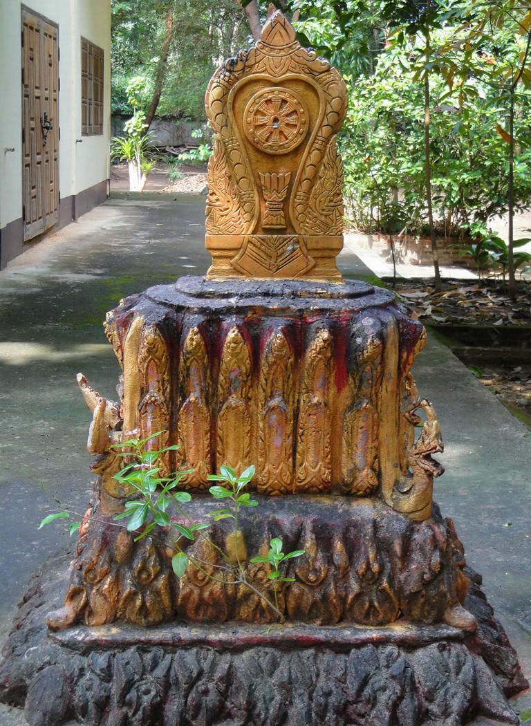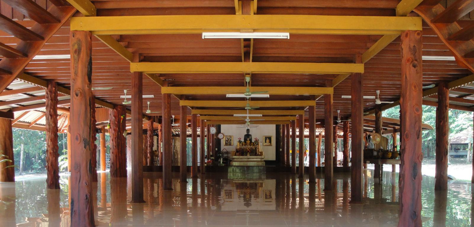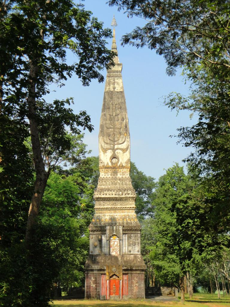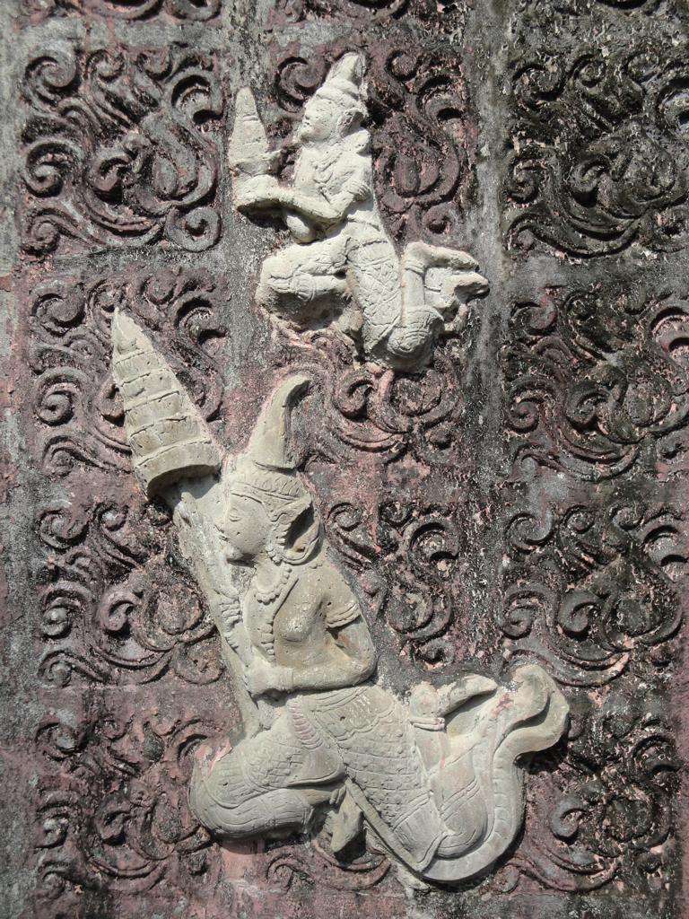 The area along the main road to Mukdahan (which is in the upper right corner – but not in this map anymore). Die Karte zeigt den Bereich der Hauptstraße nach Mukdahan (die Stadt liegt weiter oben rechts – ist aber auf dieser Karte nicht mehr zu sehen).The massive, wooden entrance to Wat Pha Khamphironuson. Der wuchtige, hölzerne Eingang zum Pha Khamphironuson Tempel.A small altar with 3 different Buddha statues in front of the main building. Not really spectecular … Ein kleiner Altar mit drei verschiedenen Buddhafiguren. Nicht wirklich beeindruckend …Somewhere nearby I saw the old man waiting for … whatever. Irgendwo in der Nähe entdeckte ich den alten Mann, der auf … was auch immer wartete.The Buddhist wheel on a ‚golden‘ podium. Das buddhistische Rad auf einem ‚goldenen‘ Sockel.A new building under construction. But … in the water? Ein neues Gebäude im Bau. Aber … im Wasser?In Thailand it’s quite common to use rocks as surface for signs. Here you see the sign of … In Thailand ist es ziemlich weit verbreitet, Felsen als Untergrund von Hinweisschildern zu nutzen. Hier sieht man den Hinweis zum …… Wat Pha Su Pattharam. … Pha Su Pattharam Tempel.It appeared to be made entirely of wood. Er schien komplett aus Holz erbaut worden zu sein.The shiny, polished floor gave it a special, clean brighter look than expected. Der glänzende, polierte Boden sorgte für einen ganz besonderen, saubereren Eindruck als erwartet.The old sign of Phrathat Tham Kia. Das alte Zeichen der Pagode Phrathat Tham Kia.Shame on me: I don’t even know how to call this kind of building. It’s neither a typical chedi nor a stupa. Asche über mein Haupt. Ich weiß nicht mal wie man diese Art von Gebäude nennt. Es handelt sich weder um einen typischen Chedi noch um eine Stupa.But the sunlight made it look interesting enough to have a closer look … Aber durch das Sonnenlicht erschien das Gebäude interessant genug um genauer nachzusehen …… and discover a small altar inside – decorated with several Buddha images. … und dabei im Inneren diesen kleinen Altar zu entdecken – geschmückt mit mehreren Buddhafiguren.The walls were decorated with images of antique dancers. Even nowadays you see people wearing this kind of outfit during certain celebrations. Die Wände waren mit Abbildern antiker Tänzer verziert. Sogar heute noch sieht man Leute, die zu bestimmten Gelegenheiten derartige Kleidung tragen.Old – but beautiful. Alt – aber schön.Even the Buddha statue looked a bit … older. Sogar die Buddhafigur sah etwas … älter aus.In Germany I never missed ‚mother nature‘. But I got used to it in Mukdahan and learned to like it somehow. Sometimes I miss the area around Nong Sung … In Deutschland hatte ich nie Sehnsucht nach ‚Mutter Natur‘. Aber in Mukdahan habe ich mich daran gewöhnt und gelernt, sie irgendwie zu mögen. Manchmal vermisse ich die Gegend um Nong Sung …… with its wildlife and … … mit ihren wilden Tieren …… adventurous bridges … … abenteuerlichen Brücken …… over small, peaceful creeks. … über kleine, friedliche Bachläufe.