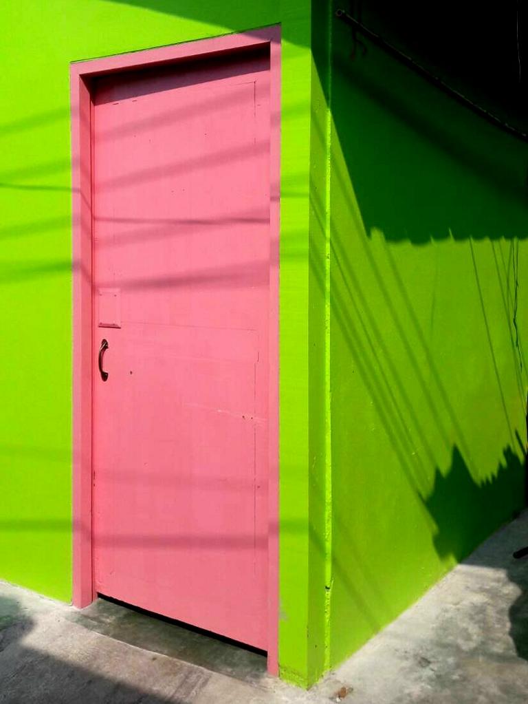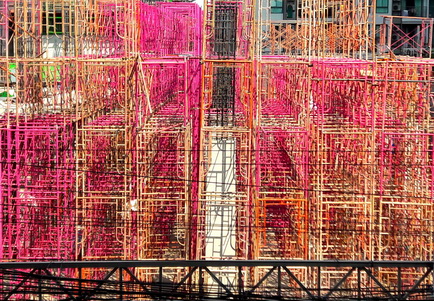 Pink and orange scaffolds. Pink- und orangefarbige Gerüste.