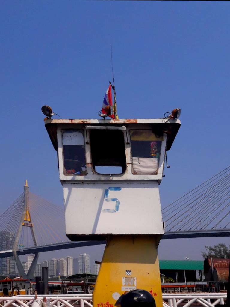 Captain’s place on a ferry across the Chaophraya river. Hier oben auf der Fähre über den Chaophraya regiert der Kapitän.