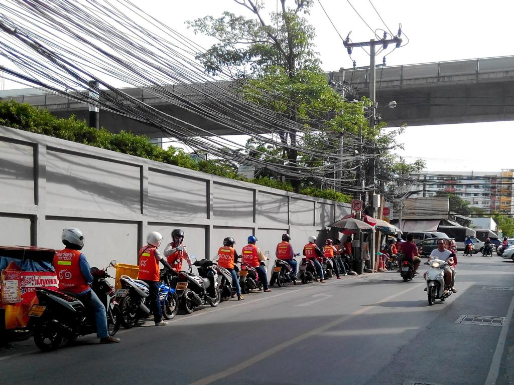 Only a few out of more than 150 motorcycle taxi drivers on this intersection … Nur einige der mehr als 150 an dieser Straßenecke registrierten Motorcycletaxifahrer …