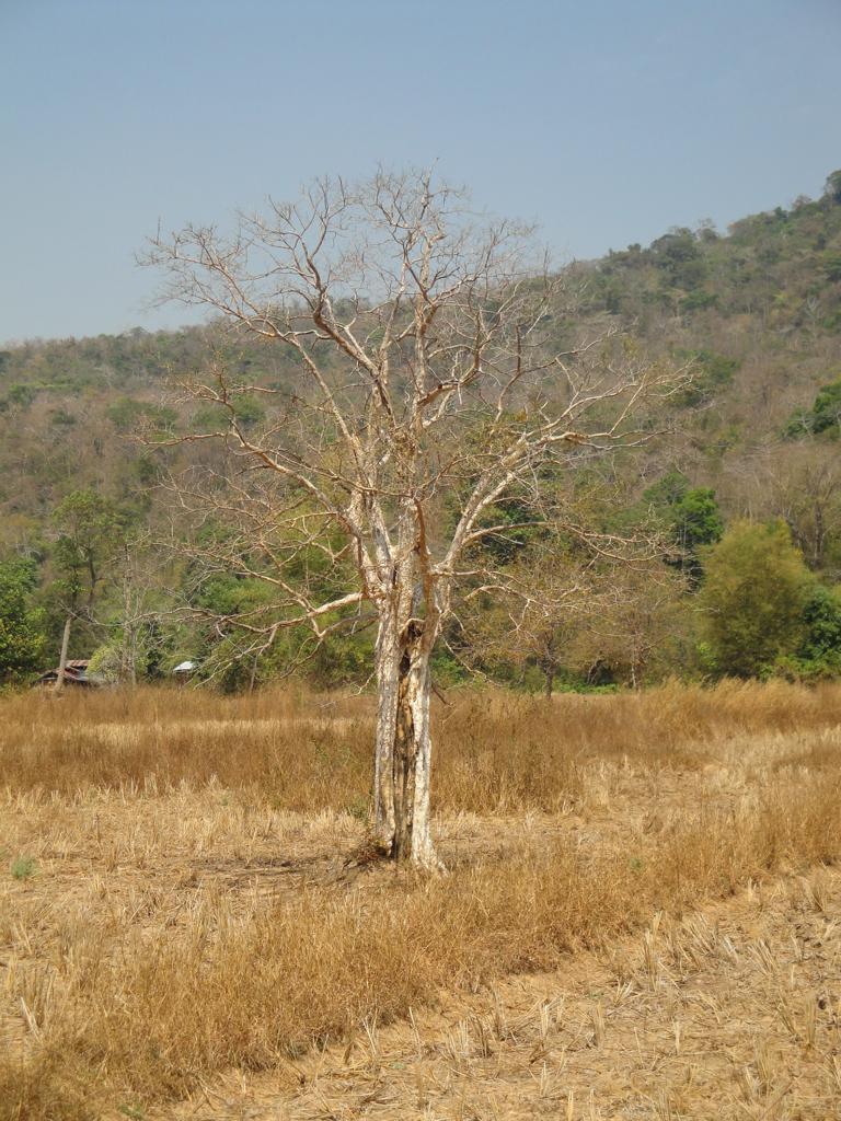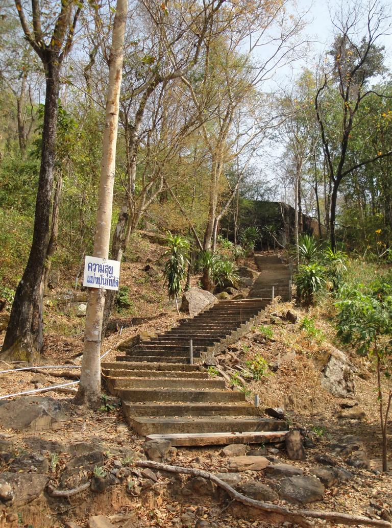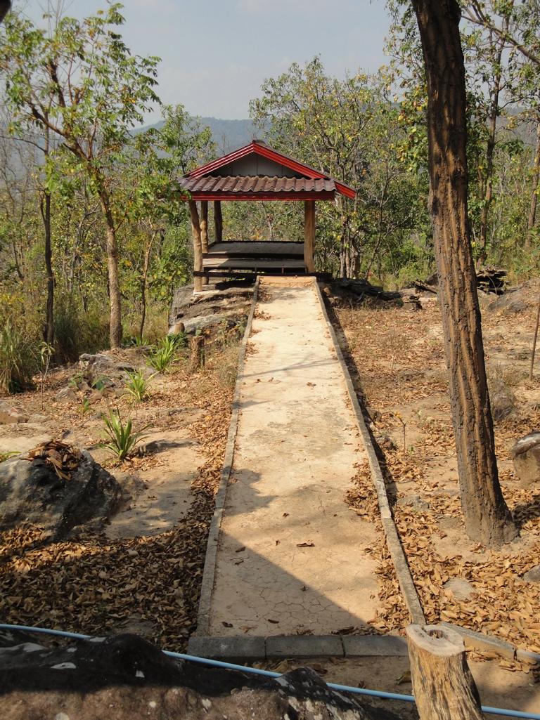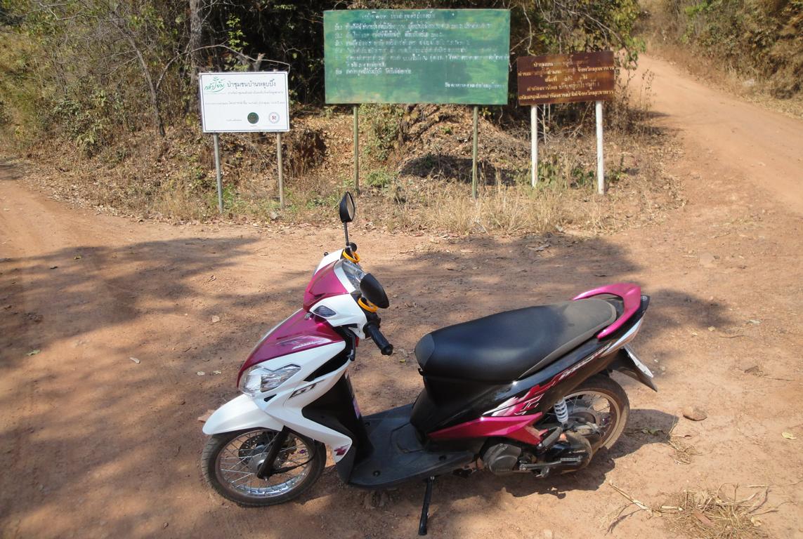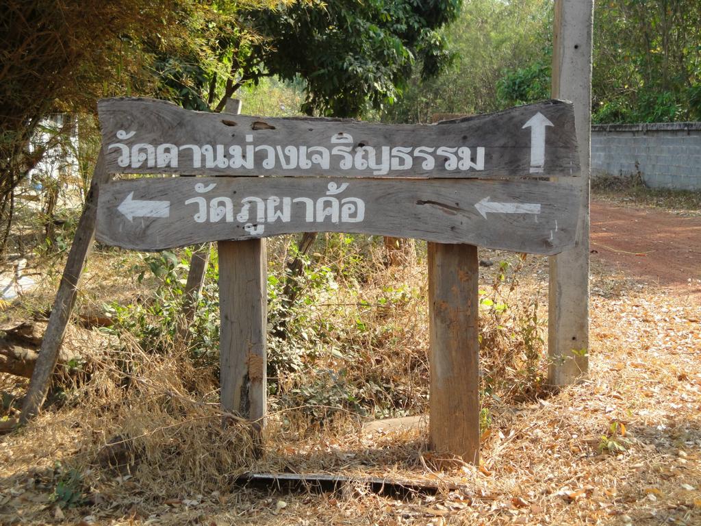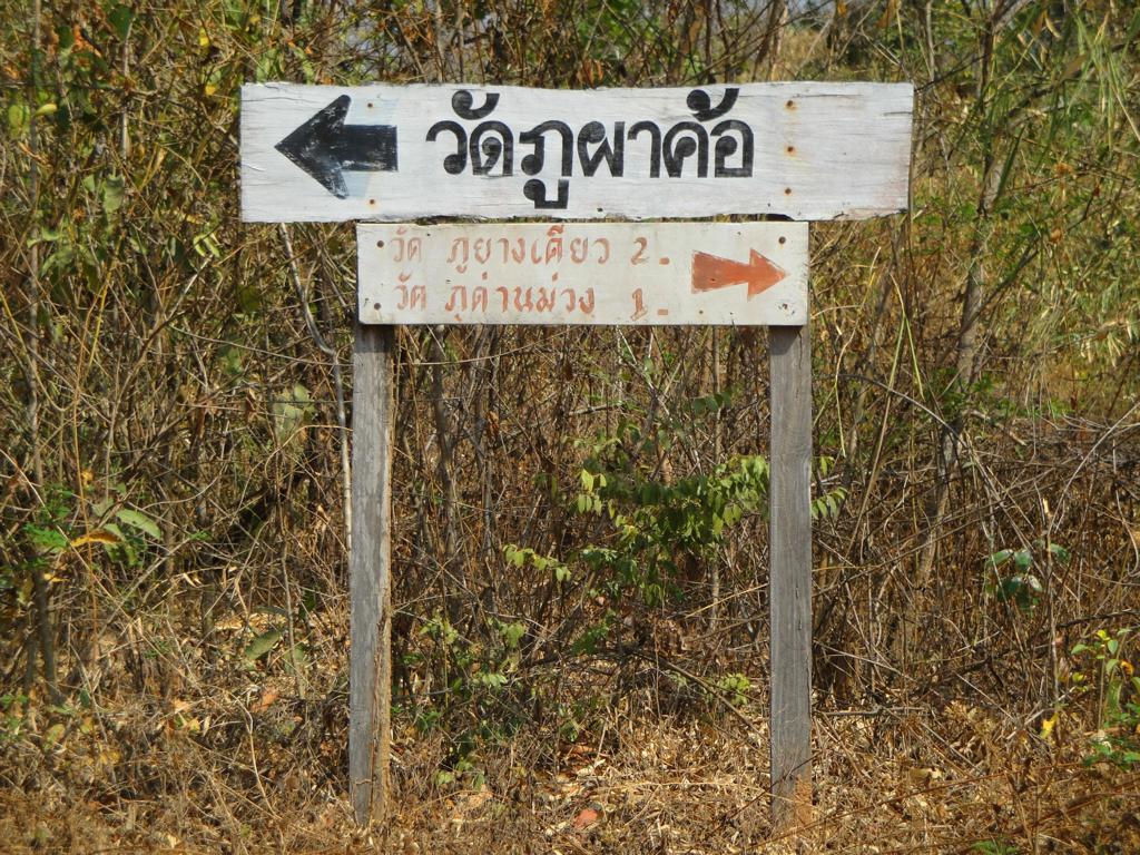 Tour overview … Überblick …I can’t remember why I took this photo. I’m sure that it doesn’t show the way I took on the motorcycle … Maybe I liked the contrast between the brown rocks; the dry, beige thatch; the few green leaves and the blue sky … Ich kann mich nicht erinnern, warum ich dieses Foto gemacht habe. Mit Sicherheit zeigt es nicht den Weg den ich mit dem Roller genommen habe … Vielleicht gefiel mir der Kontrast zwischen den braunen Steinen, dem trockenen, beigefarbigen Stroh und dem blauen Himmel …It was the second time that I saw and entered an area full of these shrubs full of long, hard thorns. I don’t know what kind of plant it is though … Es war das zweite Mal, daß ich eine Gegend, in der diese Sträucher voll langer, harter Dornen wuchsen, sah und betrat. Trotzdem ist mir bis heute nicht klar, um welche Art von Gesträuch es sich handelte …Maybe, a botanical expert can provide some information … Vielleicht kann ja ein Fachmann der Botanik etwas zur Aufklärung beitragen …A bell? It looked like a bell, it sounded like a bell – it was a bell. Any church nearby? No. Then there must be a temple – but where? And which one? I can’t remember. Eine Glocke? Es sah aus wie eine Glocke, es klang wie eine Glocke – es war eine Glocke. gab es eine Kirche in der Nähe? Nein. Dann wohl ein Tempel – aber wo? Und welcher Tempel? Ich habe es vergessen.I have to apologize for not being able to provide more info on names or places. I went on this tour more than 13 years ago and never had in mind to publish any photos. At this time it was nothing more than 1 tour out of many others. It took me long time already to find out the names in the map above because this area is not attractive for mass tourism – and thus the map based information is rare. Ich muss mich dafür entschuldigen, daß ich nicht mehr Angaben zu Namen oder Orten machen kann. Diese Tour habe ich vor etwa dreizehn Jahren gemacht und hatte zu dem Zeitpunkt nicht die Absicht, irgendwelche Fotos in der Öffentlichkeit zu zeigen. Zu der Zeit war dies nur eine von vielen Touren. Es hat mich schon viel Zeit gekostet, die Bezeichnungen in der Übersichtskarte zu finden weil dies keine Gegend ist, die für den Massentourismus bedeutsam ist – und deshalb gibt es auch kaum Karten mit genaueren Angaben.Probably some kind of Thai vegetables, salad … no idea. But I liked the colours, the shadow and the long rows … Wahrscheinlich irgendeine Art von thailändischem Gemüse, Salat … keine Ahnung. Aber mir gefielen die Farben, die Schatten und die langen Reihen …A bit later I found myself in a basin, surrounded by mountains and populated by buffaloes. Etwas später fand ich mich in einem Talbecken wieder, umgeben von Bergen und besiedelt von Büffeln.That’s there I came from … Von dort bin ich gekommen …Even the buffalo thought: ‚Hey, what is that pale foreigner doing here?‘ It was very quiet here and I felt that the sound of my motorcycle was disturbing every animal around here … Sogar der Büffel dachte sich: ‚Hey, was macht das Bleichgesicht denn hier?‘ Es war sehr still her und ich konnte spüren, daß der Motor meines Rollers jedes Lebewesen hier störte …Somewhere in … it could be at many other countries in the world. Irgendwo in … es hätte in vielen anderen Ländern der Erde sein können.If someone was living here? I didn’t want to find out … I mean, I was not scared of anything. But the silence and very remote place made me feel a bit cowed though. Ob hier jemand lebte? Ich wollte es nicht herausfinden … Ich meine, ich hatte keine Angst. Aber die Stille und der abgelegene Ort hier sorgten doch dafür, daß ich mich etwas eingeschüchtert fühlte.A last picture of the nature in the basin – then back towards … Ein letztes Bild der Natur in dem Tal – dann ging es zurück in Richtung …… fucked up civilization. … verdreckter Zivilisation.Steel pipes, concrete – Wow. One of the better bridges … although something on the left side went missing … Stahlrohre und Beton – wow. Eine der besseren Brücken … obwohl links doch einiges fehlte …It’s always good to have some trees on hand … otherwise the two planks could not have been fixed there. Es ist doch immer gut, einige Bäume zur Hand zu haben … sonst hätte man ja die zwei Bretter nicht dort anbringen können.Shadowman … Der Schattenmann …Another dead tree. But wait … who said dead? Look, there are some green leaves. Noch ein toter Baum. Aber stop … wer sprach von tot? Guck mal, da sind einige grüne Blätter.The first sign of Wat Phu Pha Kor. No further direction given – I think, I have been there. But it can’t have been very impressive because I didn’t take any photos. Das erste Schild des Phu Pha Kor Tempels. Ohne Richtungsangabe – ich glaube, ich bin schon mal dort gewesen. Aber es kann nicht besonders beeindruckend gewesen sein weil ich keine Fotos gemacht habe.Riding up along the mountainside on a new, solid and relatively smooth surface until … Aufwärts entlang der Bergflanke auf einem neuen Weg mit fester und ziemlich glatter Oberfläche bis …… it changed back to the common, red and dusty mix of sand, rocks and leaves. … sich diese wieder in den üblichen, roten und staubigen Mix aus Sand, Steinen und Blättern verwandelte.That looked like the meditation treadmill of a temple. But where is the temple? Sah aus wie einer dieser Pfade, auf denen die Mönche beim Meditieren wandeln. Aber wo war der Tempel?The sign says something regarding ‚luck‘. I guess it’s an encouragement to climb up the stairs … Auf dem Schild stand etwas von ‚Glück‘. Ich denke, das war eine Aufforderung, die Stufen nach oben zu steigen …Three temples to visit: Wat Phu Pha Kor to the left. Wat Phuyang Diao and Wat Phu Dan Muang to the right … I don’t know which one I passed already or which one might be just ahead … Drei Tempel in der Nähe: Der Phu Pha Kor Tempel li