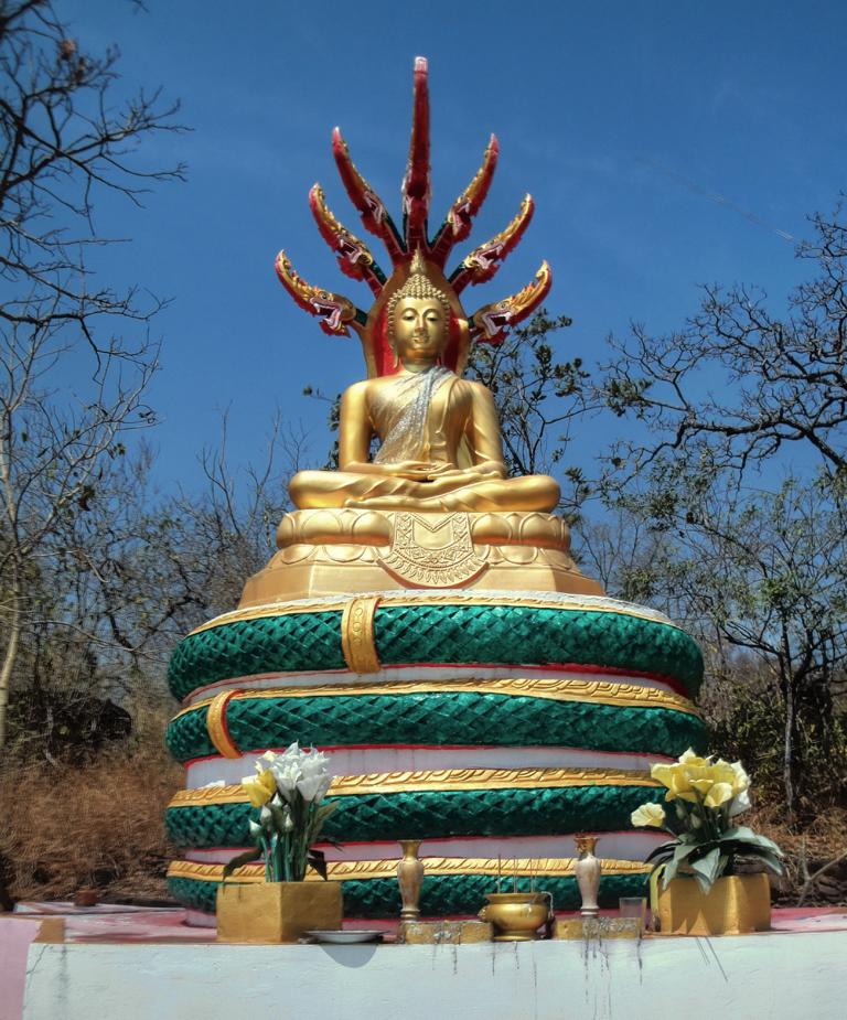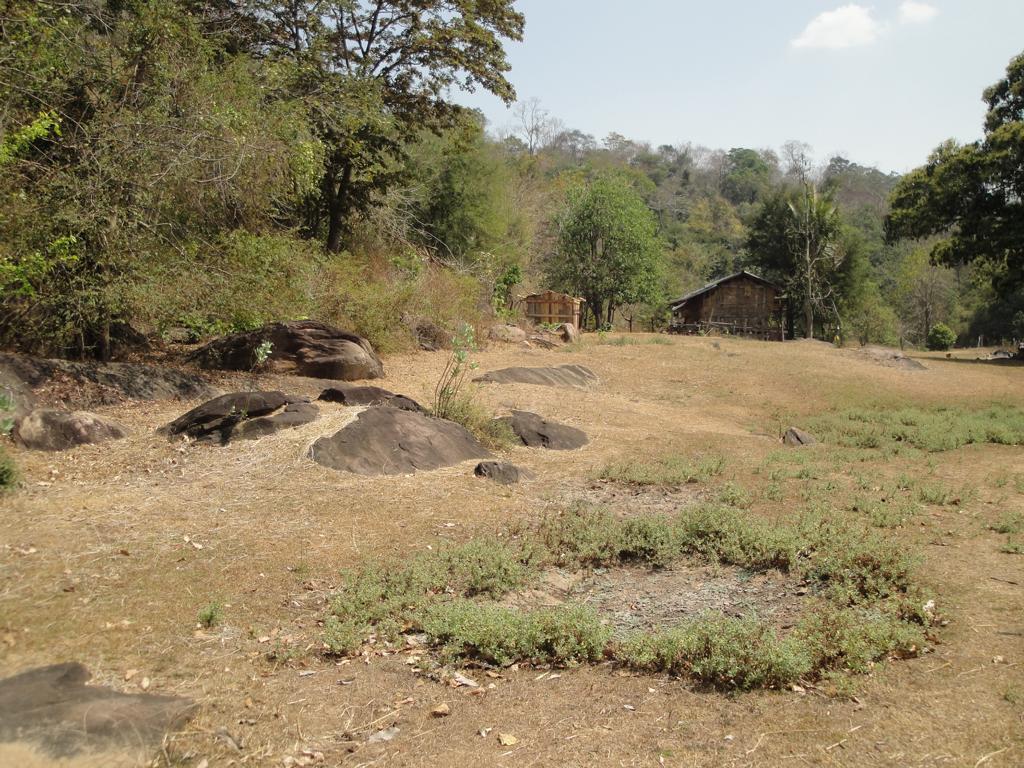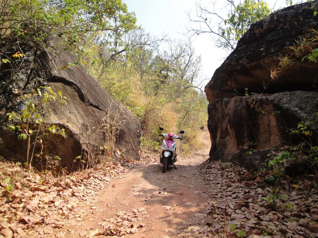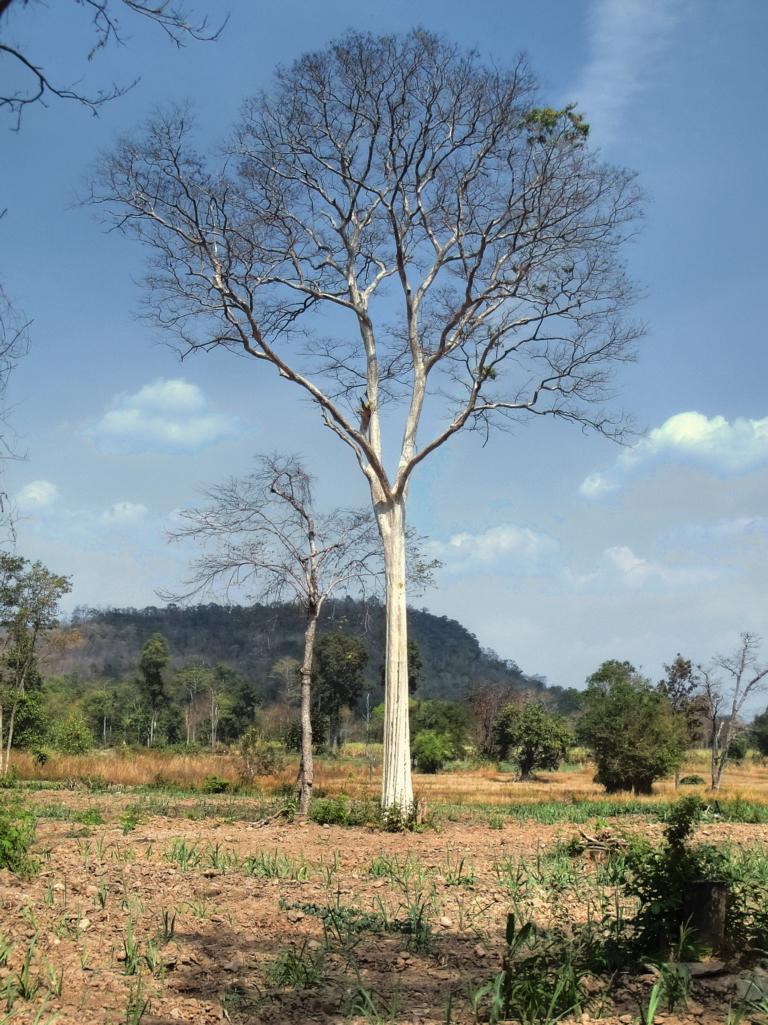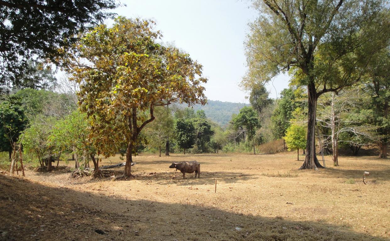 Tour overview … Überblick …I can’t remember why I took this photo. I’m sure that it doesn’t show the way I took on the motorcycle … Maybe I liked the contrast between the brown rocks; the dry, beige thatch; the few green leaves and the blue sky … Ich kann mich nicht erinnern, warum ich dieses Foto gemacht habe. Mit Sicherheit zeigt es nicht den Weg den ich mit dem Roller genommen habe … Vielleicht gefiel mir der Kontrast zwischen den braunen Steinen, dem trockenen, beigefarbigen Stroh und dem blauen Himmel …It was the second time that I saw and entered an area full of these shrubs full of long, hard thorns. I don’t know what kind of plant it is though … Es war das zweite Mal, daß ich eine Gegend, in der diese Sträucher voll langer, harter Dornen wuchsen, sah und betrat. Trotzdem ist mir bis heute nicht klar, um welche Art von Gesträuch es sich handelte …Maybe, a botanical expert can provide some information … Vielleicht kann ja ein Fachmann der Botanik etwas zur Aufklärung beitragen …A bell? It looked like a bell, it sounded like a bell – it was a bell. Any church nearby? No. Then there must be a temple – but where? And which one? I can’t remember. Eine Glocke? Es sah aus wie eine Glocke, es klang wie eine Glocke – es war eine Glocke. gab es eine Kirche in der Nähe? Nein. Dann wohl ein Tempel – aber wo? Und welcher Tempel? Ich habe es vergessen.I have to apologize for not being able to provide more info on names or places. I went on this tour more than 13 years ago and never had in mind to publish any photos. At this time it was nothing more than 1 tour out of many others. It took me long time already to find out the names in the map above because this area is not attractive for mass tourism – and thus the map based information is rare. Ich muss mich dafür entschuldigen, daß ich nicht mehr Angaben zu Namen oder Orten machen kann. Diese Tour habe ich vor etwa dreizehn Jahren gemacht und hatte zu dem Zeitpunkt nicht die Absicht, irgendwelche Fotos in der Öffentlichkeit zu zeigen. Zu der Zeit war dies nur eine von vielen Touren. Es hat mich schon viel Zeit gekostet, die Bezeichnungen in der Übersichtskarte zu finden weil dies keine Gegend ist, die für den Massentourismus bedeutsam ist – und deshalb gibt es auch kaum Karten mit genaueren Angaben.Probably some kind of Thai vegetables, salad … no idea. But I liked the colours, the shadow and the long rows … Wahrscheinlich irgendeine Art von thailändischem Gemüse, Salat … keine Ahnung. Aber mir gefielen die Farben, die Schatten und die langen Reihen …A bit later I found myself in a basin, surrounded by mountains and populated by buffaloes. Etwas später fand ich mich in einem Talbecken wieder, umgeben von Bergen und besiedelt von Büffeln.That’s there I came from … Von dort bin ich gekommen …Even the buffalo thought: ‚Hey, what is that pale foreigner doing here?‘ It was very quiet here and I felt that the sound of my motorcycle was disturbing every animal around here … Sogar der Büffel dachte sich: ‚Hey, was macht das Bleichgesicht denn hier?‘ Es war sehr still her und ich konnte spüren, daß der Motor meines Rollers jedes Lebewesen hier störte …Somewhere in … it could be at many other countries in the world. Irgendwo in … es hätte in vielen anderen Ländern der Erde sein können.If someone was living here? I didn’t want to find out … I mean, I was not scared of anything. But the silence and very remote place made me feel a bit cowed though. Ob hier jemand lebte? Ich wollte es nicht herausfinden … Ich meine, ich hatte keine Angst. Aber die Stille und der abgelegene Ort hier sorgten doch dafür, daß ich mich etwas eingeschüchtert fühlte.A last picture of the nature in the basin – then back towards … Ein letztes Bild der Natur in dem Tal – dann ging es zurück in Richtung …… fucked up civilization. … verdreckter Zivilisation.Steel pipes, concrete – Wow. One of the better bridges … although something on the left side went missing … Stahlrohre und Beton – wow. Eine der besseren Brücken … obwohl links doch einiges fehlte …It’s always good to have some trees on hand … otherwise the two planks could not have been fixed there. Es ist doch immer gut, einige Bäume zur Hand zu haben … sonst hätte man ja die zwei Bretter nicht dort anbringen können.Shadowman … Der Schattenmann …Another dead tree. But wait … who said dead? Look, there are some green leaves. Noch ein toter Baum. Aber stop … wer sprach von tot? Guck mal, da sind einige grüne Blätter.The first sign of Wat Phu Pha Kor. No further direction given – I think, I have been there. But it can’t have been very impressive because I didn’t take any photos. Das erste Schild des Phu Pha Kor Tempels. Ohne Richtungsangabe – ich glaube, ich bin schon mal dort gewesen. Aber es kann nicht besonders beeindruckend gewesen sein weil ich keine Fotos gemacht habe.Riding up along the mountainside on a new, solid and relatively smooth surface until … Aufwärts entlang der Bergflanke auf einem neuen Weg mit fester und ziemlich glatter Oberfläche bis …… it changed back to the common, red and dusty mix of sand, rocks and leaves. … sich diese wieder in den üblichen, roten und staubigen Mix aus Sand, Steinen und Blättern verwandelte.That looked like the meditation treadmill of a temple. But where is the temple? Sah aus wie einer dieser Pfade, auf denen die Mönche beim Meditieren wandeln. Aber wo war der Tempel?The sign says something regarding ‚luck‘. I guess it’s an encouragement to climb up the stairs … Auf dem Schild stand etwas von ‚Glück‘. Ich denke, das war eine Aufforderung, die Stufen nach oben zu steigen …Three temples to visit: Wat Phu Pha Kor to the left. Wat Phuyang Diao and Wat Phu Dan Muang to the right … I don’t know which one I passed already or which one might be just ahead … Drei Tempel in der Nähe: Der Phu Pha Kor Tempel li