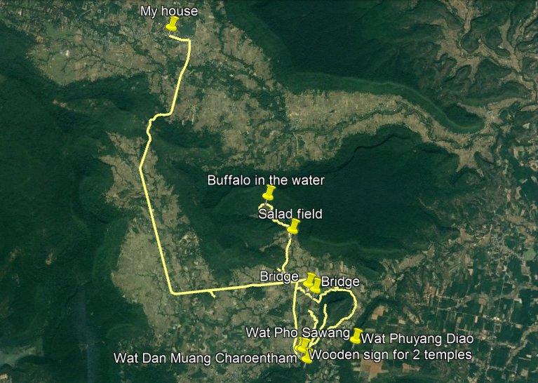 Auf dieser Tour, die etwa vier Stunden dauerte und ungefähr 58 Kilometer lang war, sah ich mehrere Hinweisschilder zu nahgelegenen Tempeln – aber ich bin nie auf etwas gestoßen, das aussah wie ein Tempel. Zumindest nichts, was dem üblichen Bild eines thailändischen Tempels entsprochen hätte.
