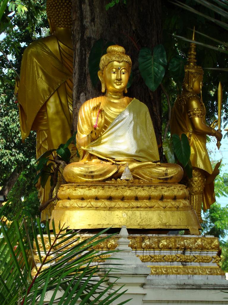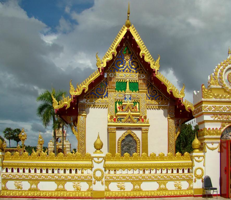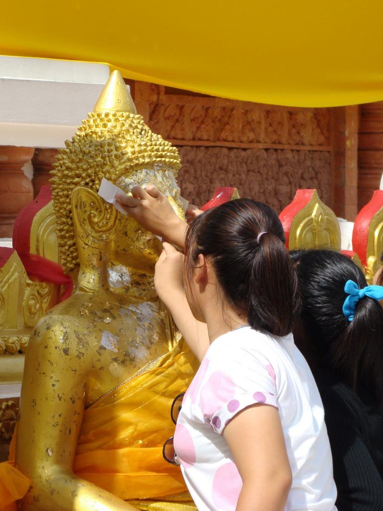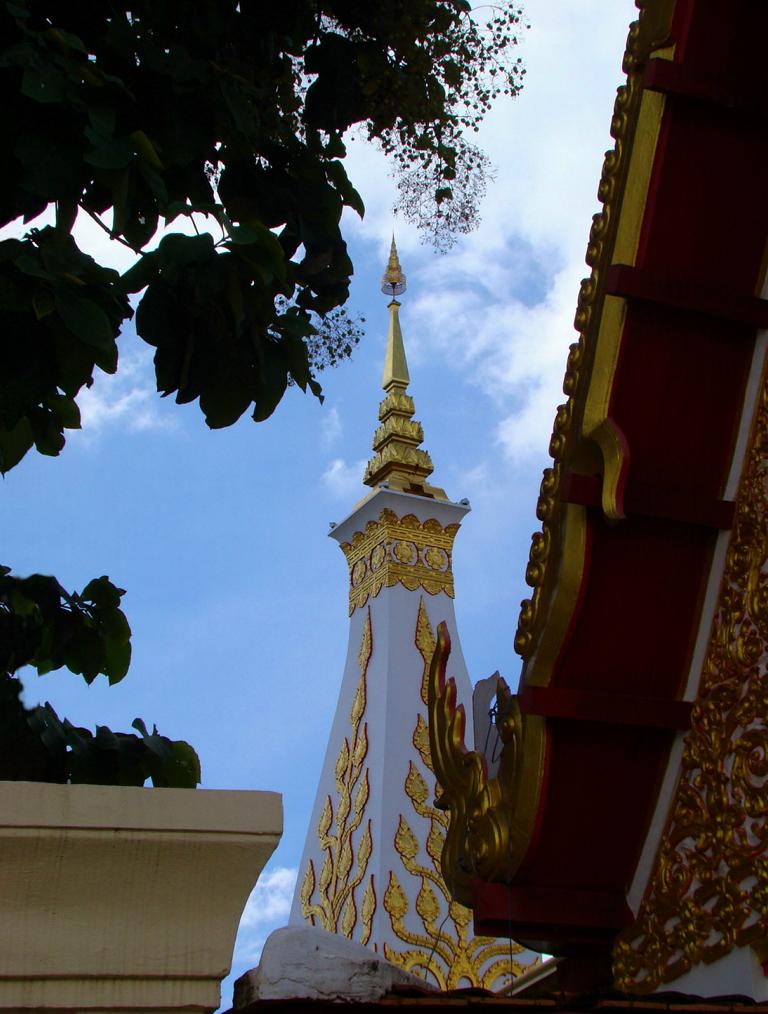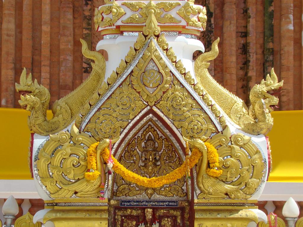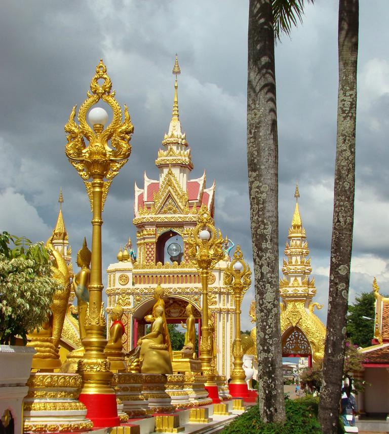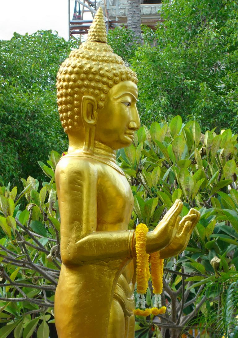 Overview … Überblick …Just a few days after ‚Mother’s Day‘ (birthday of Queen Sirikit). But the golden light poles are present all the time – already indicating what to expect inside the surrounding temple walls … Nur einige Tage nach ‚Muttertag‘ (Geburtstag von Königin Sirikit). Aber die goldenen Lichtmasten stehen immer dort – als eine Art von Vorankündigung dessen, was man innerhalb der Begrenzungsmauern erwarten konnte …Already impressive from outside … Es sah schon von außen beeindruckend aus …Golden ornaments and blue sky – always worth a photo … Goldene Ornamente und blauer Himmel – immer ein Foto wert …Open the doors … Sesam öffne Dich …… and split the clouds for me. … und vertreibe die Wolken für mich.Looking upwards … Der Blick aufwärts …Clouds vs. blue sky … Ein ewiger Kampf … bewölkt gegen blauen Himmel …Really beautiful from everywhere. Aus jedem Blickwinkel wirklich sehr schön.Golden view … Der goldene Blick …Even the ’normal‘ pediments were caked with gold. Sogar die ‚einfachen‘ Giebel waren mit Gold verziert.Regular bells? No way! Golden bells … Normale Glocken? Niemals! Goldene Glocken …More gold being applied … Gläubige trugen immer mehr Gold auf …Part of a pillar – nicely decorated as well. Teilansicht einer Säule – wie üblich sehr hübsch geschmückt und verziert.Golden Buddha image underneath a tree. This specific position means that he’s teaching or discussing about intellectual content. Eine goldene Buddhastatue unter einem Baum. Diese Position zeigt Buddha als Lehrer oder in einem Gespräch über anspruchsvolle Themen.A standing Buddha – hands in the positions of protecting and knowledge. Ein stehender Buddha – die Hände in schützender und wissender Haltung.One-handed drummer … Der einhändige Trommler …This German roller has seen better times … Diese Walze aus Deutschland hat schon bessere Zeiten gesehen …