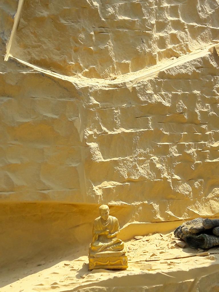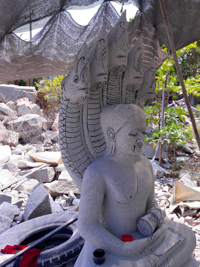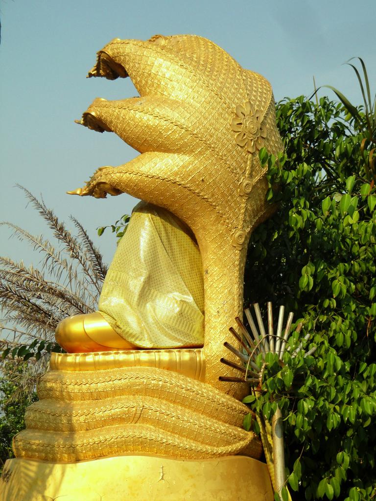 A seven-headed snake (Naga) protecting a sitting Buddha from the elements of nature. Eine siebenköpfige Schlange beschützt einen sitzenden Buddha vor den Naturgewalten.