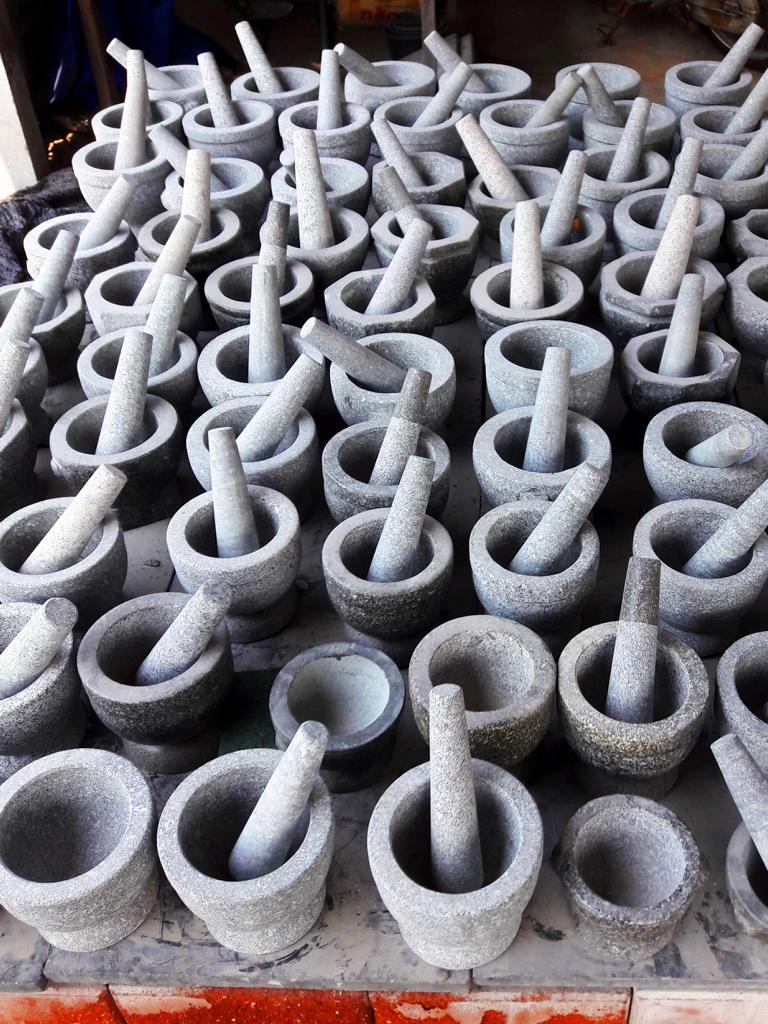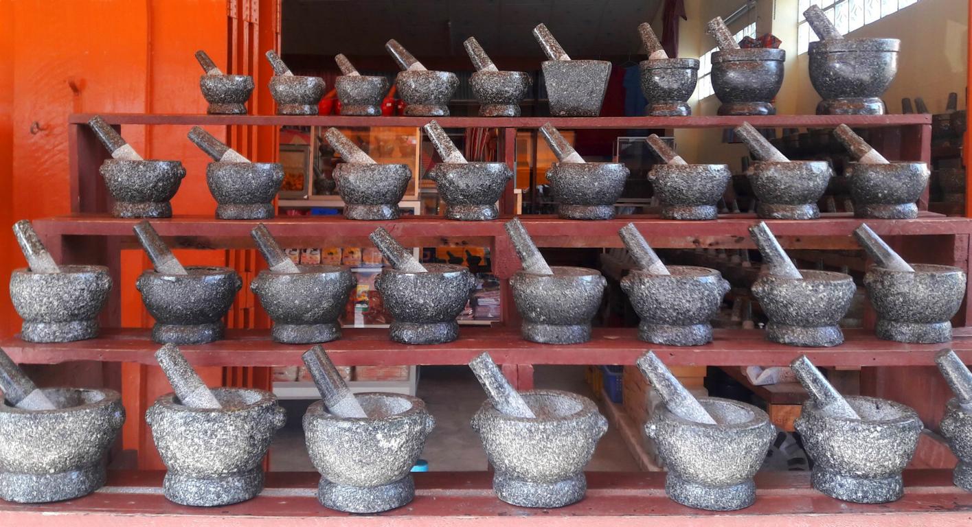 Mortars and pestles – used for crushing and grinding substances such as spices or food. Mörser und Stößel – genutzt zum Zerstoßen und Mahlen von Gewürzen oder anderen Zutaten.