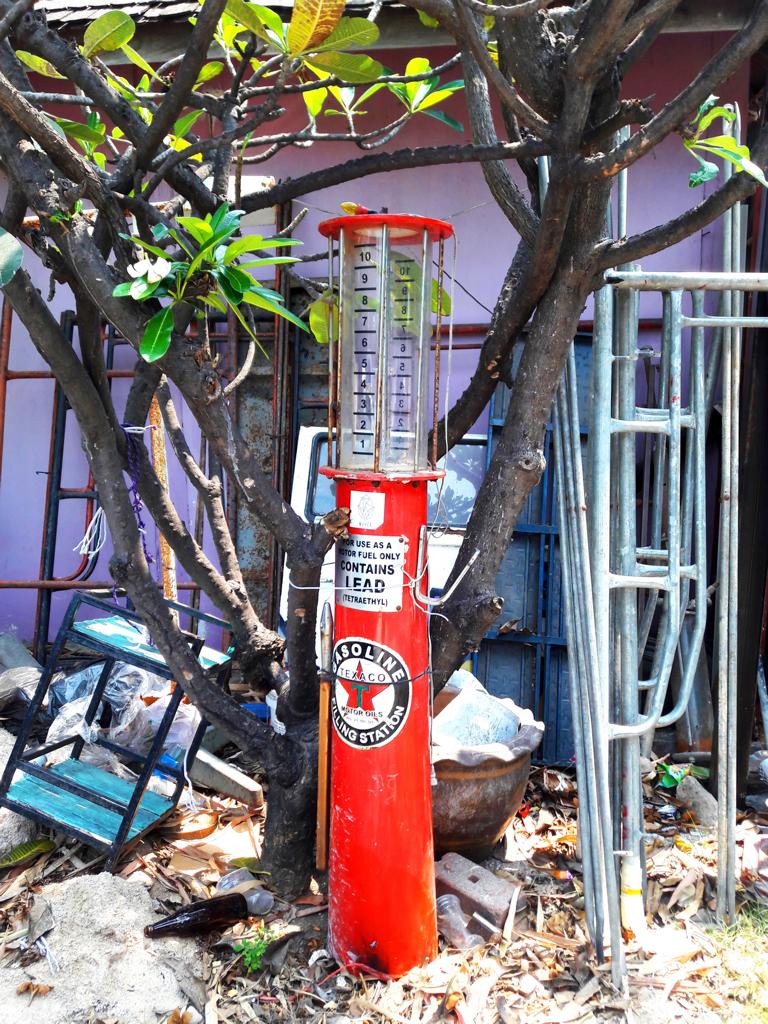 An old TEXACO gas pump. Someone obviously likes the old American style – at least as a kind decoration. Und eine alte TEXACO Zapfsäule. Offensichtlich mochte hier jemand den alten, amerikanischen Stil – zumindest als Dekoration.