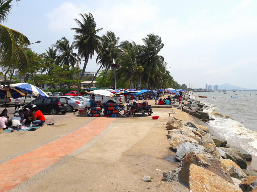 Even the strips without any sand or beach are quite busy. It’s the nearest „beach“ when you’re coming from Bangkok. Sogar die Abschnitte ohne jeden Sand waren sehr gut besucht. Es handelt sich hier um den am nächsten gelegenen „Strand“ von Bangkok aus kommend.