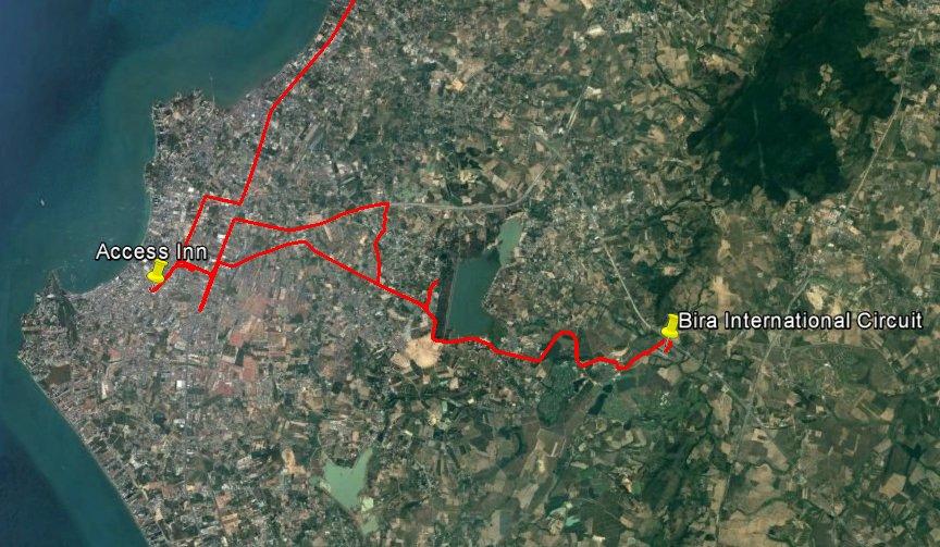 It’s not a Formula 1 circuit, I know. But its one of severel tracks for international car and motorbike races in Southeast Asia. Es ist kein Formel 1 Kurs, klar. Aber es handelt sich um einen von mehreren Kursen für internationale Auto- und Motorradrennen in Südostasien.