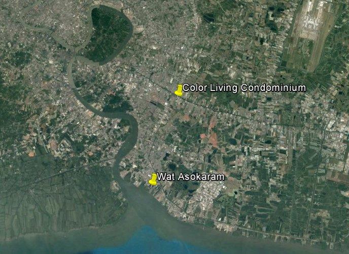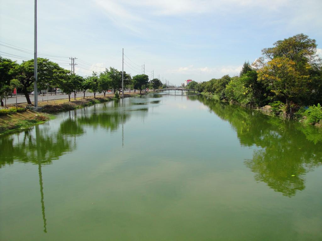 A wide khlong along Sukhumvit Road. Ein breiter Kanal entlang der Sukhumvit Straße.