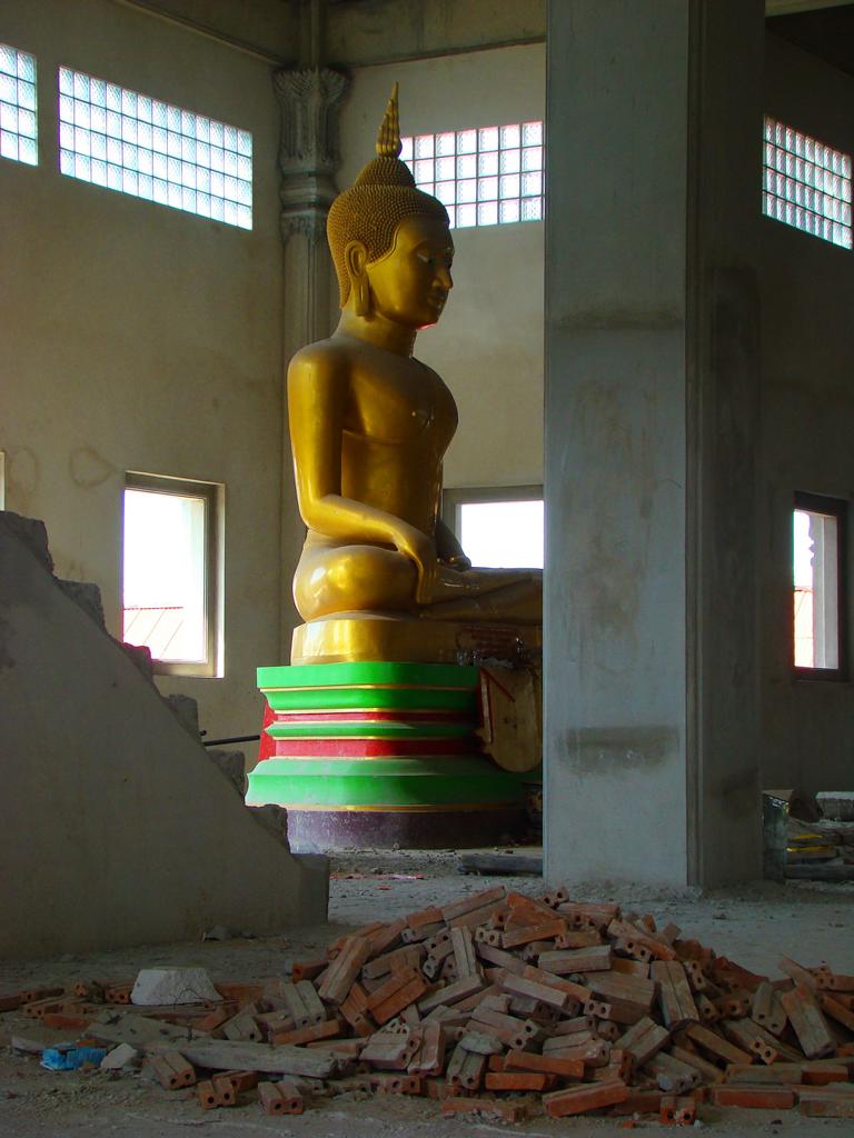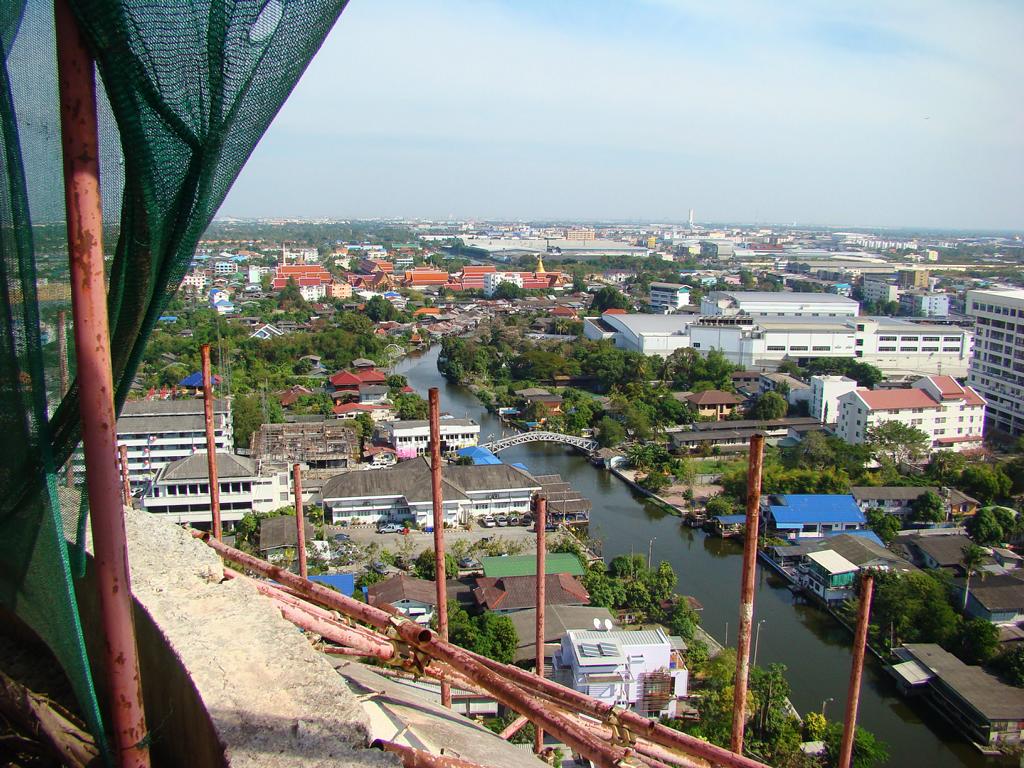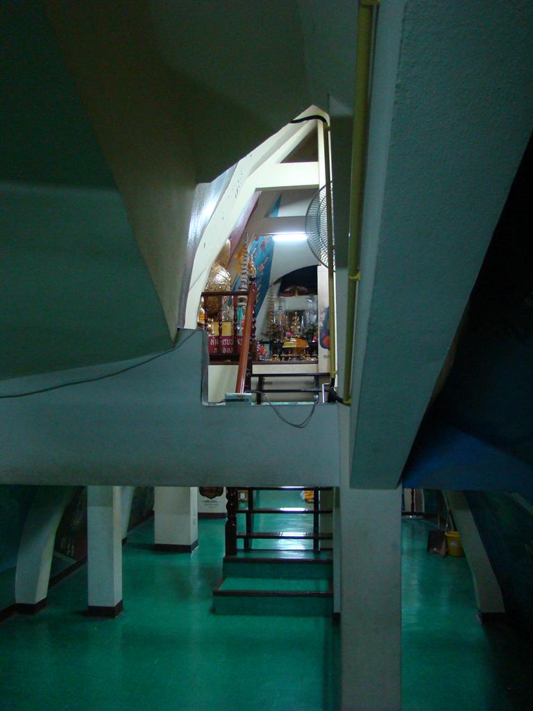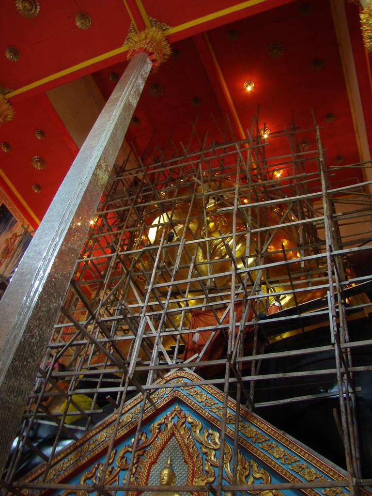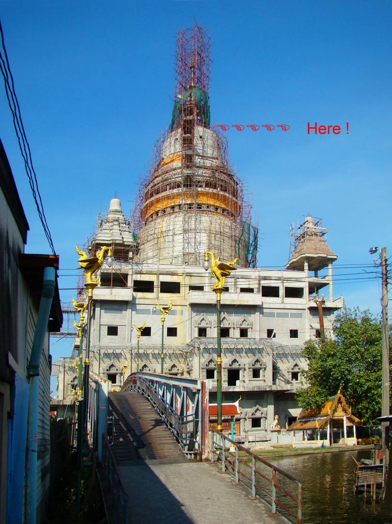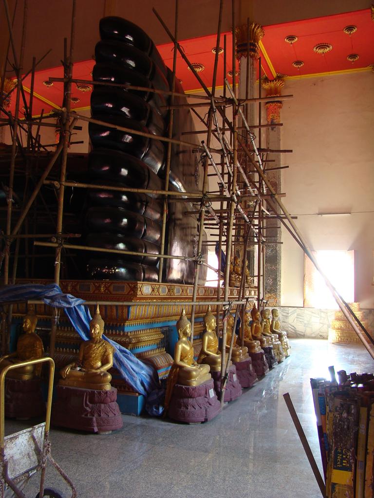 Tour overview … ÜberblickNo, not there. I’m here … Nein, nicht dort. Ich bin hier …Bags to collect alms. In diesen Beuteln werden die gespendeten Gaben gesammelt.This is how most „cemeteries“ in Thailand look: A wall with small wholes – wide enough to put the urn inside and place a photo on the front. So sehen die meisten „Friedhöfe“ in Thailand aus: Eine Wand mit kleinen Öffnungen – groß genug um die Urne hineinzustellen und ein Foto auf der Frontplatte anzubringen.Buddha statue in the sun … Buddhastatue im Sonnenlicht …One of many private schools in and around Bangkok. Eine von vielen privaten Schulen in bzw. in der Nähe von Bangkok.Headquarter of the District Administration Organization. Looking more like the tower at an airport … Sitz der Bezirksregierung. Sieht aber eher nach dem Kontrollturm eines Flughafens aus …At Wat Naam Daeng. Ein Tempel in Naam Daeng.Please – smile for the camera … Bitte – einmal lächeln für die Kamera …He knows how to look more friendly …Ja, der hier versteht es freundlicher zu blicken …Looking back towards the entrance … Blick zurück zum Eingang …It’s hanging from a steel bar! Huge gong at the temple … Befestigt an einem Stahlträger! Großer Gong im Tempel …The feet (!) of the reclining Buddha statue inside the temple. It might be easy to imagine that … Das hier sind nur die Füße (!) einer liegenden Buddhastatue im Inneren des Tempels. Man kann sich leicht vorstellen, daß …… it’s hollow and in this case visitors are allowed to … die gesamte Statue hohl ist und Besucher hier … … enter the inside of the statue … das Innere betreten und erkunden dürfen …… and see what will happen to people who are doing bad in present life. … um zu sehen was mit Menschen passiert, die in ihrem gegenwärtigen Leben Schlechtes tun.No flash allowed inside. But bright enough to show you the way further up into the head … Fotos mit Blitzlicht waren nicht erlaubt aber es war auch so hell genug um den Weg nach oben zum Kopf zu erkennen …… where 2 small altars are awaiting visitors. … wo zwei kleine Altäre standen.Difficult to imagine where exactly it is inside the huge statue … Aus dieser Perspektive konnte man sich nur schwerlich vorstellen, wo genau in der Statue man sich befand …… but the head was the highest spot and wide enough to provide space for a small room. … aber der Kopfbereich war der höchste Punkt und eben auch groß genug um Platz für einen kleinen Raum zu bieten.The building covering the reclining Buddha statue is pretty narrow. Difficult to estimate the hight though. But it’s strange to know that you just climed up inside the head … Das Gebäude rund um die liegende Buddhastatue ist ziemlich eng. Es ist schwer, die Höhe zu schätzen. Aber es fühlte sich schon seltsam an, eben noch in dem Kopf rumgeklettert zu sein.Outside again I found the bowling ball I was missing since years already … Wieder draußen habe ich endlich die Bowlingkugel gefunden, die ich seit Jahren vermisst hatte …The more – the better … Je mehr – desto besser …Hold my lamp … Halt mal kurz die Leuchte …A long way to go … Ein langer Weg …Working on that thin plank didn’t appear to be really safe … Die Arbeit auf dem dünnen Brett sah nicht wirklich sicher aus …Obviously too big to lift it inside after completion. So they literally built a temple around the Buddha image. Offensichtlich zu groß um die Statue später hineinzuheben. Deshalb hat man im wahrsten Sinne des Wortes einen Tempel um die Buddhfigur gebaut.Still a bit dusty … Noch etwas staubig …… and not finished yet. … und noch nicht ganz fertig.Actually I never thought about how to build a pagoda. But this it how it’s done … Tatsächlich hatte ich mir nie Gedanken über den Aufbau einer dieser Pagoden gemacht. Hier wurde deutlich, wie es gemacht wird …Right, upper corner. You see the small hole in the roof? If you know me, you know the rest of the story … Rechte, obere Ecke. Erkennt man das kleine Loch in der Decke? Wer mich kennt, kann sich den Rest der Geschichte denken …Hey, it was worth it! I’m sure that not many other civilians have been here … Hey, das hat sich gelohnt! Ich war mir sicher, daß – abgesehen von den Arbeitern – noch nicht viele Leute hier oben waren …… but … enough was enough. … aber … genug sollte genug gewesen sein …I made it up there – and back down again without problems. Immerhin bin ich bis dort oben und wieder zurück gestiegen ohne auf jemanden zu treffen.Maybe, I got his blessing without even knowing it. Vielleicht bin ich von ihm gesegnet worden ohne es bemerkt zu haben.