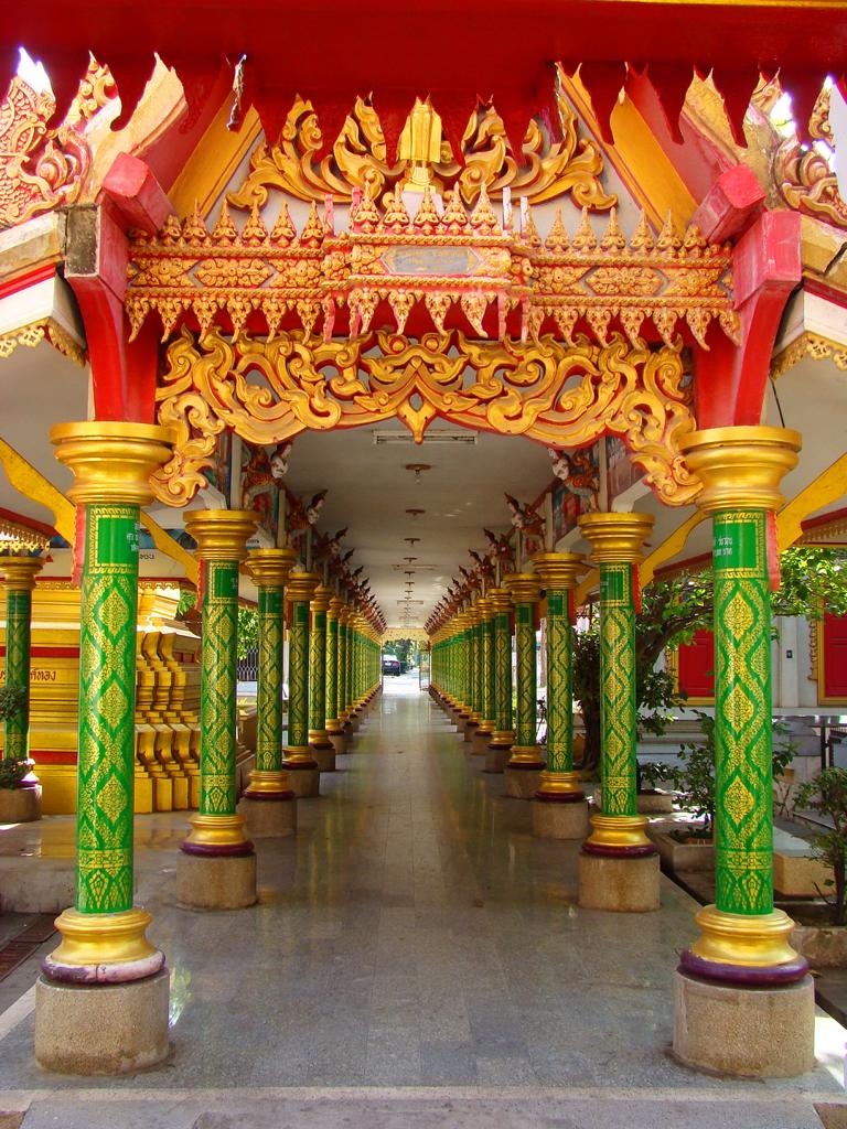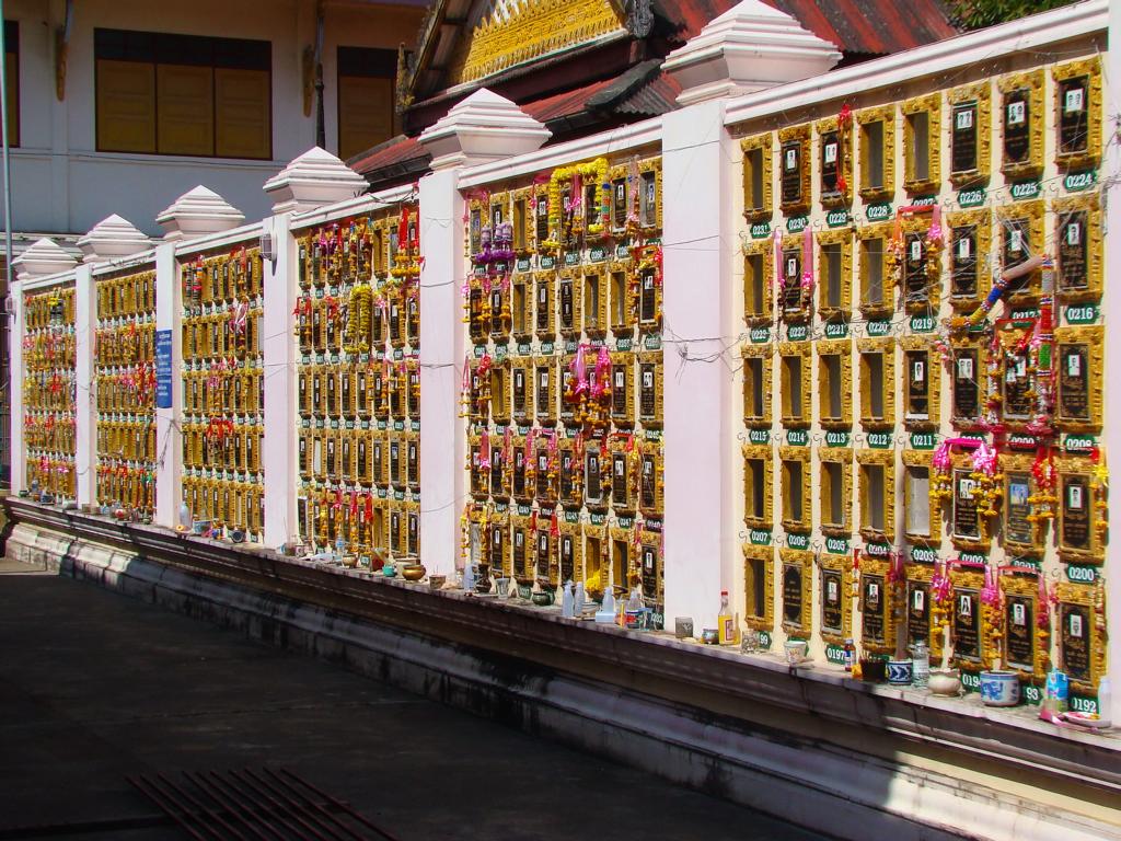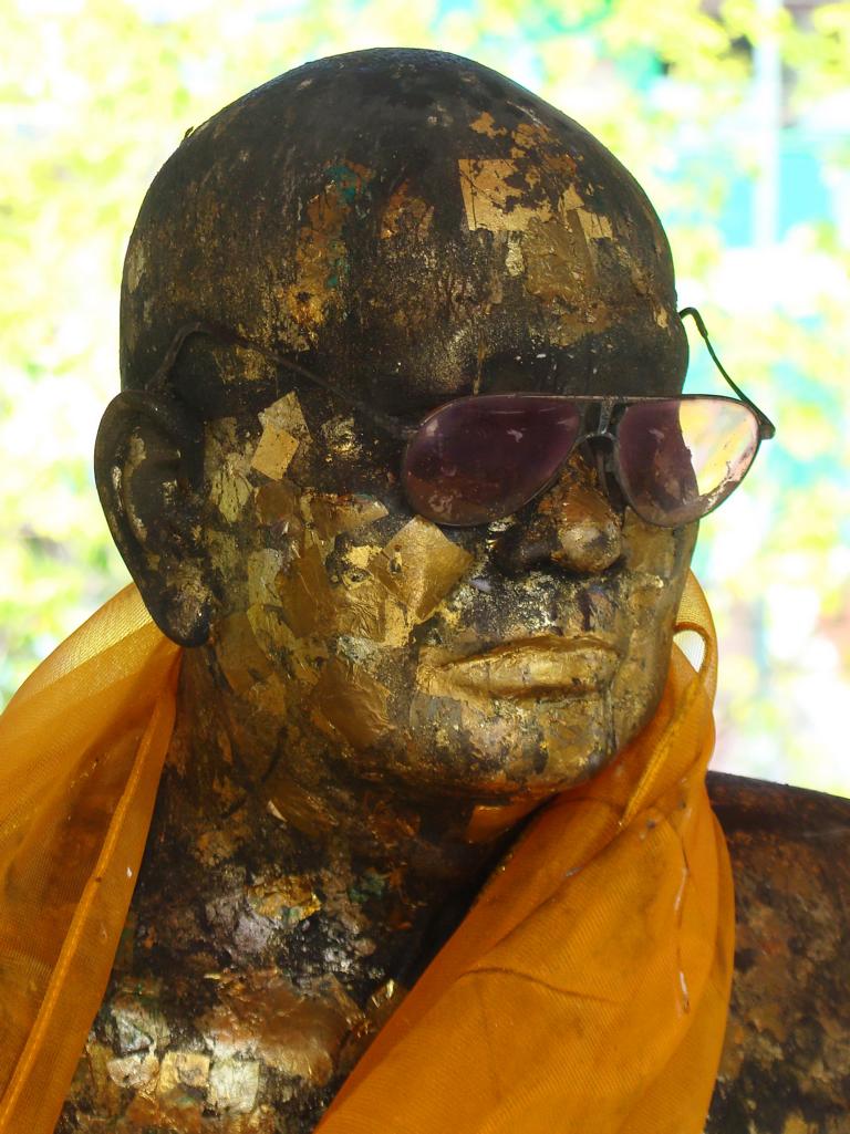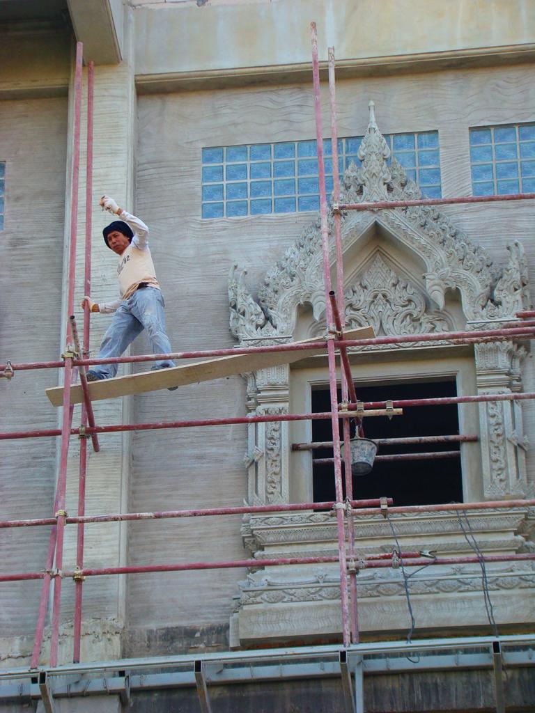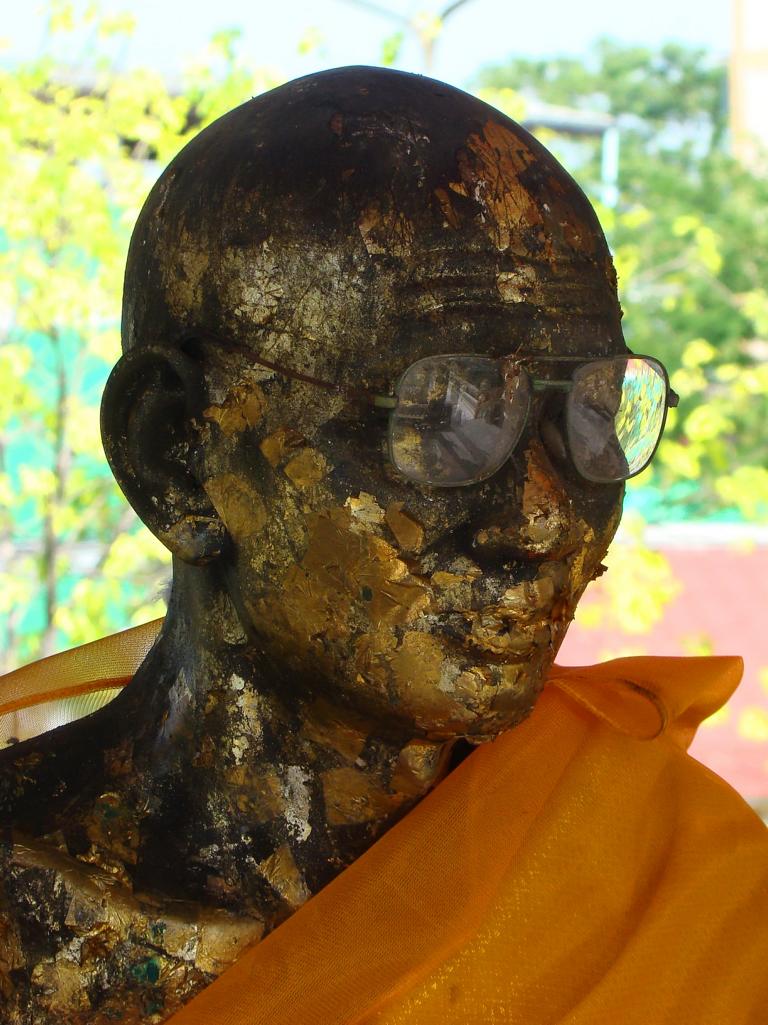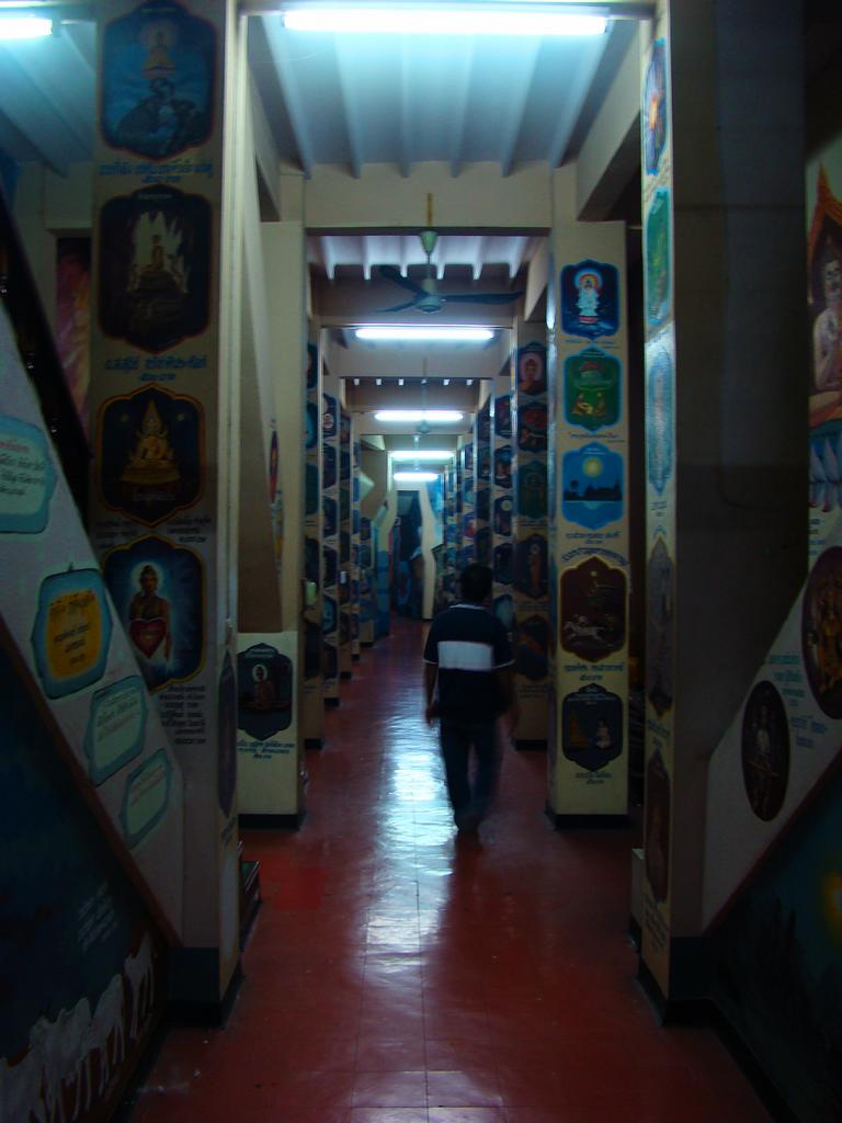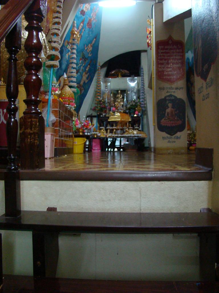 Tour overview … ÜberblickNo, not there. I’m here … Nein, nicht dort. Ich bin hier …Bags to collect alms. In diesen Beuteln werden die gespendeten Gaben gesammelt.This is how most „cemeteries“ in Thailand look: A wall with small wholes – wide enough to put the urn inside and place a photo on the front. So sehen die meisten „Friedhöfe“ in Thailand aus: Eine Wand mit kleinen Öffnungen – groß genug um die Urne hineinzustellen und ein Foto auf der Frontplatte anzubringen.Buddha statue in the sun … Buddhastatue im Sonnenlicht …One of many private schools in and around Bangkok. Eine von vielen privaten Schulen in bzw. in der Nähe von Bangkok.Headquarter of the District Administration Organization. Looking more like the tower at an airport … Sitz der Bezirksregierung. Sieht aber eher nach dem Kontrollturm eines Flughafens aus …At Wat Naam Daeng. Ein Tempel in Naam Daeng.Please – smile for the camera … Bitte – einmal lächeln für die Kamera …He knows how to look more friendly …Ja, der hier versteht es freundlicher zu blicken …Looking back towards the entrance … Blick zurück zum Eingang …It’s hanging from a steel bar! Huge gong at the temple … Befestigt an einem Stahlträger! Großer Gong im Tempel …The feet (!) of the reclining Buddha statue inside the temple. It might be easy to imagine that … Das hier sind nur die Füße (!) einer liegenden Buddhastatue im Inneren des Tempels. Man kann sich leicht vorstellen, daß …… it’s hollow and in this case visitors are allowed to … die gesamte Statue hohl ist und Besucher hier … … enter the inside of the statue … das Innere betreten und erkunden dürfen …… and see what will happen to people who are doing bad in present life. … um zu sehen was mit Menschen passiert, die in ihrem gegenwärtigen Leben Schlechtes tun.No flash allowed inside. But bright enough to show you the way further up into the head … Fotos mit Blitzlicht waren nicht erlaubt aber es war auch so hell genug um den Weg nach oben zum Kopf zu erkennen …… where 2 small altars are awaiting visitors. … wo zwei kleine Altäre standen.Difficult to imagine where exactly it is inside the huge statue … Aus dieser Perspektive konnte man sich nur schwerlich vorstellen, wo genau in der Statue man sich befand …… but the head was the highest spot and wide enough to provide space for a small room. … aber der Kopfbereich war der höchste Punkt und eben auch groß genug um Platz für einen kleinen Raum zu bieten.The building covering the reclining Buddha statue is pretty narrow. Difficult to estimate the hight though. But it’s strange to know that you just climed up inside the head … Das Gebäude rund um die liegende Buddhastatue ist ziemlich eng. Es ist schwer, die Höhe zu schätzen. Aber es fühlte sich schon seltsam an, eben noch in dem Kopf rumgeklettert zu sein.Outside again I found the bowling ball I was missing since years already … Wieder draußen habe ich endlich die Bowlingkugel gefunden, die ich seit Jahren vermisst hatte …The more – the better … Je mehr – desto besser …Hold my lamp … Halt mal kurz die Leuchte …A long way to go … Ein langer Weg …Working on that thin plank didn’t appear to be really safe … Die Arbeit auf dem dünnen Brett sah nicht wirklich sicher aus …Obviously too big to lift it inside after completion. So they literally built a temple around the Buddha image. Offensichtlich zu groß um die Statue später hineinzuheben. Deshalb hat man im wahrsten Sinne des Wortes einen Tempel um die Buddhfigur gebaut.Still a bit dusty … Noch etwas staubig …… and not finished yet. … und noch nicht ganz fertig.Actually I never thought about how to build a pagoda. But this it how it’s done … Tatsächlich hatte ich mir nie Gedanken über den Aufbau einer dieser Pagoden gemacht. Hier wurde deutlich, wie es gemacht wird …Right, upper corner. You see the small hole in the roof? If you know me, you know the rest of the story … Rechte, obere Ecke. Erkennt man das kleine Loch in der Decke? Wer mich kennt, kann sich den Rest der Geschichte denken …Hey, it was worth it! I’m sure that not many other civilians have been here … Hey, das hat sich gelohnt! Ich war mir sicher, daß – abgesehen von den Arbeitern – noch nicht viele Leute hier oben waren …… but … enough was enough. … aber … genug sollte genug gewesen sein …I made it up there – and back down again without problems. Immerhin bin ich bis dort oben und wieder zurück gestiegen ohne auf jemanden zu treffen.Maybe, I got his blessing without even knowing it. Vielleicht bin ich von ihm gesegnet worden ohne es bemerkt zu haben.