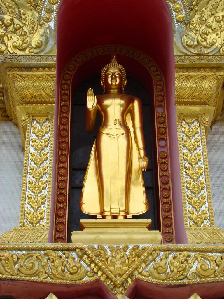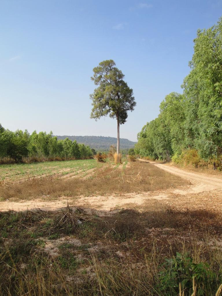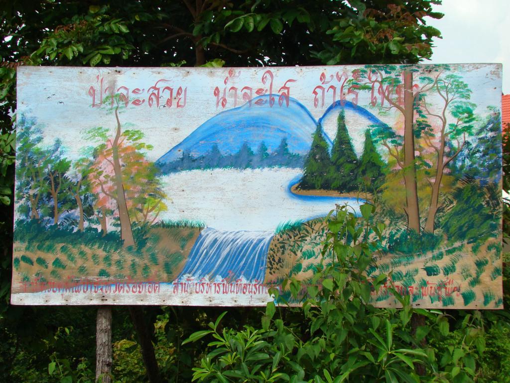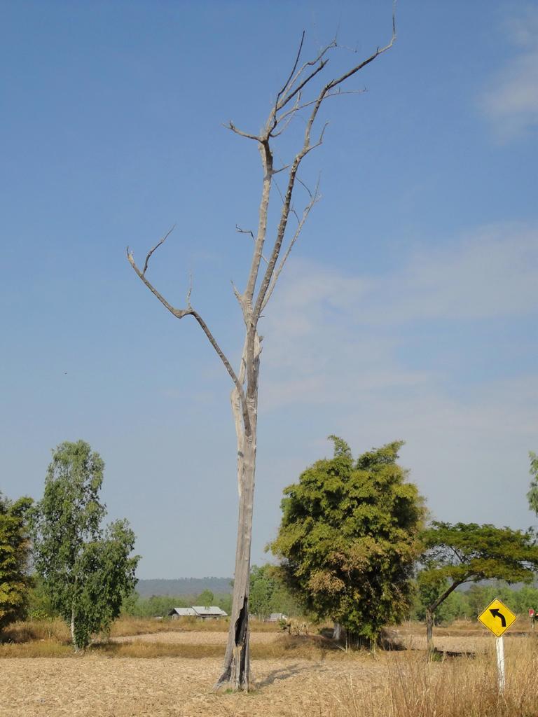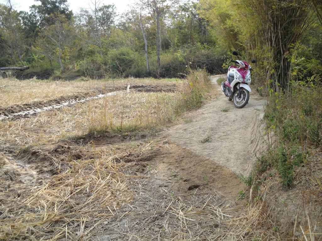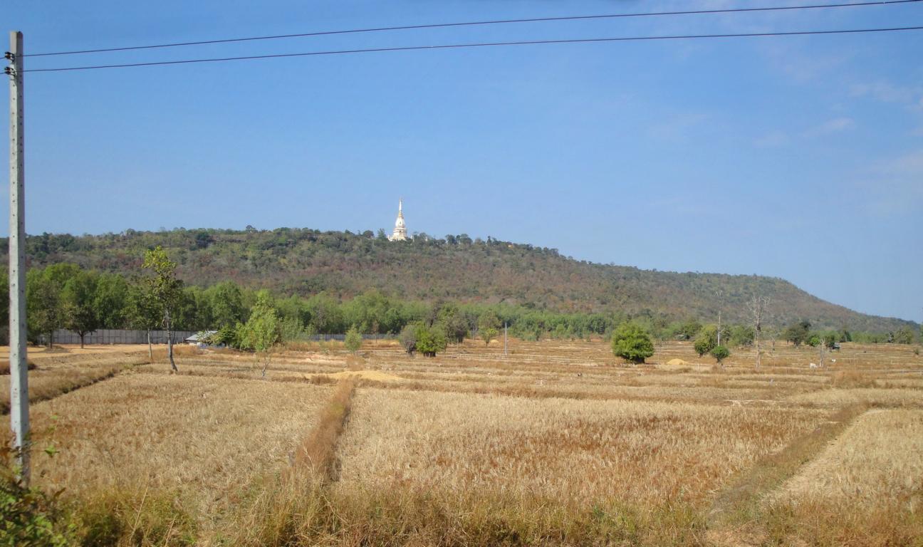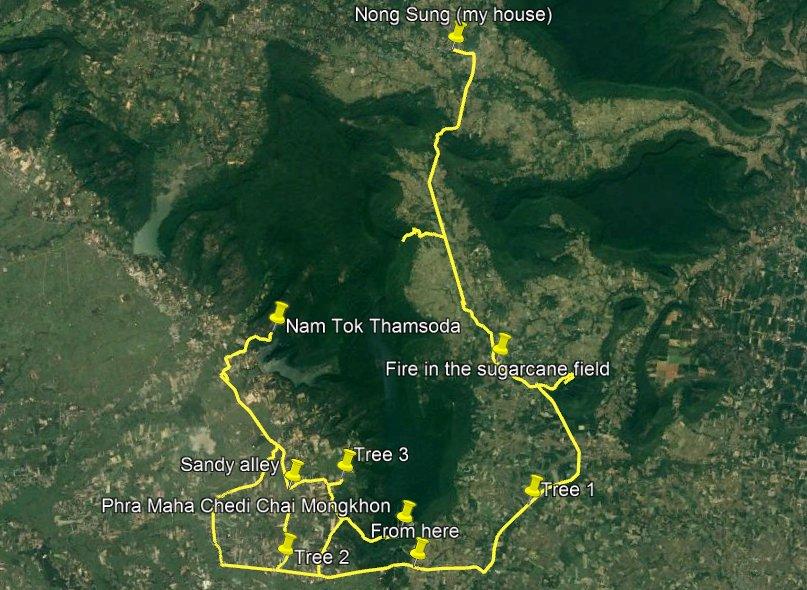 Area overview … Überblick über das Gebiet …Somewhere on my way I saw smoke rising up in front of me … Irgendwo unterwegs sah ich vor mir Rauch auffsteigen …… and the closer I came the more I could see. … und je näher ich kam desto mehr konnte ich erkennen.It was good to see someone trying to contol the fire … Es war gut zu sehen, daß jemand versuchte, das Feuer unter Kontrolle zu halten …… although … sometimes it looked a bit frightening. … obwohl … manchmal sah es schon etwas beängstigend aus.But I told myself that the farmers around here grew up with this kind of ‚harvesting‘. The leaves are pretty much useless and are supposed to burn while the valuable stems remain standing and are chopped off and collected after the fire. Aber ich habe mir gesagt, daß die Bauern in dieser Gegend mit dieser Art der ‚Ernte‘ aufgewachsen waren. Die Blätter sind weitestgehend nutzlos und konnten verbrennen während die wertvollen Stiele stehen blieben und nach dem Feuer abgeschlagen und gesammelt werden konnten.This sole tree caught my attention and years later I could determine its position in the map (Tree 1). Dieser einzelne Baum hatte meine Aufmerksamkeit erregt und sogar Jahre später konnte ich seinen Standpunkt auf der Karte noch ausmachen (Tree 1).‚From here‘ I got a glimpse of what to expect later today. Von hier aus hatte ich einen ersten Eindruck von dem, was später noch kommen sollte.Nothing special for Thailand, not beautiful, I did not pee against it – but I felt like taking a photo of it. And while studying Google Earth I found it still standing and marked it (Tree 2) in the map. I remember riding along that road when I decided to turn around because I got confused regarding the directions. I returned to the main road and followed it for a few kilometres. Nichts besonderes für Thailand, nicht schön, ich habe nicht dagegen uriniert – aber ich hatte das Bedürfnis, den Baum zu fotografieren. Und als ich später die Tour in Google Earth eingetragen habe, konnte ich auch diesen Baum ausmachen und habe ihn als (Tree 2) markiert. Ich erinnere mich, daß ich hier irgendwo umkehrte weil ich bezüglich der Richtung etwas verwirrt war. Ich fuhr zurück zur Hauptstraße und folgte ihr einige Kilometer.A bit further on my way I discovered this sign … not knowing what it meant. Etwas weiter an der Strecke sah ich dieses Hinweisschild … ohne zu wissen was es bedeutete.But following the small road turned out to be worth it … Aber der Umweg über die schmale Starße stellte sich als absolut lohnenswert heraus …I ended up at a small … it was not a temple in the classical meaning … more like a place to come and meditate, get some advice from a monk, swim in the small pond underneath the waterfall … Ich kam an einem kleinen … es war kein Tempel im klassischen Sinn … eher ein Ort um zu meditieren und einen Rat von einem Mönch einzuholen oder in dem kleinen Teich unter dem Wasserfall zu baden …And since this place was called a temple – there was a small altar in the rocks. Und weil dieser Ort als Tempel bezeichnet worden war – da gab es tatsächlich einen kleinen Altar unter den Felsen.This a an ecellent example for the ‚roads‘ I was looking for: Off the main road, no traffic, nobody around – at least not visible – and a slightly challenging surface to ride on. Ein sehr gutes Beispiel für die Art von ‚Straßen‘, die ich immer gesucht habe: Abseits der Hauptstraße, kein Verkehr, niemand da – zumindest nicht in Sichtweite – und ein leicht anspruchsvoller ‚Straßenbelag‘.The direction appeared to be correct – so I just followed my ‚instincts‘ until … Die eingeschlagene Richtung schien zu stimmen – und so folgte ich meinen ‚Eingebungen‘ bis …… after a wrong turn there was no other option left than to turn back! But hey – that happens if you don’t have a plan where to go, where the propper roads are and leave the wider roads. … ich an einer Stelle falsch abbog und es keine andere Möglichkeit mehr gab als umzukehren! Aber hey – das passiert wenn man keinen Ahnung hat wo man übehaupt hin möchte, wo die guten Straßen verlaufen und wenn man diese vorher verlässt …I have never been a ‚tree fan‘ – but on this tour I got into taking pics of a few, single trees sticking out in their specific locations (Tree 3). Ich war nie ein ‚Baumfreund‘ – aber auf dieser Tour fand ich Spaß daran, Fotos von einigen, einzeln stehenden Bäumen an ihren besonderen Standorten zu machen (Tree 3).The good thing was – despite the short detour to the rice filed – the main direction was correct and so I reached the Phra Maha Chedi Chai Mongkhon. This was my first impression from outside. It is one of the largest Chedis in Thailand. It’s 101 metres wide, 101 metres long and 101 metres high. Das Gute war – abgesehen von dem Umweg zum Reisfeld – daß die Hauptfahrtrichtung stimmte und so erreichte ich den Phra Maha Chedi Chai Mongkhon. Das hier war mein erster Eindruck von außen. Es handelt sich um einen der größten Chedis in Thailand. 101 Meter lang, 101 Meter breit und 101 Meter hoch.Getting closer … really impressive. Ich kam näher … wirklich beeindruckend.Surrounded by well maitained gardens. Umgeben von gut gepflegten Gartenanlagen.White walls with golden applications in front of a blue sky – always a beautiful combination. Weiße Wände mit goldenen Verzierungen vor blauem Himmel – immer eine schöne Kombination.Not really that white as from far away anymore – but still beautiful. Nicht wirklich so weiß wie es von weitem aussah – aber immer noch schön.A 5-headed cobra – symbolising awakeness and alertness while sitting in meditation. Eine fünfköpfige Kobra – sie steht für Wachen und Vorsicht während der Meditation im Sitzen.A few sitting Buddhas around the garden … Einige sitzende Buddhas in der Nähe der Gärten …Even the fountain looked golden – more or less 