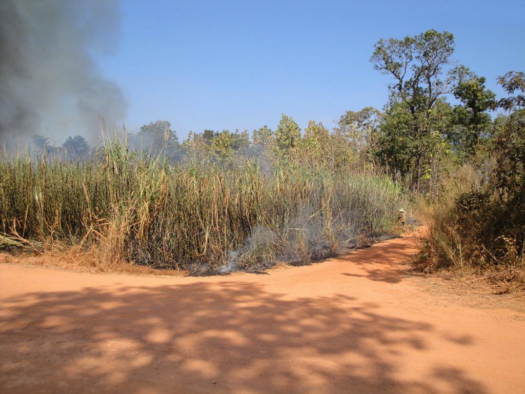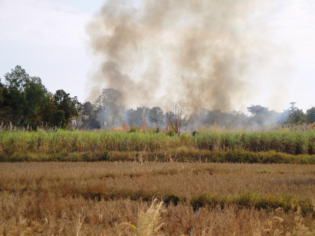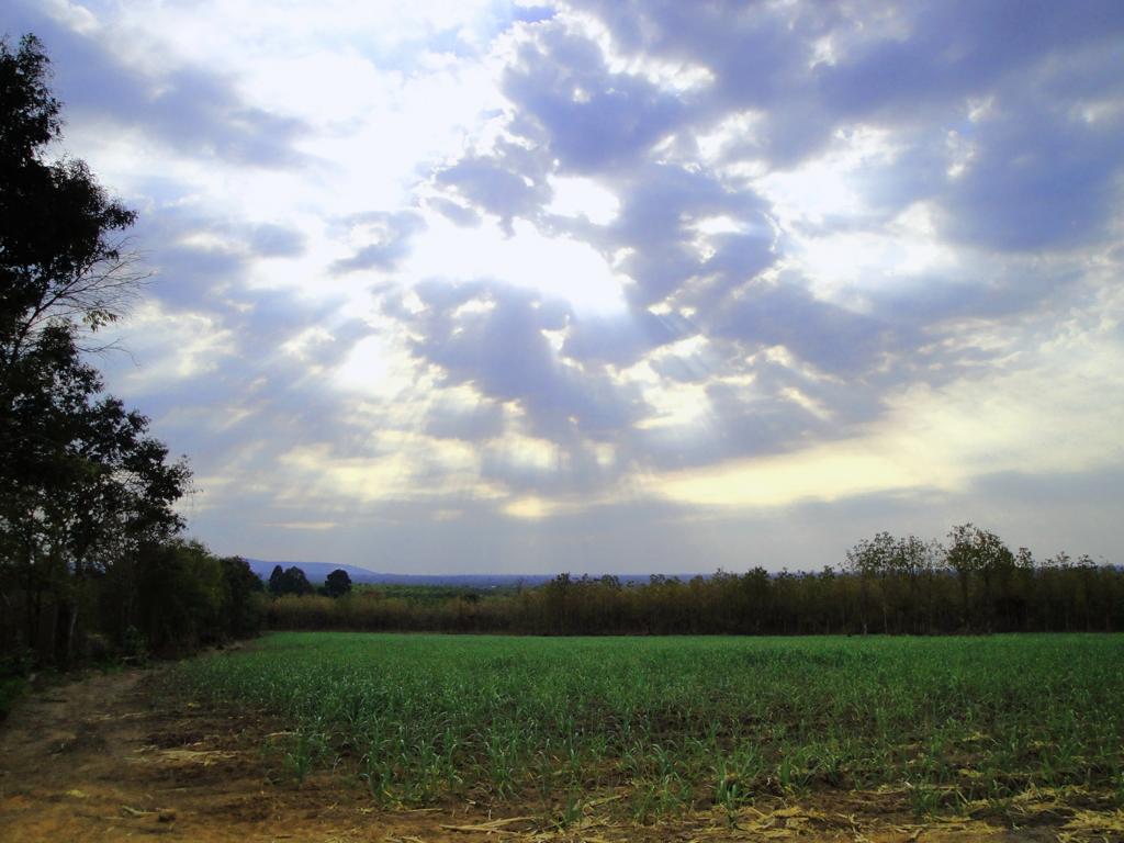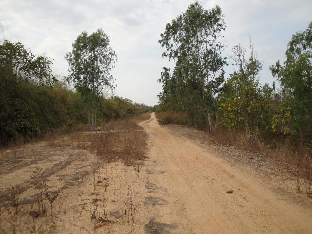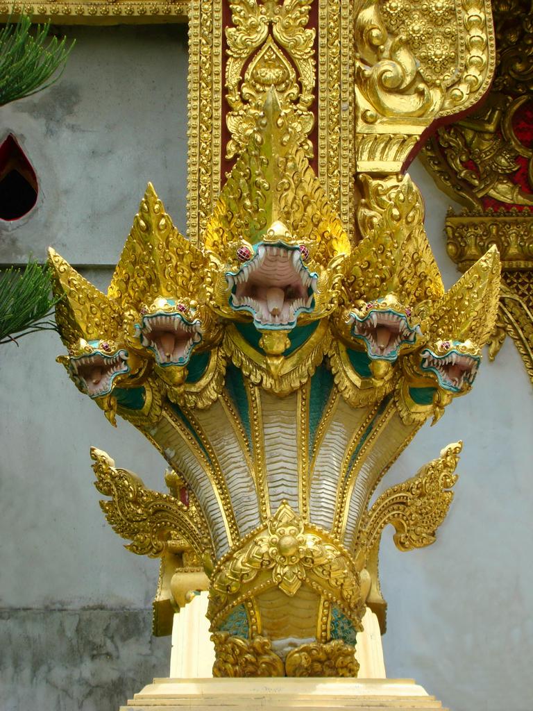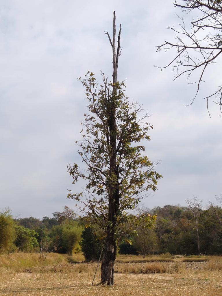 Area overview … Überblick über das Gebiet …Somewhere on my way I saw smoke rising up in front of me … Irgendwo unterwegs sah ich vor mir Rauch auffsteigen …… and the closer I came the more I could see. … und je näher ich kam desto mehr konnte ich erkennen.It was good to see someone trying to contol the fire … Es war gut zu sehen, daß jemand versuchte, das Feuer unter Kontrolle zu halten …… although … sometimes it looked a bit frightening. … obwohl … manchmal sah es schon etwas beängstigend aus.But I told myself that the farmers around here grew up with this kind of ‚harvesting‘. The leaves are pretty much useless and are supposed to burn while the valuable stems remain standing and are chopped off and collected after the fire. Aber ich habe mir gesagt, daß die Bauern in dieser Gegend mit dieser Art der ‚Ernte‘ aufgewachsen waren. Die Blätter sind weitestgehend nutzlos und konnten verbrennen während die wertvollen Stiele stehen blieben und nach dem Feuer abgeschlagen und gesammelt werden konnten.This sole tree caught my attention and years later I could determine its position in the map (Tree 1). Dieser einzelne Baum hatte meine Aufmerksamkeit erregt und sogar Jahre später konnte ich seinen Standpunkt auf der Karte noch ausmachen (Tree 1).‚From here‘ I got a glimpse of what to expect later today. Von hier aus hatte ich einen ersten Eindruck von dem, was später noch kommen sollte.Nothing special for Thailand, not beautiful, I did not pee against it – but I felt like taking a photo of it. And while studying Google Earth I found it still standing and marked it (Tree 2) in the map. I remember riding along that road when I decided to turn around because I got confused regarding the directions. I returned to the main road and followed it for a few kilometres. Nichts besonderes für Thailand, nicht schön, ich habe nicht dagegen uriniert – aber ich hatte das Bedürfnis, den Baum zu fotografieren. Und als ich später die Tour in Google Earth eingetragen habe, konnte ich auch diesen Baum ausmachen und habe ihn als (Tree 2) markiert. Ich erinnere mich, daß ich hier irgendwo umkehrte weil ich bezüglich der Richtung etwas verwirrt war. Ich fuhr zurück zur Hauptstraße und folgte ihr einige Kilometer.A bit further on my way I discovered this sign … not knowing what it meant. Etwas weiter an der Strecke sah ich dieses Hinweisschild … ohne zu wissen was es bedeutete.But following the small road turned out to be worth it … Aber der Umweg über die schmale Starße stellte sich als absolut lohnenswert heraus …I ended up at a small … it was not a temple in the classical meaning … more like a place to come and meditate, get some advice from a monk, swim in the small pond underneath the waterfall … Ich kam an einem kleinen … es war kein Tempel im klassischen Sinn … eher ein Ort um zu meditieren und einen Rat von einem Mönch einzuholen oder in dem kleinen Teich unter dem Wasserfall zu baden …And since this place was called a temple – there was a small altar in the rocks. Und weil dieser Ort als Tempel bezeichnet worden war – da gab es tatsächlich einen kleinen Altar unter den Felsen.This a an ecellent example for the ‚roads‘ I was looking for: Off the main road, no traffic, nobody around – at least not visible – and a slightly challenging surface to ride on. Ein sehr gutes Beispiel für die Art von ‚Straßen‘, die ich immer gesucht habe: Abseits der Hauptstraße, kein Verkehr, niemand da – zumindest nicht in Sichtweite – und ein leicht anspruchsvoller ‚Straßenbelag‘.The direction appeared to be correct – so I just followed my ‚instincts‘ until … Die eingeschlagene Richtung schien zu stimmen – und so folgte ich meinen ‚Eingebungen‘ bis …… after a wrong turn there was no other option left than to turn back! But hey – that happens if you don’t have a plan where to go, where the propper roads are and leave the wider roads. … ich an einer Stelle falsch abbog und es keine andere Möglichkeit mehr gab als umzukehren! Aber hey – das passiert wenn man keinen Ahnung hat wo man übehaupt hin möchte, wo die guten Straßen verlaufen und wenn man diese vorher verlässt …I have never been a ‚tree fan‘ – but on this tour I got into taking pics of a few, single trees sticking out in their specific locations (Tree 3). Ich war nie ein ‚Baumfreund‘ – aber auf dieser Tour fand ich Spaß daran, Fotos von einigen, einzeln stehenden Bäumen an ihren besonderen Standorten zu machen (Tree 3).The good thing was – despite the short detour to the rice filed – the main direction was correct and so I reached the Phra Maha Chedi Chai Mongkhon. This was my first impression from outside. It is one of the largest Chedis in Thailand. It’s 101 metres wide, 101 metres long and 101 metres high. Das Gute war – abgesehen von dem Umweg zum Reisfeld – daß die Hauptfahrtrichtung stimmte und so erreichte ich den Phra Maha Chedi Chai Mongkhon. Das hier war mein erster Eindruck von außen. Es handelt sich um einen der größten Chedis in Thailand. 101 Meter lang, 101 Meter breit und 101 Meter hoch.Getting closer … really impressive. Ich kam näher … wirklich beeindruckend.Surrounded by well maitained gardens. Umgeben von gut gepflegten Gartenanlagen.White walls with golden applications in front of a blue sky – always a beautiful combination. Weiße Wände mit goldenen Verzierungen vor blauem Himmel – immer eine schöne Kombination.Not really that white as from far away anymore – but still beautiful. Nicht wirklich so weiß wie es von weitem aussah – aber immer noch schön.A 5-headed cobra – symbolising awakeness and alertness while sitting in meditation. Eine fünfköpfige Kobra – sie steht für Wachen und Vorsicht während der Meditation im Sitzen.A few sitting Buddhas around the garden … Einige sitzende Buddhas in der Nähe der Gärten …Even the fountain looked golden – more or less 