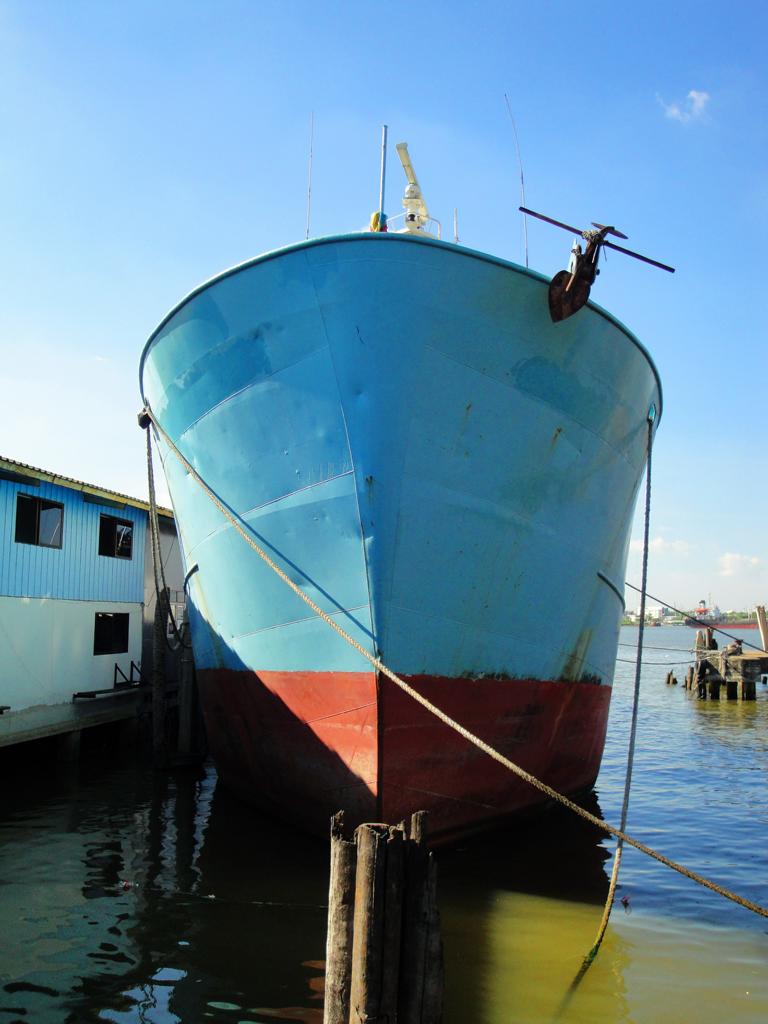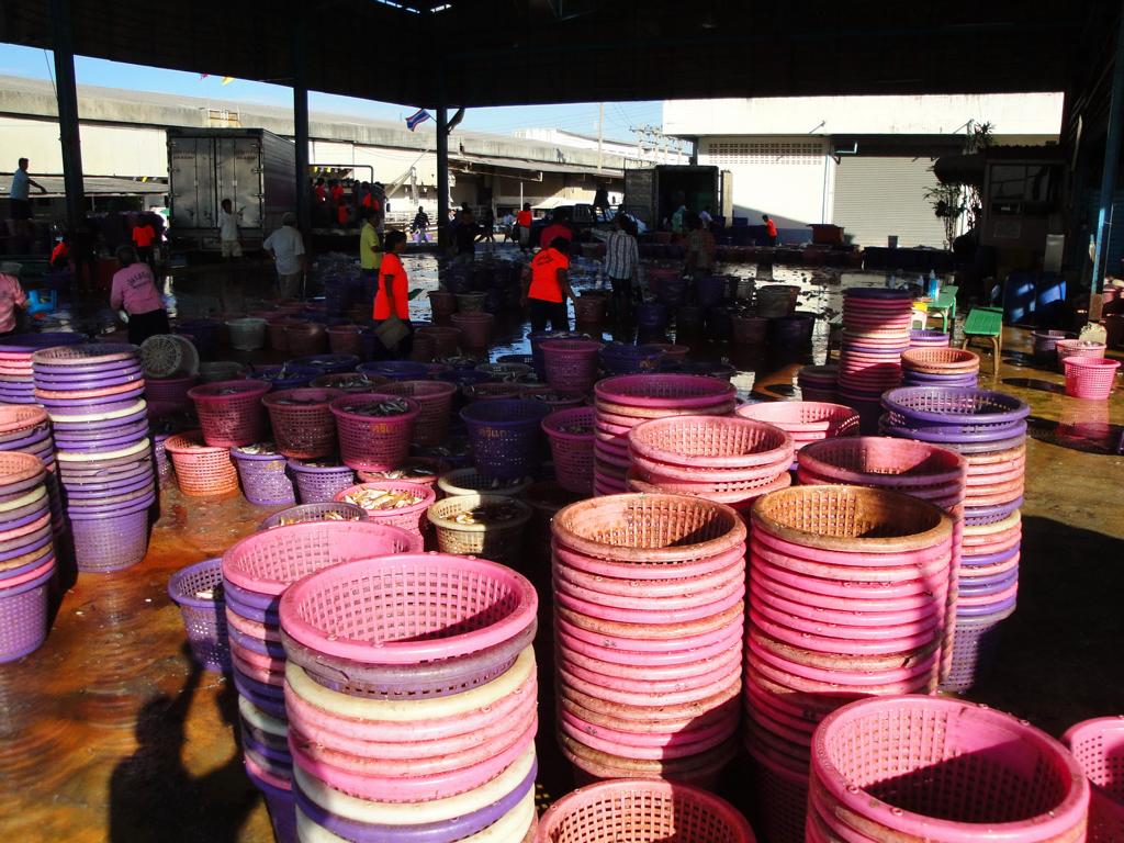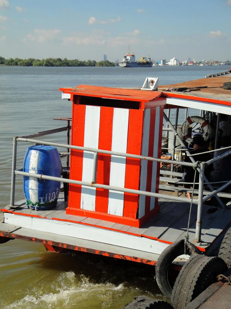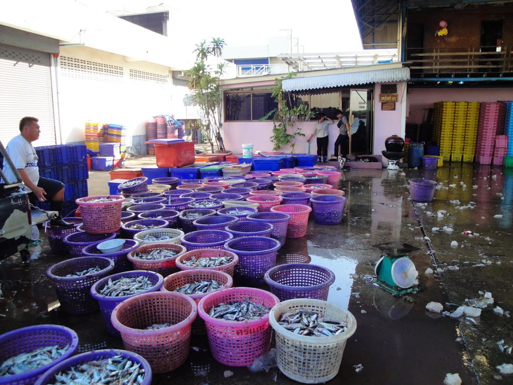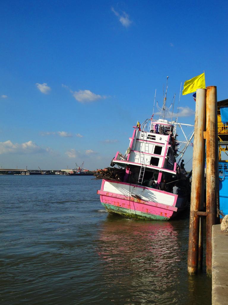 Tour overview … Überblick …Part of the former Samut Prakan city wall. Ein Teil der alten Stadtmauer von Samut Prakan.I was tempted to go on board and see where I would end up … but I didn’t want to leave my motorcycle behind. Es hätte mich schon gereizt, an Bord zu gehen und zu sehen, wo mich der Kapitän hinschippern würde … aber ich wollte meinen Roller nicht zurücklassen.Even the ropes looked pretty much relaxed … Sogar die Taue sahen sehr entspannt aus …Colourful from outside – probably brown from inside … Außen schön farbig – innen wahrscheinlich eher braun …I did not know yet what it was all about … Noch hatte ich keine Ahnung, wo ich hier hingeraten war …… still being impressed how close I could get to the tall ships … immer wieder beeindruckend, wie nah ich an diese großen Schiffe herankommen konnte …… and cranes. … und an die Kräne.What could it be? Something to up- or unload a ship? But what …? Was könnte das denn sein? Etwas, um Schiffe zu be- oder entladen? Aber was genau?Different shape. I didn’t expect a ship to look like this one here … Eine etwas unterschiedliche Form. Ich hatte nicht damit gerechnet, daß ein Schiff so geschnitten ist …Ahhh, fishes … other seafood … Ahhh, Fische und andere Meeresfrüchte …Obviously sold on spot – directly from the ship to the vendors … Offenbar direkt an Ort und Stelle verkauft – direkt vom Fangschiff an die Händler …Ready to leave and sell it at a market … Bereit für die Abfahrt und den Verkauf auf einem Markt …Out of balance … Leichte Schieflage …Yellow door with a red handle … Gelbe Tür mit rotem Griff …Finally I discovered this building … Und dann entdeckte ich dieses Gebäude …… and its purpose: … und erkannte seinen Zweck:A huge freezer to produce large ice cubes. Es handelte sich um einen überdimensionierten Gefrierschrank, der große Eiswürfel produzierte.But before being uploaded onto a truck or ship those blocks had to be ‚adjusted’… Aber bevor die auf einen Lkw oder ein Schiff verladen wurden, mussten sie etwas ‚angepasst‘ werden …Those blue plastic boxes on the truck appeared not big enough for the big block of ice seen before … Die blauen Kisten auf der Ladefläche schienen zu klein zu sein um einen der großen Blöcke, die ich vorher gesehen hatte, zu fassen …Here we go: Don’t mess around with me – I’ll crush everything getting too close to me … Ach so: Mach keinen Ärger – ich zerkleinere alles was mir zu nahe kommt …Big block coming … Hier kommt ein großer Eiswürfel …… being fed to the crusher … wird gekonnt in den Brecher geschoben …… within 1 minute it’s gone … und innerhalb von einer Minute ist der Block zerkleinert …… and uploaded into the boxes. … und auf die bereitstehenden Boxen verteilt.Good man – don’t waste anything. So soll das sein – bis zum letzten Rest.
