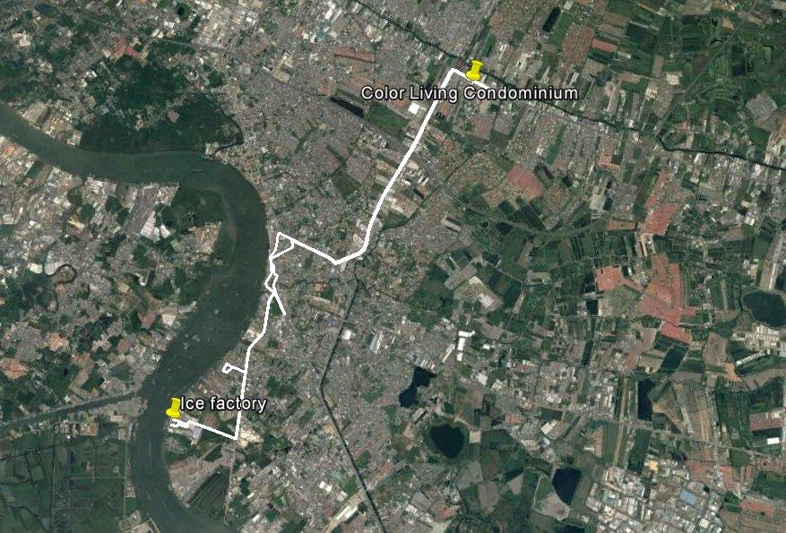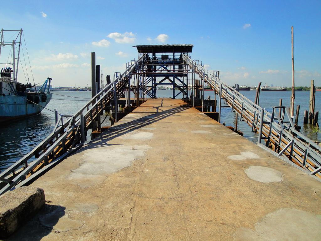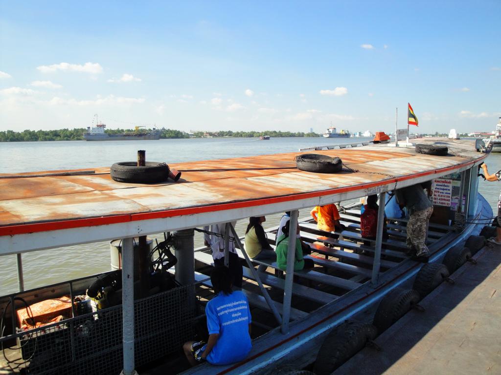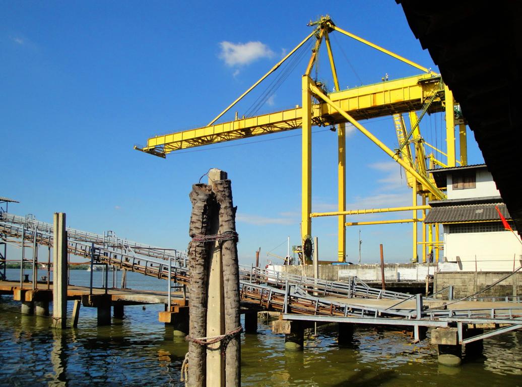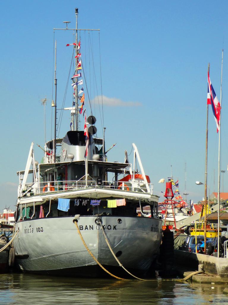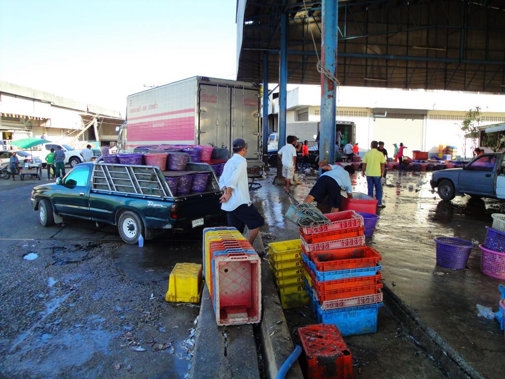 Tour overview … Überblick …Part of the former Samut Prakan city wall. Ein Teil der alten Stadtmauer von Samut Prakan.I was tempted to go on board and see where I would end up … but I didn’t want to leave my motorcycle behind. Es hätte mich schon gereizt, an Bord zu gehen und zu sehen, wo mich der Kapitän hinschippern würde … aber ich wollte meinen Roller nicht zurücklassen.Even the ropes looked pretty much relaxed … Sogar die Taue sahen sehr entspannt aus …Colourful from outside – probably brown from inside … Außen schön farbig – innen wahrscheinlich eher braun …I did not know yet what it was all about … Noch hatte ich keine Ahnung, wo ich hier hingeraten war …… still being impressed how close I could get to the tall ships … immer wieder beeindruckend, wie nah ich an diese großen Schiffe herankommen konnte …… and cranes. … und an die Kräne.What could it be? Something to up- or unload a ship? But what …? Was könnte das denn sein? Etwas, um Schiffe zu be- oder entladen? Aber was genau?Different shape. I didn’t expect a ship to look like this one here … Eine etwas unterschiedliche Form. Ich hatte nicht damit gerechnet, daß ein Schiff so geschnitten ist …Ahhh, fishes … other seafood … Ahhh, Fische und andere Meeresfrüchte …Obviously sold on spot – directly from the ship to the vendors … Offenbar direkt an Ort und Stelle verkauft – direkt vom Fangschiff an die Händler …Ready to leave and sell it at a market … Bereit für die Abfahrt und den Verkauf auf einem Markt …Out of balance … Leichte Schieflage …Yellow door with a red handle … Gelbe Tür mit rotem Griff …Finally I discovered this building … Und dann entdeckte ich dieses Gebäude …… and its purpose: … und erkannte seinen Zweck:A huge freezer to produce large ice cubes. Es handelte sich um einen überdimensionierten Gefrierschrank, der große Eiswürfel produzierte.But before being uploaded onto a truck or ship those blocks had to be ‚adjusted’… Aber bevor die auf einen Lkw oder ein Schiff verladen wurden, mussten sie etwas ‚angepasst‘ werden …Those blue plastic boxes on the truck appeared not big enough for the big block of ice seen before … Die blauen Kisten auf der Ladefläche schienen zu klein zu sein um einen der großen Blöcke, die ich vorher gesehen hatte, zu fassen …Here we go: Don’t mess around with me – I’ll crush everything getting too close to me … Ach so: Mach keinen Ärger – ich zerkleinere alles was mir zu nahe kommt …Big block coming … Hier kommt ein großer Eiswürfel …… being fed to the crusher … wird gekonnt in den Brecher geschoben …… within 1 minute it’s gone … und innerhalb von einer Minute ist der Block zerkleinert …… and uploaded into the boxes. … und auf die bereitstehenden Boxen verteilt.Good man – don’t waste anything. So soll das sein – bis zum letzten Rest.