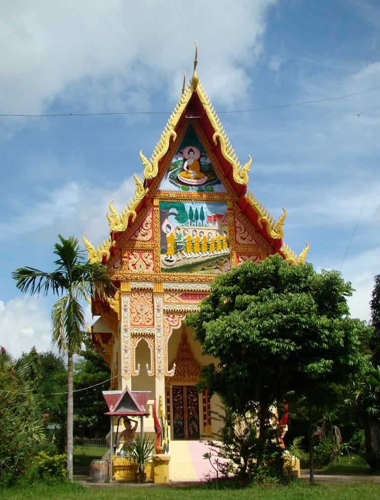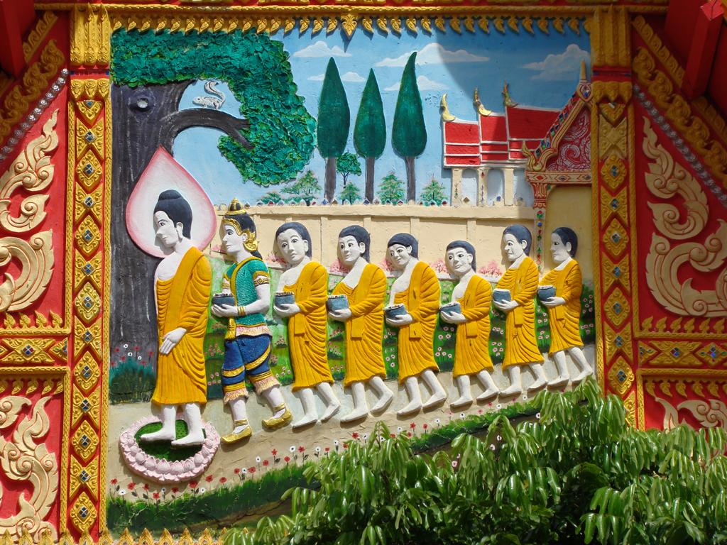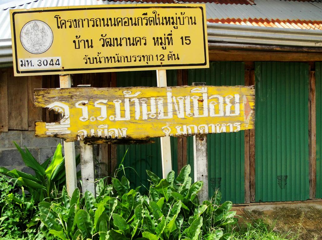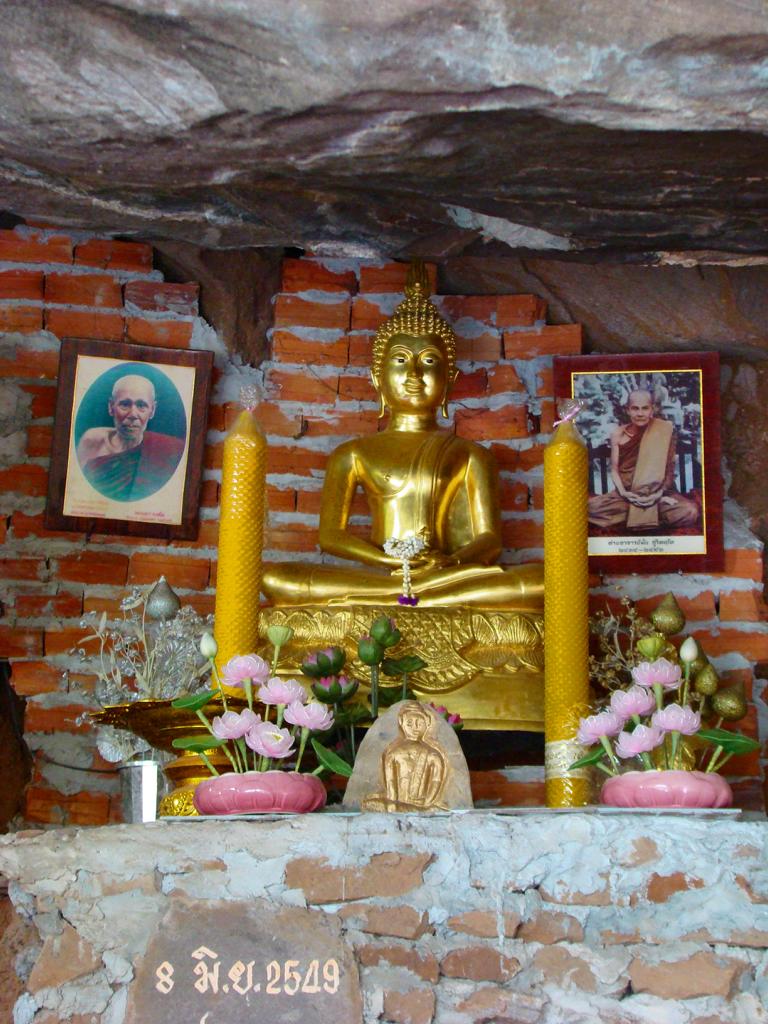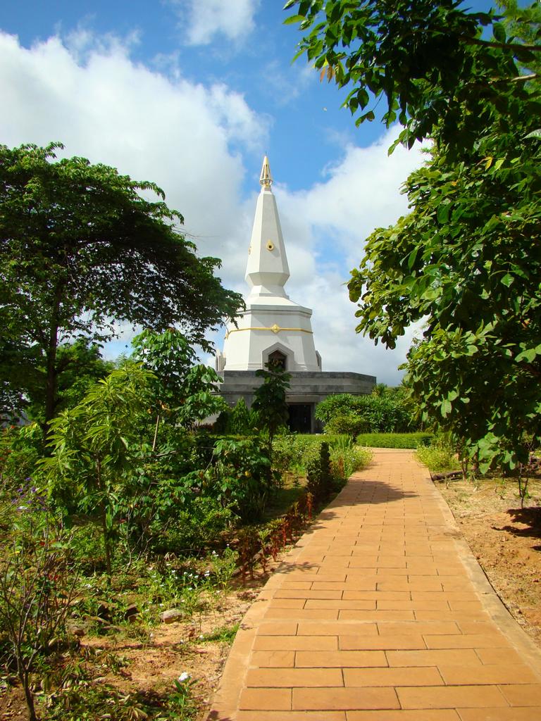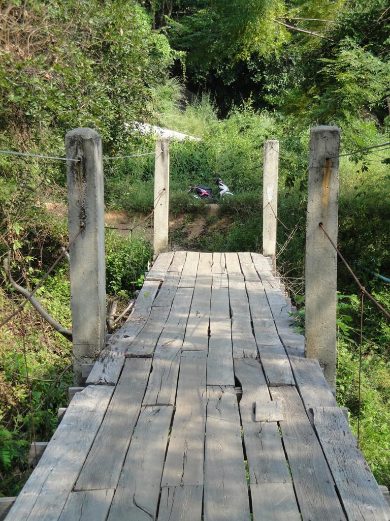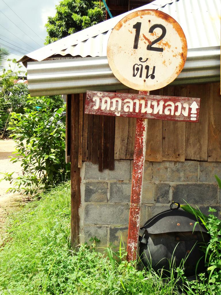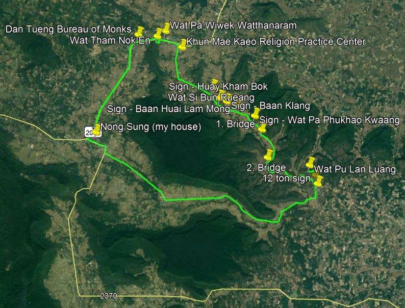 Tour overview … ÜberblickIn front of the Bureau of Monks in Kamcha-i. Vor dem Büro für Mönchsangelegenheiten in Kamcha-i.A very basic kuti. This one looked more like a decoration than a really used one. But in poor, remote regions of Thailand monks are still staying in ‚houses‘ like this. Most temples in Thailand receive enough donations to build proper houses for their monks. Die sehr einfache Unterkunft eines Mönches. Sie sah eher wie ein Austellungsstück aus als wie eine wirklich genutzte Hütte. Aber in den armen, abgelegenen Gegenden Thailands leben die Mönche immer noch in Unterkünften wie dieser. Die meisten Tempel in Thailand erhalten auseichend viele Spenden um deutlich bessere Häuser für die Mönche zu bauen.Small, colourful chedis around Wat Pa Wiwek Watthanaram. Kleine, farbenfrohe Chedis am Wat Pa Wiwek Watthanaram.At Wat Pa Wiwek Watthanaram. Am Pa Wiwek Watthanaram.Golden sitting Buddha – framed by detailed ornaments … Ein goldener, sitzender Buddha – eingerahmt von fein ausgearbeiteten Verzierungen …Huge candles – blown out by the wind. Große Kerzen – ausgelöscht vom Wind.A ‚rocky‘ sign at the entrance of Wat Tham Nok En. Ein Felszeichen an der Zufahrt zum Wat Tham Nok En.A huge, black gong with golden , painted ornaments. Ein großer, schwarzer Gong mit aufgemalten, goldenen Verzierungen.Everything quite basic here … Alles recht einfach hier …At least the altar looks very solid underneath the rocks. Aber zumindest der Altar unter den Felsen sah stabil aus.A closer look … new candles, lotus flowers and photos of revered monks. Blick aus der Nähe … neue Kerzen, Lotusblumen und Fotos verehrter Mönche.And it goes further up … Und es ging noch weiter nach oben …Obviously not the first and not the last candle to be lit up here … Offenbar nicht die erste und auch nicht die letzte Kerze, die hier angezündet wurde …Two huge Buddha statues outside – one in white … Draußen zwei große Buddhastatuen – eine in weiß …… the other one in gold. … und die andere in Gold.This sign told me that I arrived at the chedi to honour Mae Chee Kaew, revered as a modern enlightened Buddhist saint in the Thai forest tradition. Dieses Schild zeigte mir, daß ich den Chedi zu Ehren von Mae Chee Kaew erreicht hatte. Sie wird als moderne, buddhistische Heilige verehrt, die den Regeln einer bestimmten Tradition folgte.Her statue is well protected from the sun and the rain. Ihre Statue ist gut vor der Sonne und dem Regen geschützt.A chedi (or reliquary stupa) has been built to display her relics and a few belongings. Man hat einen Chedi bzw. eine religiöse Stupa errichtet um ihre sterblichen Überreste und einige Erinnerungsstücke zu präsentieren.I kind of liked the modern, straight style … Mir gefällt der moderne, nüchterne Stil …The chedi is surrounded by nice gardens and wide stairs provide access to the upper floor…. Der Chedi ist von schönen Gärten umgeben und breite Treppen führen zum oberen Stockwerk …Reflections on a small pond behind the chedi. Spiegelungen in einem kleinen Teich hinter dem Chedi.I’m pretty sure they built modern facilities already … Ich bin mir ziemlich sicher, daß man inzwischen eine zeitgemäßere Anlage gebaut hat …At Wat Si Bun Rueang. Am Wat Si Bun Rueang.Walking, enlightened Buddha with followers … Wandelnder, erleuchteter Buddha mit Anhängern …Blue gable with golden ornaments framing a praying Buddha. Blauer Giebel mit goldenen Verzierungen, die einen betenden Buddha einrahmen.The sign of Huay Kham Bok village. Das Ortsschild des Dorfes Huay Kham Bok.The sign of Baan Klang village. Das Ortsschild des Dorfes Baan Klang.The sign of Baan Huay Lam Mong village. There were even more similar looking signs along this stretch of the ‚road‘ … Das Ortsschild des Dorfes Baan Huay Lam Mong. Und entlang dieser Strecke gab es sogar noch mehr ähnliche Schilder …… but I went on and across from this tree I saw … aber ich bin weitergefahren und gegenüber dieses Baumes sah ich …… this sign of Wat Pa Phukhao Kwaang which looked really beautiful. I don’t know why I didn’t follow it to have a look at the temple. … dieses sehr schöne Hinweisschild zum Tempel Pa Phukhao. Keine Ahnung warum ich dem Hinweis nicht gefolgt bin um mir den Tempel anzusehen …So, instead of visiting another temple, I stopped by at this bridge. The railing looked pretty unsafe. Also, anstatt wieder einen Temple zu besuchen, habe ich an dieser Brücke angehalten. Das Geländer sah sehr unsicher aus.But I dared to walk onto the brigde and it felt … a bit ’shaky‘ – as you can imagine. Aber ich habe mich trotzdem auf die Brücke gewagt und es fühlte sich … etwas wackelig an – was man sich bestimmt gut vorstellen kann.But the area around was quite nice and could provide a ’sandy beach‘ … Aber die Umgebung sah ganz nett aus und es gab sogar einen ‚Sandstrand‘ …Ok, back upwards to the slightly better ‚road‘ … (When I look at these photos now, I think I really must have tortured my bike). Ok, zurück nach oben auf die andeutungsweise bessere ‚Straße‘ … (wenn ich mir diese Bilder jetzt ansehe, denke ich, daß ich meinen Roller wirklich gequält habe).Not really ‚rainproof‘ anymore … Nicht mehr wirklich ‚regendicht‘ …Due to the nice view from the bridge before, I tried to find another one. Here it is … Nach dem schönen Blick von der letzten Brücke habe ich versucht, noch eine andere zu finden. Hier ist sie …It looked not trustworthy – but I trusted in my poor swimming skills – and crossed it. Die Brücke sah nicht vertrauenswürdig aus – aber ich habe auf meine schlechten Schwimmkenntnisse vertraut – und bin darüber gegangen.Hmm, not as nice as before – but more ’sandy beaches‘ stretching out along this small creek here. Hmm, nicht so schön wie zuvor – aber es gab mehr ‚Sandstrände‘, die sich entlang dieses kleinen Flusses erstreckte