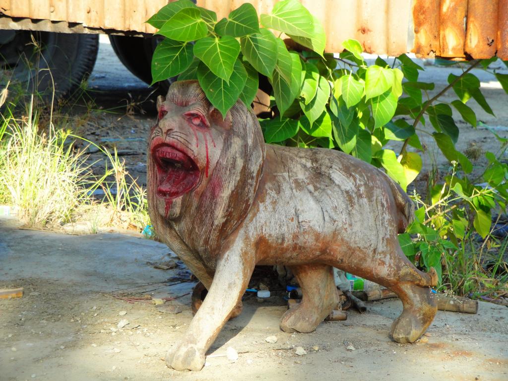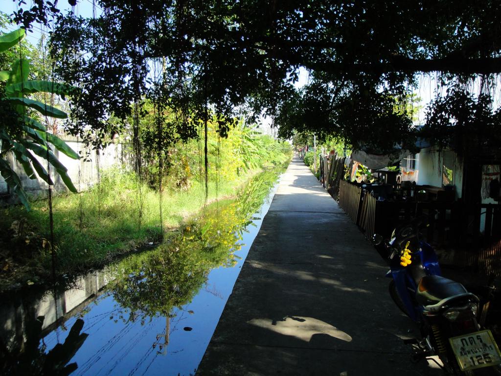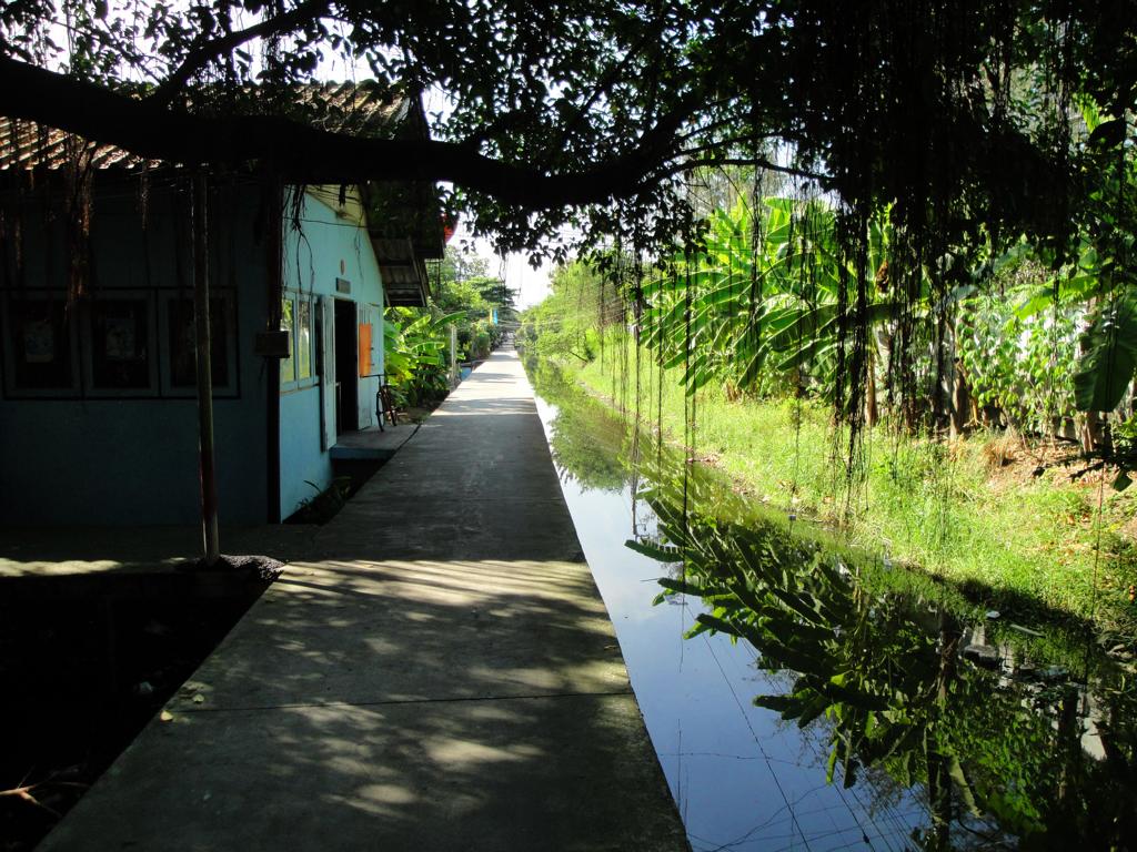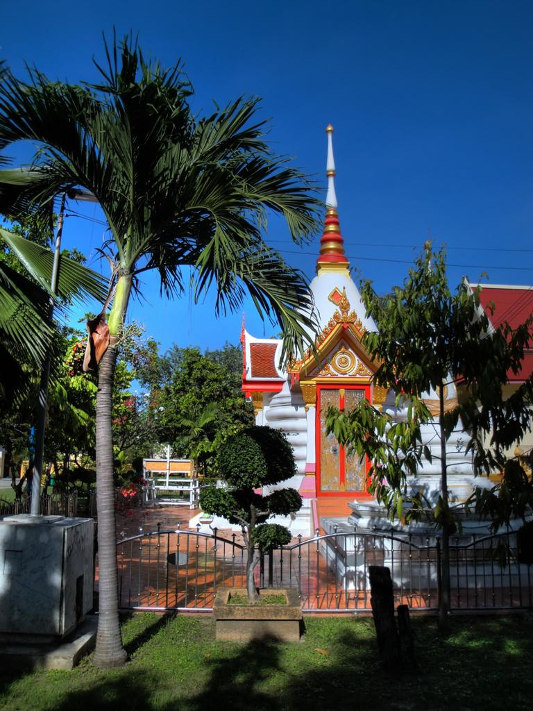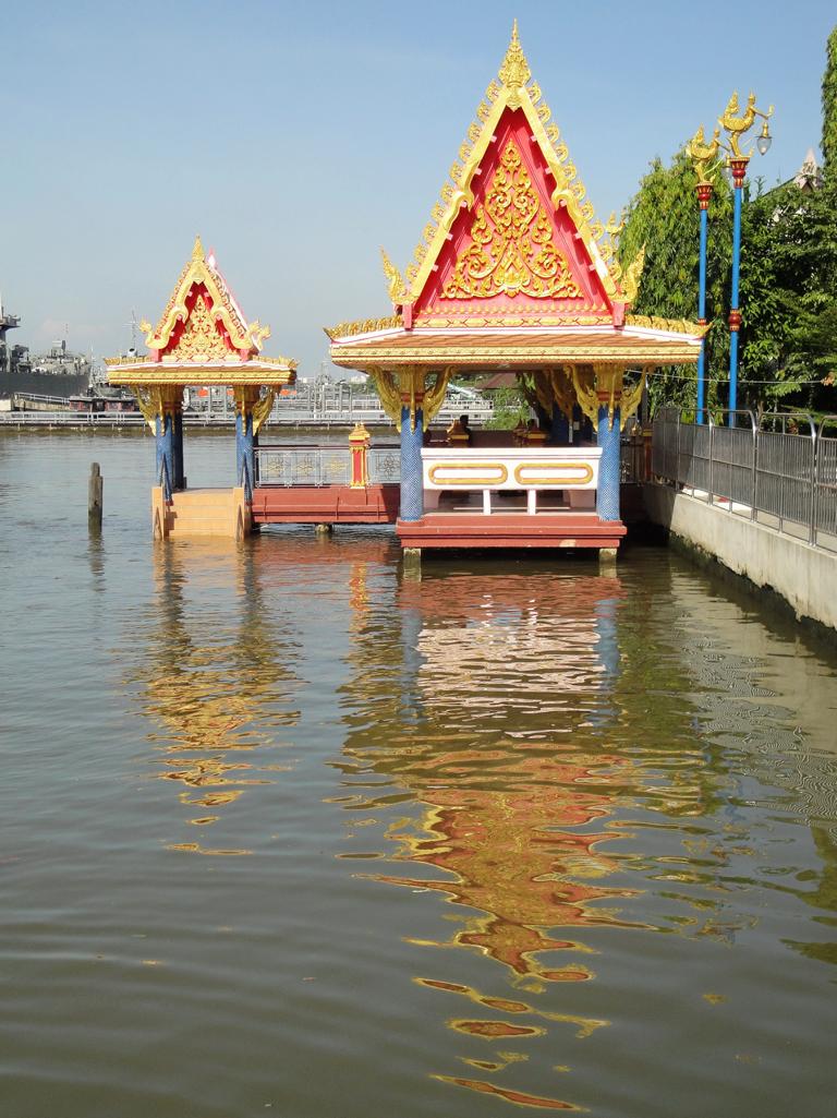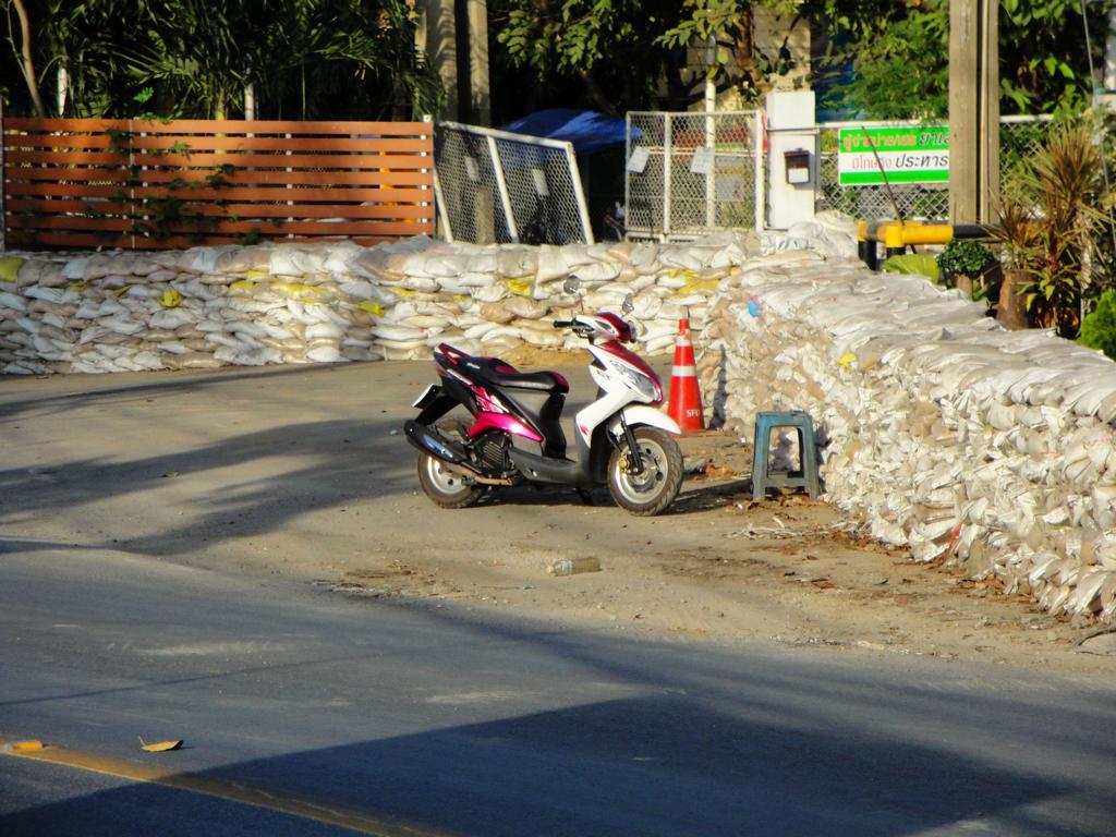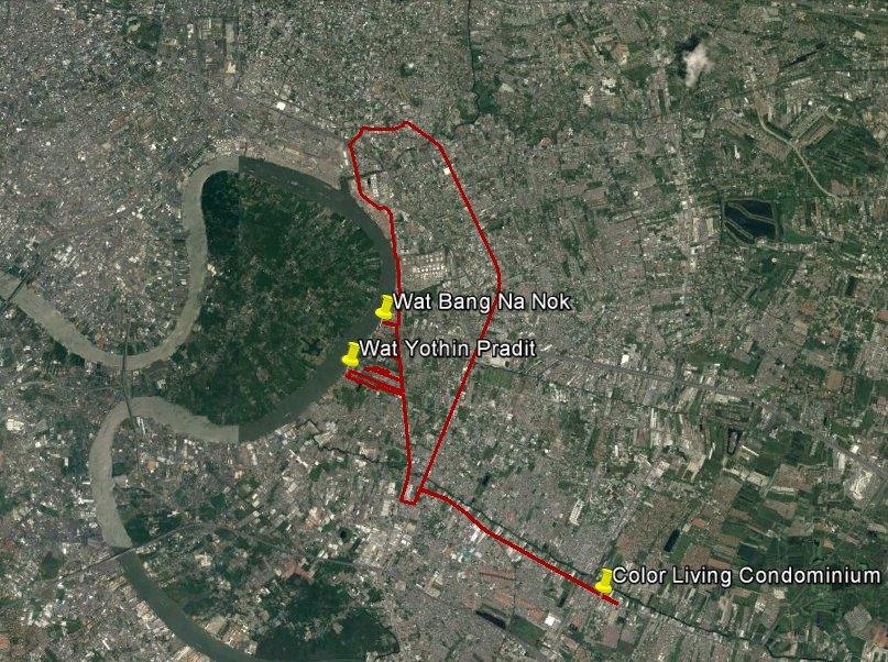 Tour overview … Überblick …Welcome to Thailand … Willkommen in Thailand …The Royal Thai Navy is here already … Die Königliche Marine Thailands ist schon vor Ort …Obviously the water level has been a bit higher before – but it still doesn’t look ’normally‘ here … Offensichtlich stand das Wasser zuvor schon mal etwas höher – aber so ganz ’normal‘ sah das immer noch nicht aus …Wat Yothin Pradit. Am Yothin Pradit Tempel.1.8 km straight along a small, idyllic canal … 1.8 Kilometer geradeaus an einem kleinen, idyllischen Kanal entlang …Wide enough for 2 motorcycles, here and there even providing shadow for pedestrians … Breit genug für 2 Roller, und ab und zu gab es sogar etwas Schatten für Fußgänger …No other foreigners here. Ich war wieder mal der einzige Ausländer hier.And up … and down … and one more time … Und auf … und ab … und noch einmal …Not a place where I would like to live. But … Kein Block in dem ich leben wollte. Aber …… providing a nice view towards Bangkok. … er bot einen guten Ausblick auf Bangkok.High security … Hochsicherheitsbereich …Unreadable … Nicht mehr zu lesen …No, it’s not a river cruise. It’s a regular ferry along the Chaophraya river. Nein, kein Ausflugsdampfer. Es handelt sich um eine der normalen Fähren über den Chaophraya Fluss.Approaching the harbour … Annäherung an den Hafen …One option to cross the river with a motorcycle … Eine der Möglichkeiten, den Chaophraya mit dem Roller zu überqueren …Will he go swimming – or is he just trying to catch a fish? Wird er reinspringen um zu schwimmen – oder versucht er nur, einen Fisch zu fangen?Ok, I didn’t count these here … Ok, diese Paletten habe ich nicht gezählt …But here you see 284 pallets … aber hier sieht man 284 Paletten …Beautiful colours. Just a nice day to go out and take a few photos … Mir gefielen die Farben. Einfach ein schöner Tag um etwas zu unternehmen und Fotos zu machen …It would have been interesting to climb up but … Es wäre ja interessant gewesen, da mal hoch zu steigen aber …… the watchdog looked really dangerous and bloodthirsty! … der Wachhund sah wirklich gefährlich und blutdürstig aus!Tip of the chimney. Spitze eines alten Schornsteins.Trying to cover it all … Der Versuch, alles zu überdecken …Flood protection … Hochwasserschutz …Refinery’s chimney … Schornstein einer Raffinerie …The ship knows where it belongs … Das Schiff weiss schon, wo es hingehört …Anything for free here? Ob es da etwas umsonst gibt?Obviously cheap gas for taxis … Offensichtlich günstiges Gas für die Taxis …Pretty common in Bangkok: Contrast between shiny offices … Ein üblicher Anblick in Bangkok: Kontrast zwischen glänzenden Fassaden …… and deserted ruins. … und verlassenen Ruinen.