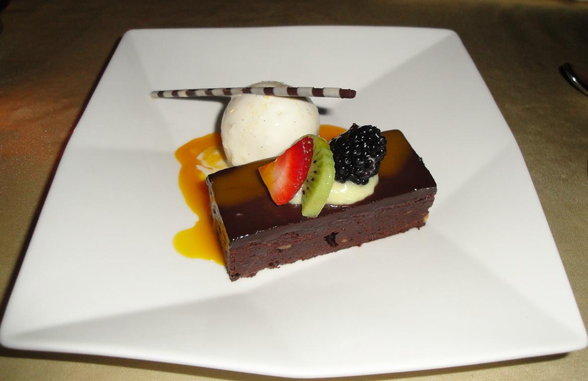 … followed by ice cream and heavy chocolate cake. … gefolgt von Eiscreme und gehaltvollem Schokoladenkuchen.