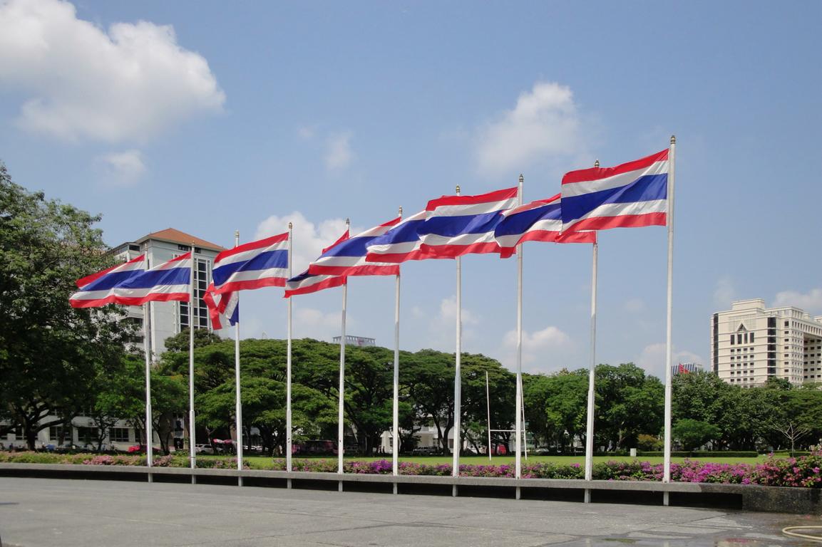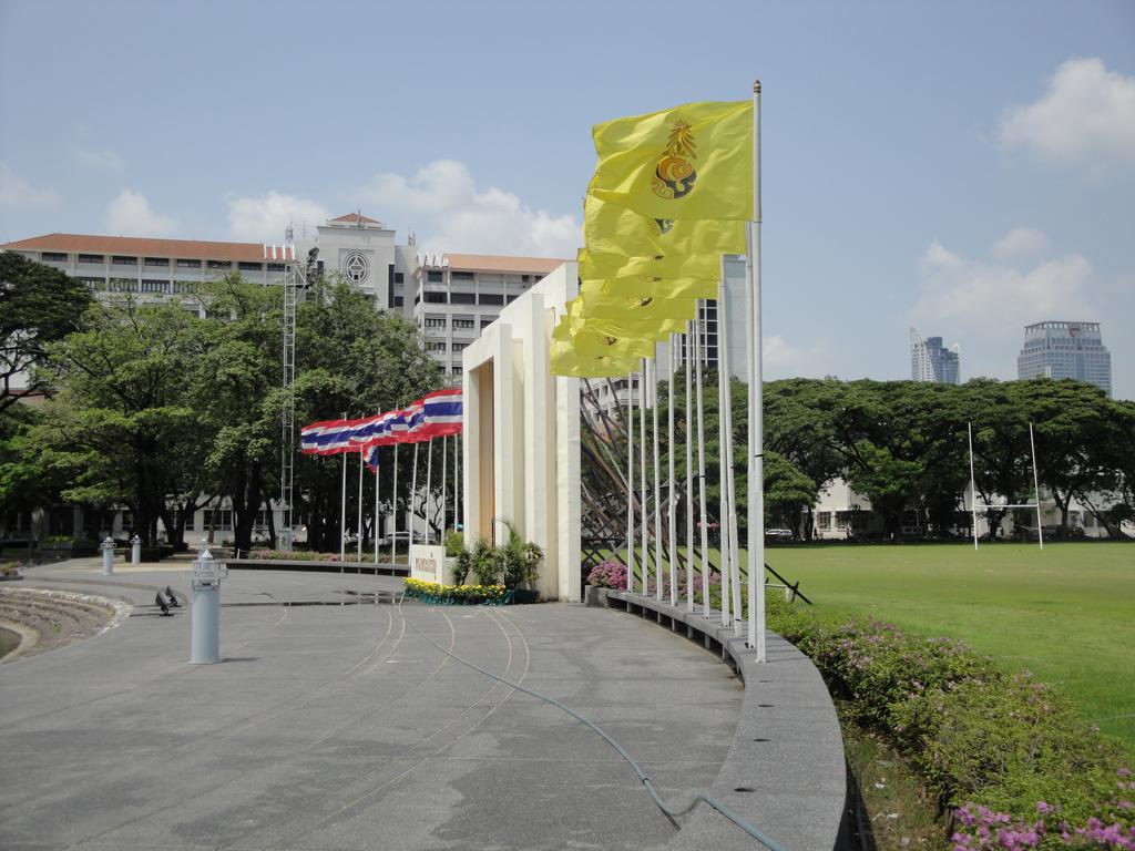 It’s one of the best universities in Thailand. 10 yellow flags representing the king, a huge image of the king in the centre and 10 Thai flags in the background. Es handelt sich um eine der besten Universitäten in Thailand. 10 gelbe Flaggen stehen für den König und die königliche Familie. In der Mitte ein großes Abbild des Königs und hinten 10 thailändische Flaggen.
