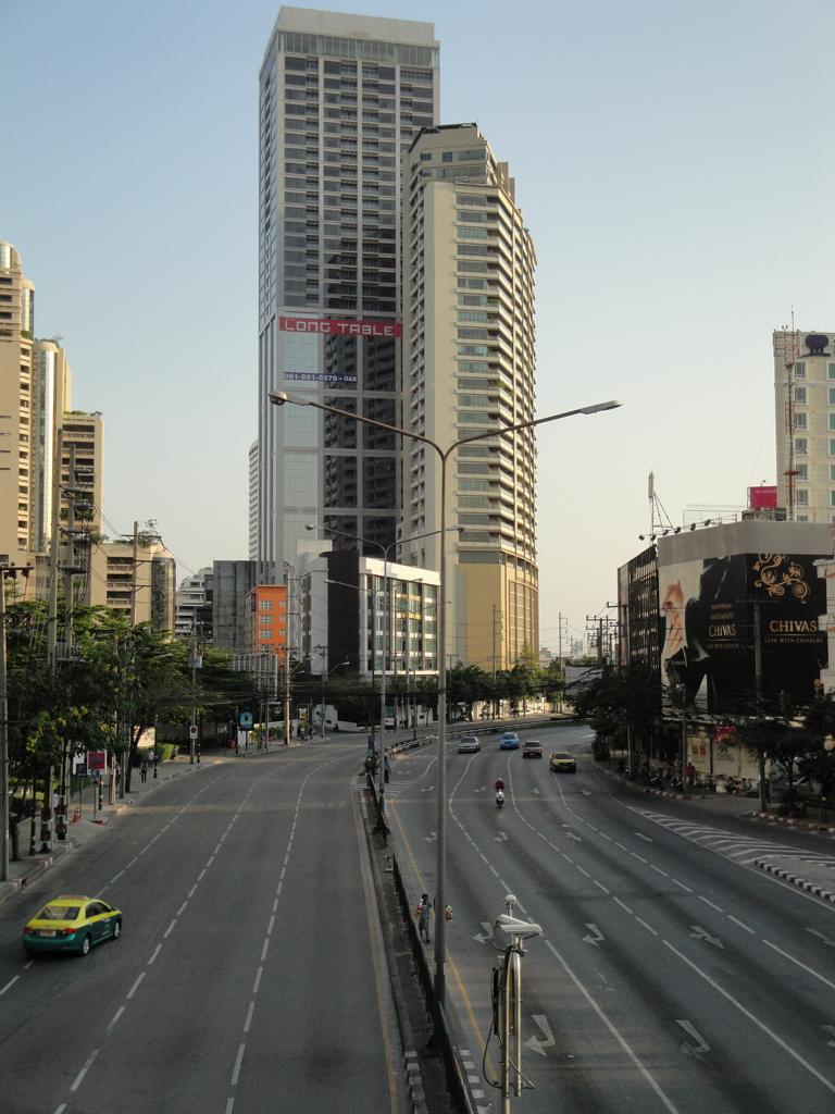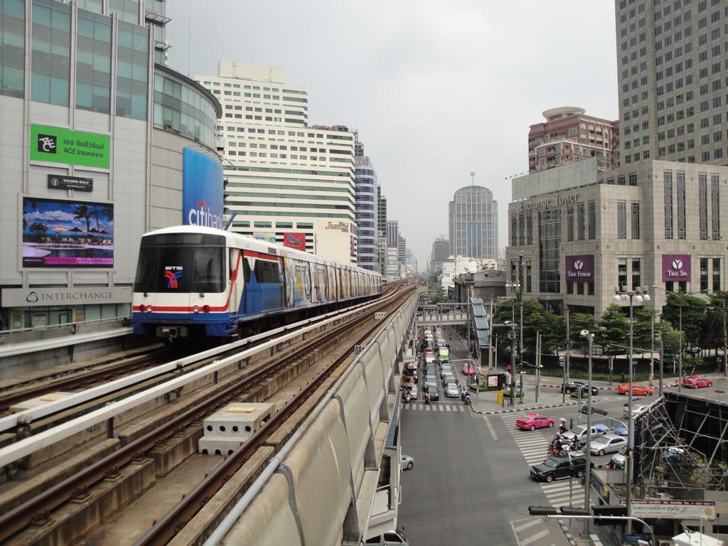 Looking down Sukhumvit Rd. along the BTS (Bangkok Transit System) track from Asok station. Der Blick von der Asok Haltestelle auf die Sukhumvit Straße entlang der BTS (Bangkok Transit System) Schienen.