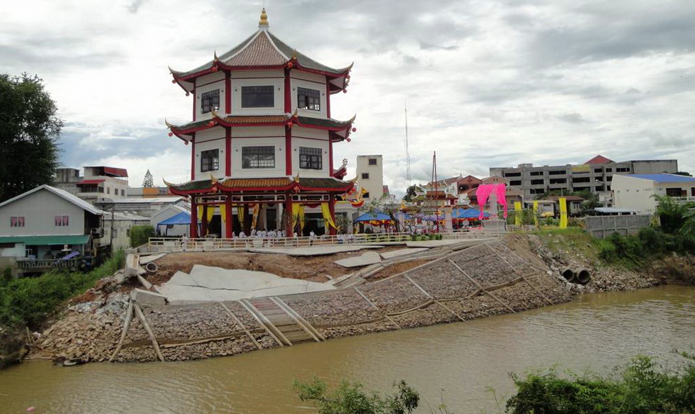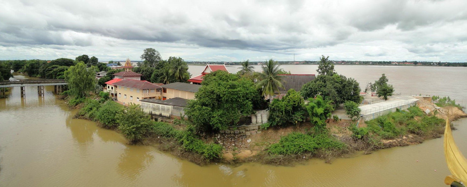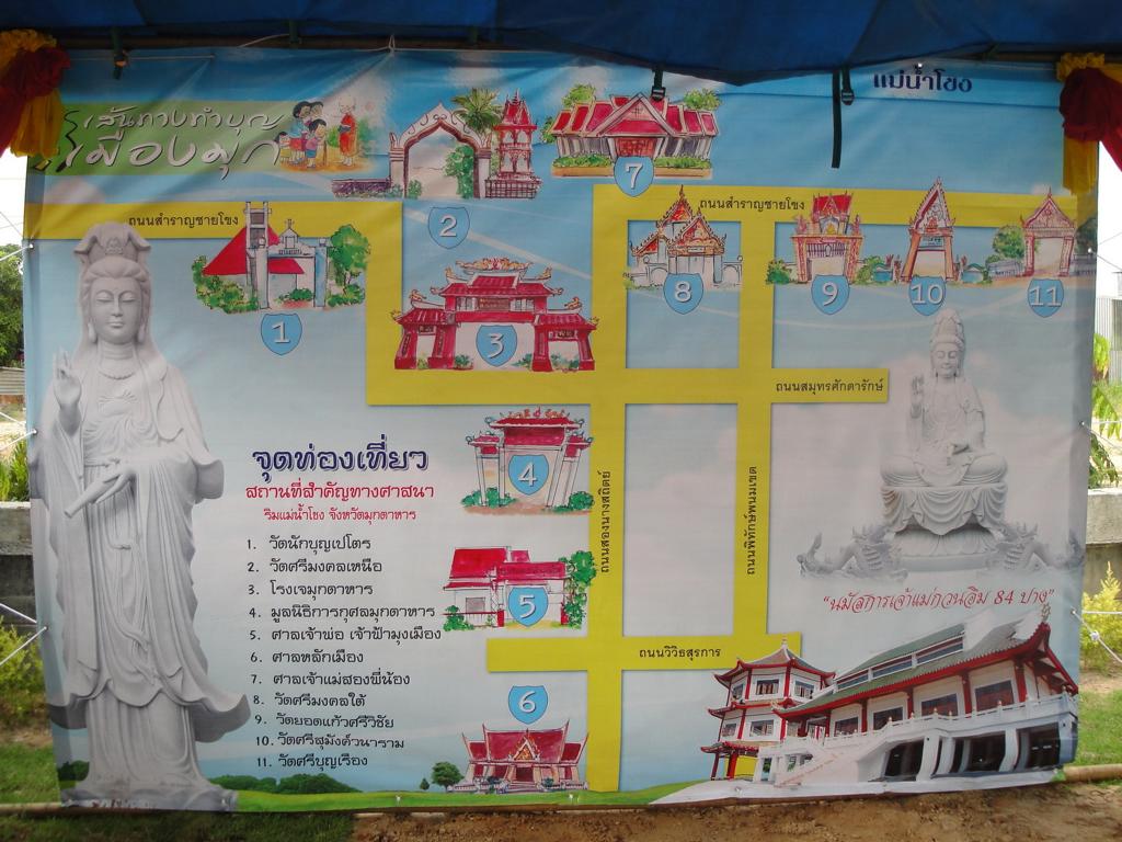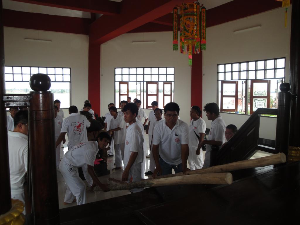 Welcome … Willkommen …The main building – ready to be opened. Das Hauptgebäude – bereit zur Eröffnung.Pink decoration – nice or … ? Rosa Umhang – schön oder … ?Savannakhet – in the background – is on the other side of the river in Laos. Savannakhet – im Hintergrund – liegt auf der anderen Seite des Flusses in Laos.I couldn’t count them all. But I guess, between 15 and 20 big, wooden statues were presented during a parade through the sourounding streets of Mukdahan. Ich habe sie nicht zählen können. Aber ich denke, zwischen 15 und 20 große, hölzerne Standbilder wurden während einer Parade durch die Stadt präsentiert.And also a few smaller, golden ones. Und auch einige kleinere, goldene Standbilder.Looking south – along the wide Mekhong river … Der Blick nach Süden – entlang des breiten Mekhongs …… and north towards Savannakhet in Laos. … und nach Norden in Richtung von Savannakhet in Laos.The special ‚terrace‘ of a riverfront restaurant. Die besondere ‚Terrasse‘ eines Restaurants am Fluss.A bucket. Ein Eimer.I’m not sure if it was the best decision to build the shrine right there … Nicht sicher ob es eine gute Entscheidung war, den Tempel genau dort zu bauen …At the neighbouring Wat Si Mongkol Nuea. Am benachbarten Si Mongkol Nuea Tempel.Then the first statues arrived at the shrine. Dann kamen die ersten Standbilder am Tempel an.15 young men had problems to lift the heavy statue and carry it upwards. But there was no gap left for more people to get a grip on it … 15 junge Männer hatten Probleme, die schwere Figur anzuheben und die Treppen hinaufzutragen. Aber es gab keine freie Stelle mehr um noch mehr Helfer anfassen zu lassen …The first bottleneck on the way into the tower. Das erste Nadelöhr auf dem Weg in den Turm.Putting the statue in the right position. Abstellen einer Figur an der richtigen Stelle.A lot of space left to be filled with more statues … Noch viel Platz für weitere Statuen …The heavy equipment was really appreciated … Der Gabelstapler kam sehr willkommen …No time to rest – more to come … Keine Zeit für eine Pause – es kamen immer mehr …Good to see that there were enough people to help … Gut zu sehen, daß ausreichend Helfer vor Ort waren …… and every single hand was really needed. … und jede einzelne Hand wurde auch gebraucht …Obviously ‚Made in Vietnam‘. Offensichtlich ‚Hergestellt in Vietnam‘.22 men handling this one – I had to be careful not to block their way while taking photos … 22 Männer bemühten sich um diesen Brocken – ich musste vorsichtig sein, beim Fotografieren nicht im Weg zu stehen …It might have been the better idea to build the shrine around the statues instead of trying to set them up in the completed building … Es wäre wohl eine bessere Idee gewesen, den Tempel um die Figuren zu erbauen anstatt zu versuchen, diese später in dem fertigen Gebäude aufzustellen …It looks like kind of a big relief … Sah wie große Erleichterung aus …… but their job was not done yet. … aber die Arbeit war ja noch nicht beendet …4 more steps to overcome … Vier weitere Stufen mussten überwunden werden …… then it was time to remove the handles … dann war es an der Zeit, die unterstützenden Griffhölzer zu entfernen …… and pose for a photo. … und für ein Foto zu posieren.It must be the statue of the most important individual because it was set up on the top floor and a special podium. Es muss sich wohl um das Abbild der bedeutendsten Person gehandelt haben denn sie wurde im obersten Stockwerk auf einem eigenen Podest aufgestellt.My Thai is not good enough to be able to read what was written there. But it shows the route of the parade through te city. Mein Thai ist nicht gut genug um alles zu lesen. Aber hier sieht man die Route der Parade durch die Stadt.