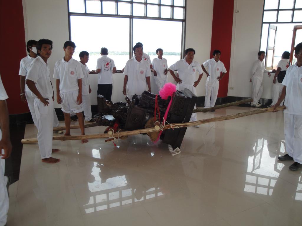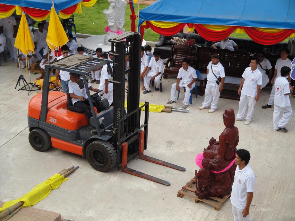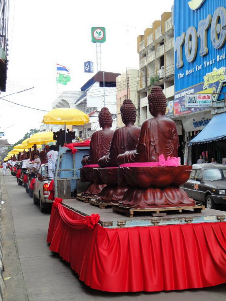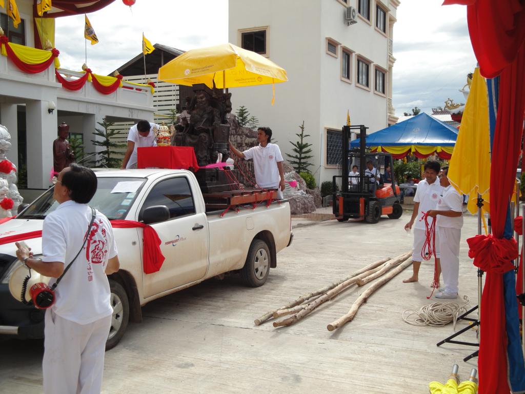 Eines Tages lud mich eine Bekannte ein, mit ihrem Wagen nach Mukdahan zu fahren um der Ankunft von neuen, hölzernen Statuen für den Tempel beizuwohnen.