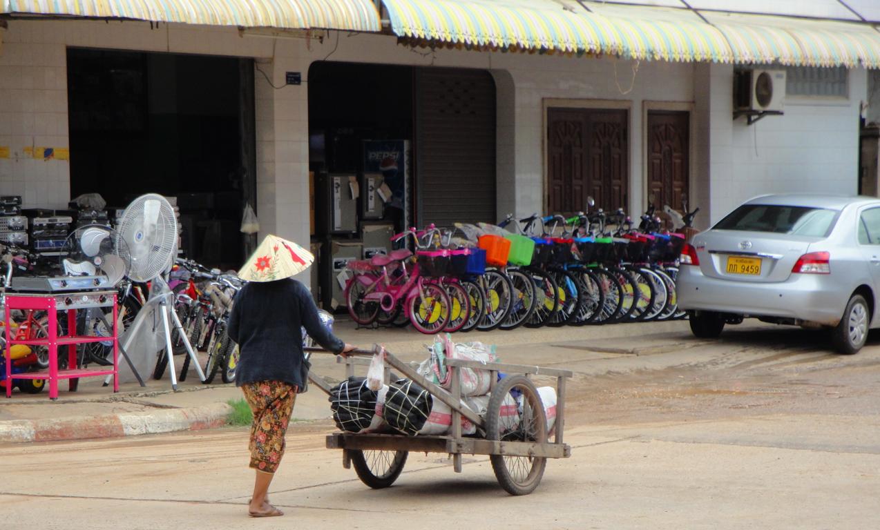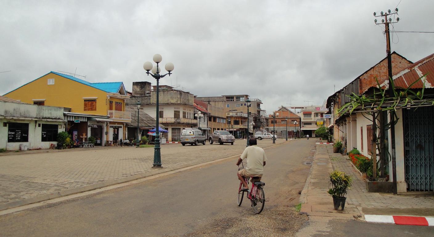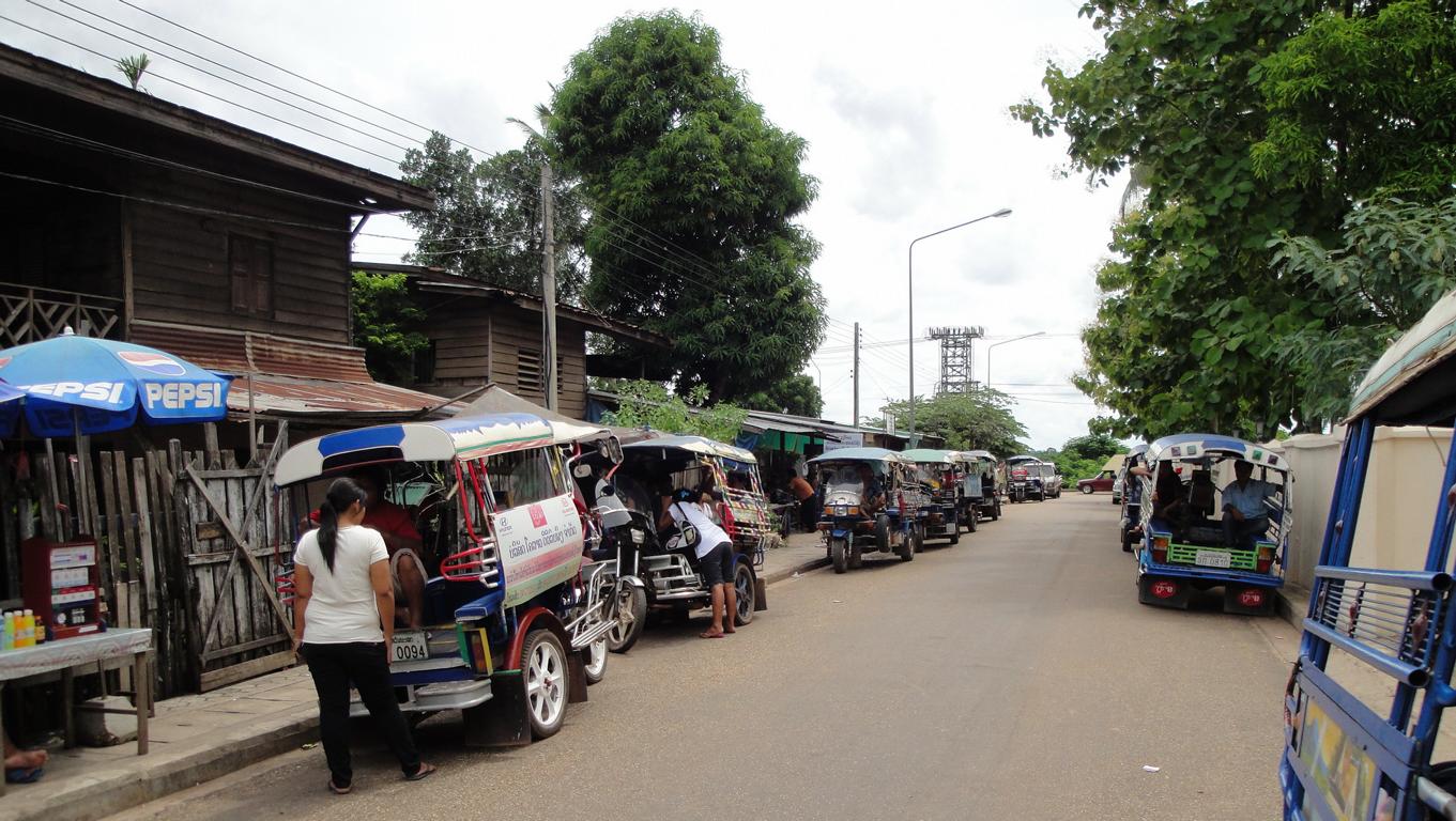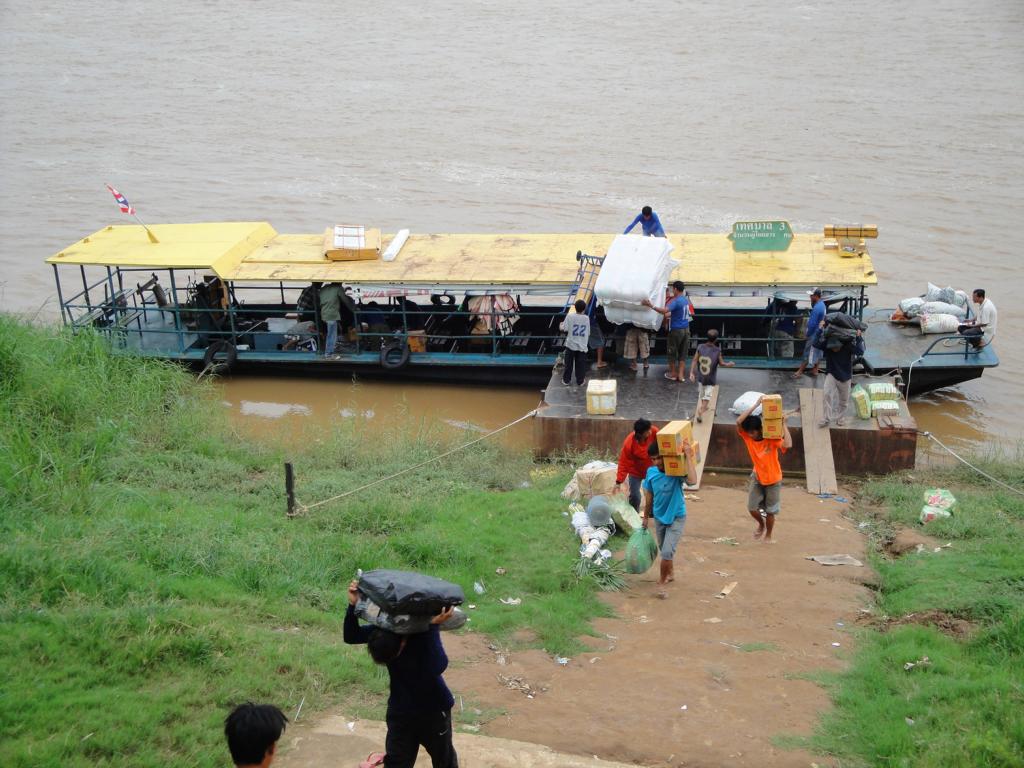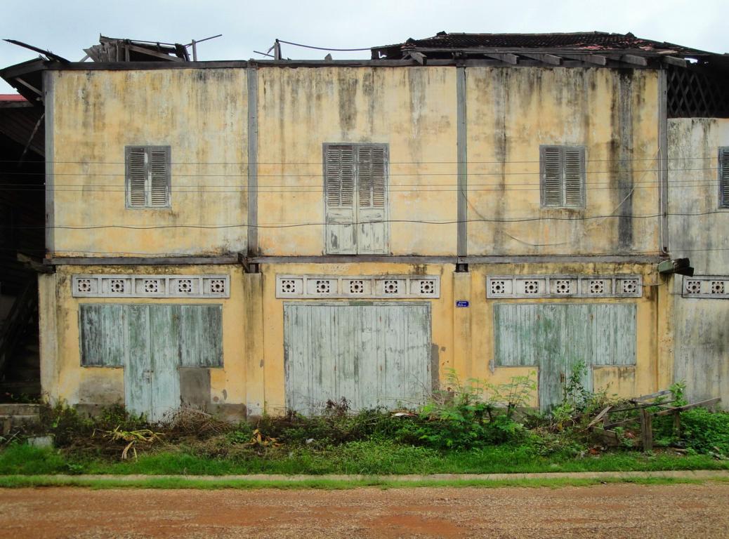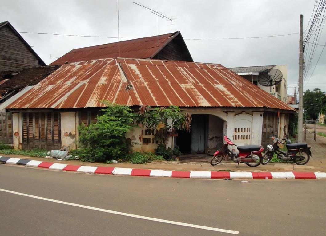 Overview … Mukdahan and Savannakhet are pretty much exactly on the opposite side on the banks of the Mekong river. It’s a few kilometers heading north to the connecting bridge and then back southwards to get from one city to the other. Überblick … Mukdahan und Savannakhet liegen praktisch genau gegenüber an unterschiedlichen Seiten des Mekong Flusses. Man fährt einige Kilometer nach Norden zu der Verbindungsbrücke, überquert diese und dann wieder einige Kilometer nach Süden um von einer Stadt in die andere zu gelangen.At the border I got the visa for Laos stamped in my passport. An der Grenze wurde das Visum für Laos in meinen Pass gestempelt.The sign of the Royal Thai Consulate in Savannakhet. Das Schild an dem Königlich Thailändischen Konsulat in Savannakhet.After delivering my documents I was on my own and began walking around in Savannakhet for a few hours. I wouldn’t call Mukdahan a modern city – but here everything appeared to be … a bit more antique. Nach Abgabe meiner Unterlagen war ich alleine und begann, für einige Stunden in Savannakhet herumzulaufen. Ich würde Mukdahan nicht als moderne Stadt bezeichnen – aber hier schien alles noch etwas … älter zu sein.One entrance to the big market next to the main bus station. Einer der Zugänge zu dem großen Markt bei dem Busbahnhof.Obviously the transport of goods appeared to be a bit old-fashioned … Offenbar war der Transport von Waren immer noch etwas altmodisch …There have never been any Olympic events in Laos. The National Olympic Committee of Laos was formed in 1975 and officially recognized by the International Olympic Committee in 1979. Nevertheless Laos displayed a similar looking (slightly different shape, white ring instead of a black one, different order of colours) on a wall surrounding the ‚Old Stadium‘, built in 1961 already. Es hat nie eine olympische Veranstaltug in Laos stattgefunden. Das nationale olympische Komitee von Laos wurde 1975 gegründet und 1979 von dem internationalen olympischen Komitee offiziell anerkannt. Trotzdem zeigte Laos schon 1961 ein dem offiziellen Symbol ähnliches Zeichen an einer Wand des ‚Alten Stadions‘.Many building here looked like from a movie scene: Show the front side – but probably nothing behind it … Viele Gebäude in der Stadt sahen aus wie aus einer Filmlandschaft: Man sah die Fassade – aber dahinter gab es vermutlich überhaupt nichts.I didn’t walk in. In my fantasy it was something like an illegal gambling den with mafia memebers smoking opium … Hier bin ich nicht reingegangen. In meiner Fantasie handelte es sich um eine illegale Spielhölle mit Mafiamitgliedern, die Opium rauchten …This ‚piece of fine arts‘ has been drawn on the wall of the building in the picture above … So, maybe it was just a regular brothel with illegal prostitutes and thus nothing to worry about … 😉 Diese Skizze fand ich an einer der Außenwände des obigen Gebäudes … so, vielleicht handelte es sich nur um ein normales Bordell mit illegalen Prostituierten und deshalb nicht weiter besorgniserregend … 😉I guess, a few hard kicks against the central support underneath the balconies would cause the whole building to collapse … Ich glaube, einige harte Tritte gegen die mittige Stütze unter den Balkonen würden das ganze Gebäude zum Einsturz bringen …One thing I really liked here was the number of cars … Was mir wirklich gut gefiel war die Anzahl der Fahrzeuge …The front of St. Teresa’s Catholic Church. Die Eingangsseite der katholischen St. Teresa Kirche.Everything appeared to be more relaxed … Alles hier erschien deutlich entspannter …Road repair workers in brand new jackets … Straßenbauarbeiten in nagelneuen Jacken …With enough funds you can keep everything in good shape. This building has been built 84 years ago! And now it serves as a nice looking guesthouse. Mit dem nötigen Geld in der Hinterhand kann man alles gut erhalten. Dieses Gebäude wurde vor 84 Jahren erbaut! Und jetzt dient es als schön aussehendes Hotel.Even the signs along the Mekong river looked quite old … Sogar die Schilder entlang des Flusses sahen ziemlich alt aus …One of many interesting looking buildings. But impossible to determine the history or the actual purpose … Eins von vielen interessant aussehenden Gebäuden. Aber es war mir nicht möglich, mehr über die Geschichte oder aktuelle Nutzung zu erfahren.There was a small pier for the ferries between Mukdahan in Thailand and Savannakhet in Laos. And I even saw somehting like a checkpoint where people had to fill in forms or just show their passports. But based on my observations, the surrounding area, the way how checks were conducted – it must be pretty easy to smuggle many different types of goods from one corrupt country to another corrupt country … Es gab einen kleinen Steg für die Fähre zwischen Mukdahan in Thailand und Savannakhet n Laos. Und ich erkannte sogar etwas wie einen Kontrollpunkt an dem man Formblätter ausfüllen und den Pass zeigen musste. Aber basierend auf meinen Beobachtungen, der gesamten Umgebung und der Art der Kontrollen – es kann nicht allzu schwer gewesen sein, Waren aus einem bestechlichen Land in ein anderes bestechliches Land zu schaffen …Hard work for the porters … Schwere Arbeit für die Träger …Probably cheaper than hiring space in a container or on a truck … Wahrscheinlich billiger als Platz in einem Container oder auf einem Lkw zu buchen …Tricycles waiting in front of the consulate to take people back to the border. Diese motorisierten Dreiräder warteten vor dem Konsulat um die Leute zurück an die Grenze zu fahren.Looking back towards the immigration building at the border … Der Blick zurück auf das Gebäude der Einwanderungsbehörde an der Grenze.