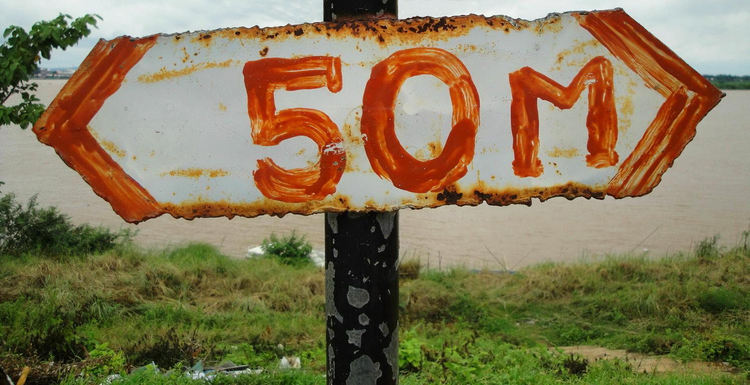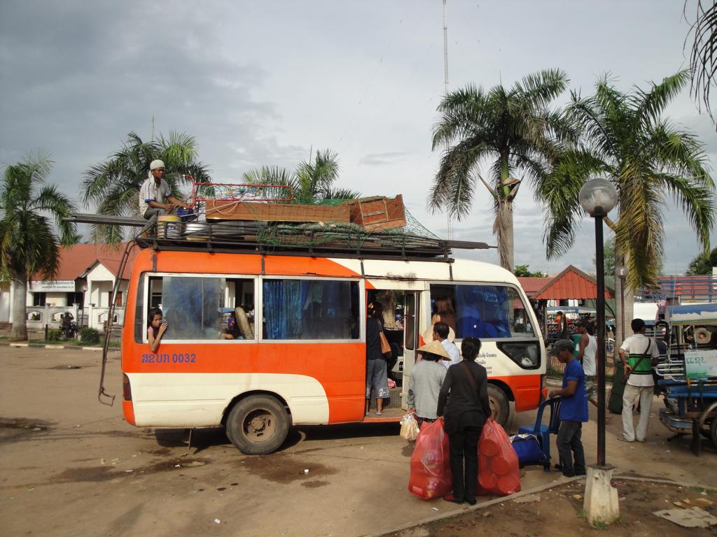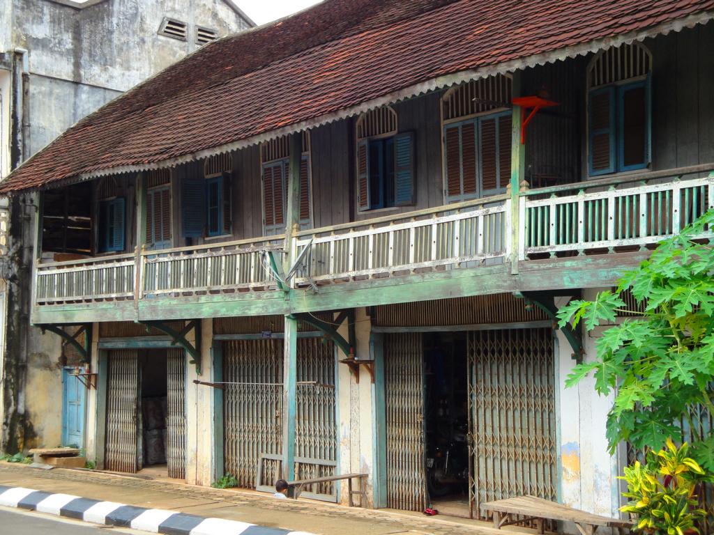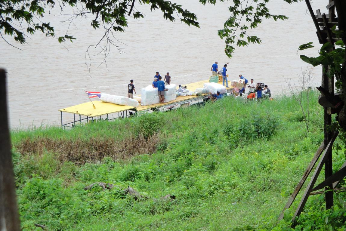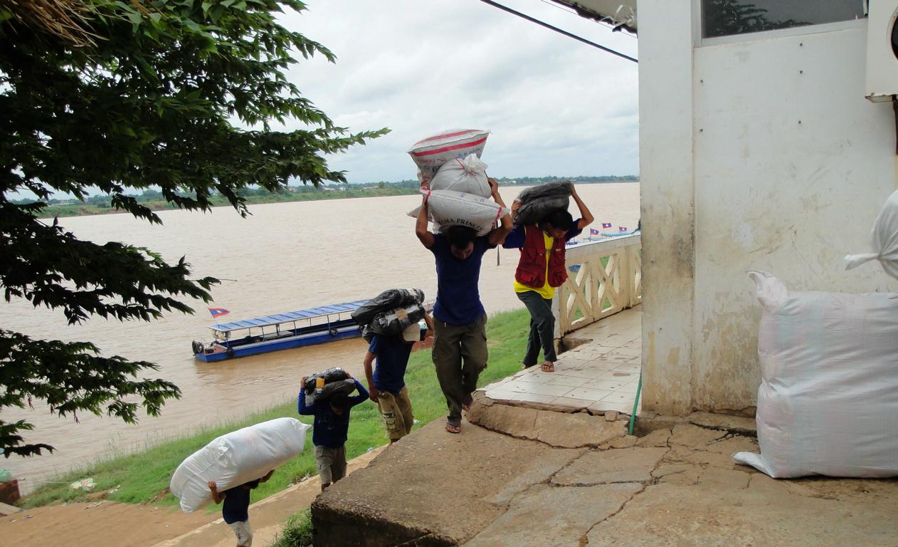 Overview … Mukdahan and Savannakhet are pretty much exactly on the opposite side on the banks of the Mekong river. It’s a few kilometers heading north to the connecting bridge and then back southwards to get from one city to the other. Überblick … Mukdahan und Savannakhet liegen praktisch genau gegenüber an unterschiedlichen Seiten des Mekong Flusses. Man fährt einige Kilometer nach Norden zu der Verbindungsbrücke, überquert diese und dann wieder einige Kilometer nach Süden um von einer Stadt in die andere zu gelangen.At the border I got the visa for Laos stamped in my passport. An der Grenze wurde das Visum für Laos in meinen Pass gestempelt.The sign of the Royal Thai Consulate in Savannakhet. Das Schild an dem Königlich Thailändischen Konsulat in Savannakhet.After delivering my documents I was on my own and began walking around in Savannakhet for a few hours. I wouldn’t call Mukdahan a modern city – but here everything appeared to be … a bit more antique. Nach Abgabe meiner Unterlagen war ich alleine und begann, für einige Stunden in Savannakhet herumzulaufen. Ich würde Mukdahan nicht als moderne Stadt bezeichnen – aber hier schien alles noch etwas … älter zu sein.One entrance to the big market next to the main bus station. Einer der Zugänge zu dem großen Markt bei dem Busbahnhof.Obviously the transport of goods appeared to be a bit old-fashioned … Offenbar war der Transport von Waren immer noch etwas altmodisch …There have never been any Olympic events in Laos. The National Olympic Committee of Laos was formed in 1975 and officially recognized by the International Olympic Committee in 1979. Nevertheless Laos displayed a similar looking (slightly different shape, white ring instead of a black one, different order of colours) on a wall surrounding the ‚Old Stadium‘, built in 1961 already. Es hat nie eine olympische Veranstaltug in Laos stattgefunden. Das nationale olympische Komitee von Laos wurde 1975 gegründet und 1979 von dem internationalen olympischen Komitee offiziell anerkannt. Trotzdem zeigte Laos schon 1961 ein dem offiziellen Symbol ähnliches Zeichen an einer Wand des ‚Alten Stadions‘.Many building here looked like from a movie scene: Show the front side – but probably nothing behind it … Viele Gebäude in der Stadt sahen aus wie aus einer Filmlandschaft: Man sah die Fassade – aber dahinter gab es vermutlich überhaupt nichts.I didn’t walk in. In my fantasy it was something like an illegal gambling den with mafia memebers smoking opium … Hier bin ich nicht reingegangen. In meiner Fantasie handelte es sich um eine illegale Spielhölle mit Mafiamitgliedern, die Opium rauchten …This ‚piece of fine arts‘ has been drawn on the wall of the building in the picture above … So, maybe it was just a regular brothel with illegal prostitutes and thus nothing to worry about … 😉 Diese Skizze fand ich an einer der Außenwände des obigen Gebäudes … so, vielleicht handelte es sich nur um ein normales Bordell mit illegalen Prostituierten und deshalb nicht weiter besorgniserregend … 😉I guess, a few hard kicks against the central support underneath the balconies would cause the whole building to collapse … Ich glaube, einige harte Tritte gegen die mittige Stütze unter den Balkonen würden das ganze Gebäude zum Einsturz bringen …One thing I really liked here was the number of cars … Was mir wirklich gut gefiel war die Anzahl der Fahrzeuge …The front of St. Teresa’s Catholic Church. Die Eingangsseite der katholischen St. Teresa Kirche.Everything appeared to be more relaxed … Alles hier erschien deutlich entspannter …Road repair workers in brand new jackets … Straßenbauarbeiten in nagelneuen Jacken …With enough funds you can keep everything in good shape. This building has been built 84 years ago! And now it serves as a nice looking guesthouse. Mit dem nötigen Geld in der Hinterhand kann man alles gut erhalten. Dieses Gebäude wurde vor 84 Jahren erbaut! Und jetzt dient es als schön aussehendes Hotel.Even the signs along the Mekong river looked quite old … Sogar die Schilder entlang des Flusses sahen ziemlich alt aus …One of many interesting looking buildings. But impossible to determine the history or the actual purpose … Eins von vielen interessant aussehenden Gebäuden. Aber es war mir nicht möglich, mehr über die Geschichte oder aktuelle Nutzung zu erfahren.There was a small pier for the ferries between Mukdahan in Thailand and Savannakhet in Laos. And I even saw somehting like a checkpoint where people had to fill in forms or just show their passports. But based on my observations, the surrounding area, the way how checks were conducted – it must be pretty easy to smuggle many different types of goods from one corrupt country to another corrupt country … Es gab einen kleinen Steg für die Fähre zwischen Mukdahan in Thailand und Savannakhet n Laos. Und ich erkannte sogar etwas wie einen Kontrollpunkt an dem man Formblätter ausfüllen und den Pass zeigen musste. Aber basierend auf meinen Beobachtungen, der gesamten Umgebung und der Art der Kontrollen – es kann nicht allzu schwer gewesen sein, Waren aus einem bestechlichen Land in ein anderes bestechliches Land zu schaffen …Hard work for the porters … Schwere Arbeit für die Träger …Probably cheaper than hiring space in a container or on a truck … Wahrscheinlich billiger als Platz in einem Container oder auf einem Lkw zu buchen …Tricycles waiting in front of the consulate to take people back to the border. Diese motorisierten Dreiräder warteten vor dem Konsulat um die Leute zurück an die Grenze zu fahren.Looking back towards the immigration building at the border … Der Blick zurück auf das Gebäude der Einwanderungsbehörde an der Grenze.